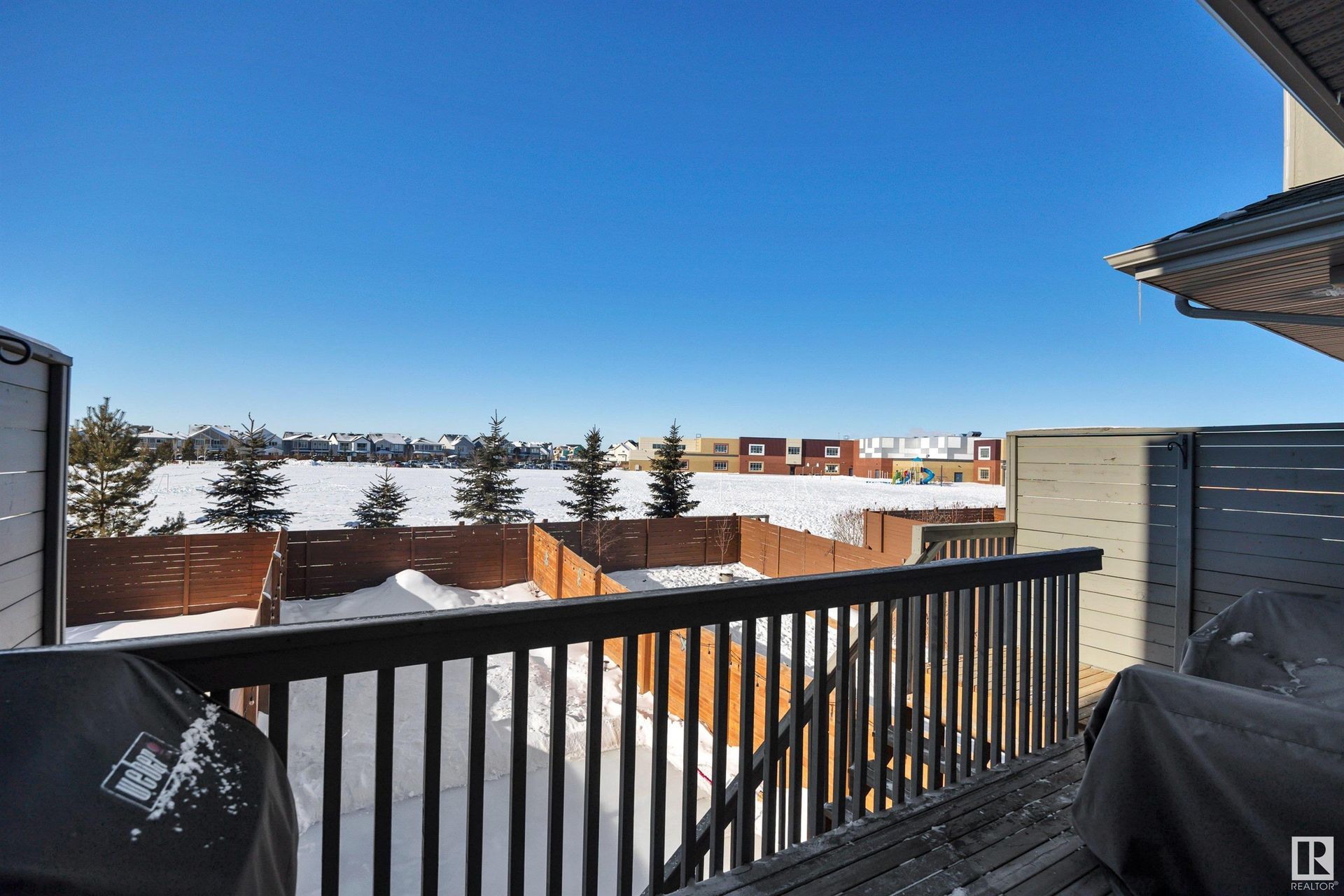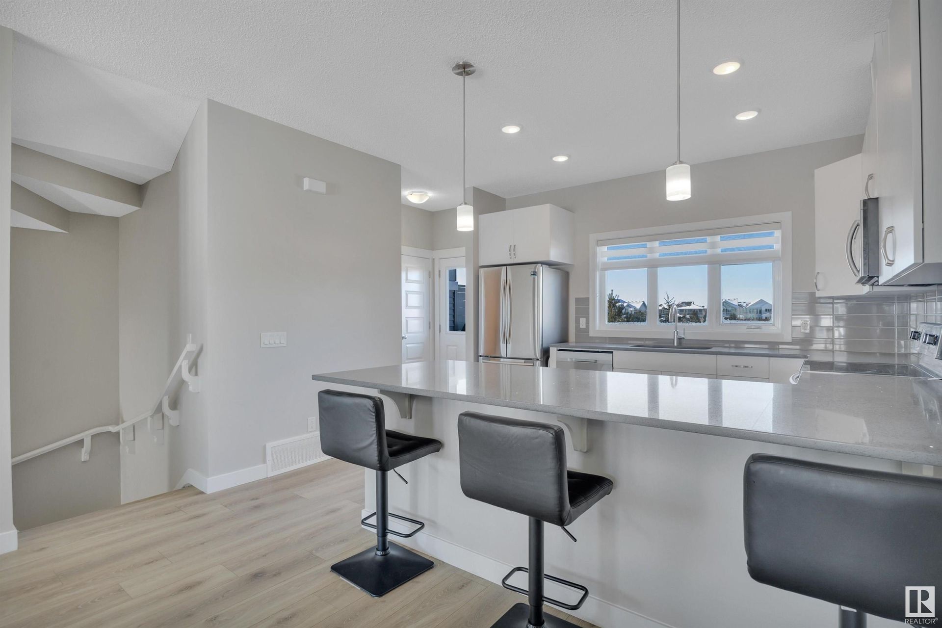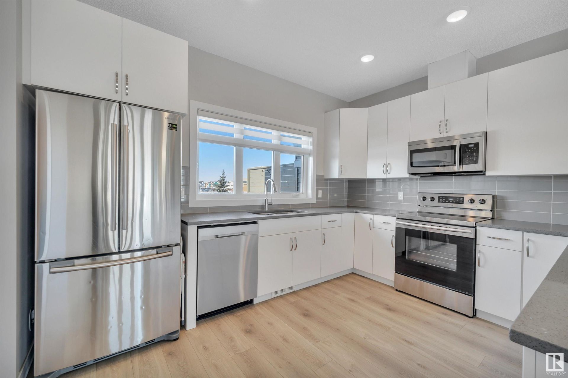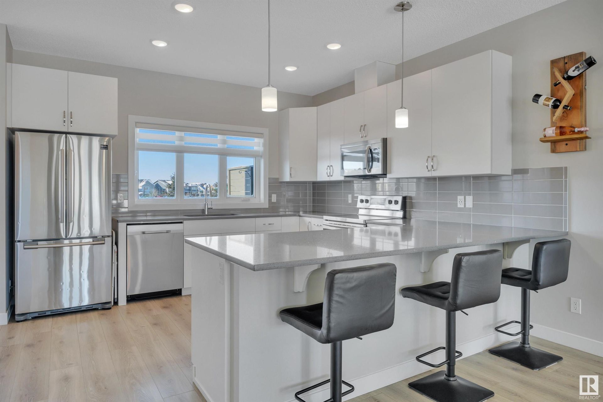 Welcome to Jensen Lakes! This stylish and air-conditioned townhouse backs a park and features 3 beds, 2.5 baths, and a double attached garage with ample storage. The family room, with an abundance of natural light, provides the perfect space to relax with the family. Enjoy cooking in your spacious kitchen with stainless steel appliances, quartz countertops, and extended counter space and storage. Beyond the kitchen, you’ll find your rear balcony with stairs to the lower level deck and spacious backyard. The upstairs features your primary suite with a walk-through closet and 3-piece ensuite, 2 additional bedrooms, a 4-piece bathroom, and your separate laundry room. With vinyl flooring, custom blinds, and 9' ceilings on the main floor, you'll appreciate the attention to detail and pride of ownership. Enjoy the perks of living in Jensen Lakes, including access to the beach, lake, and community programming. Located close to schools, parks, shopping, and restaurants, you'll be close to all the action.