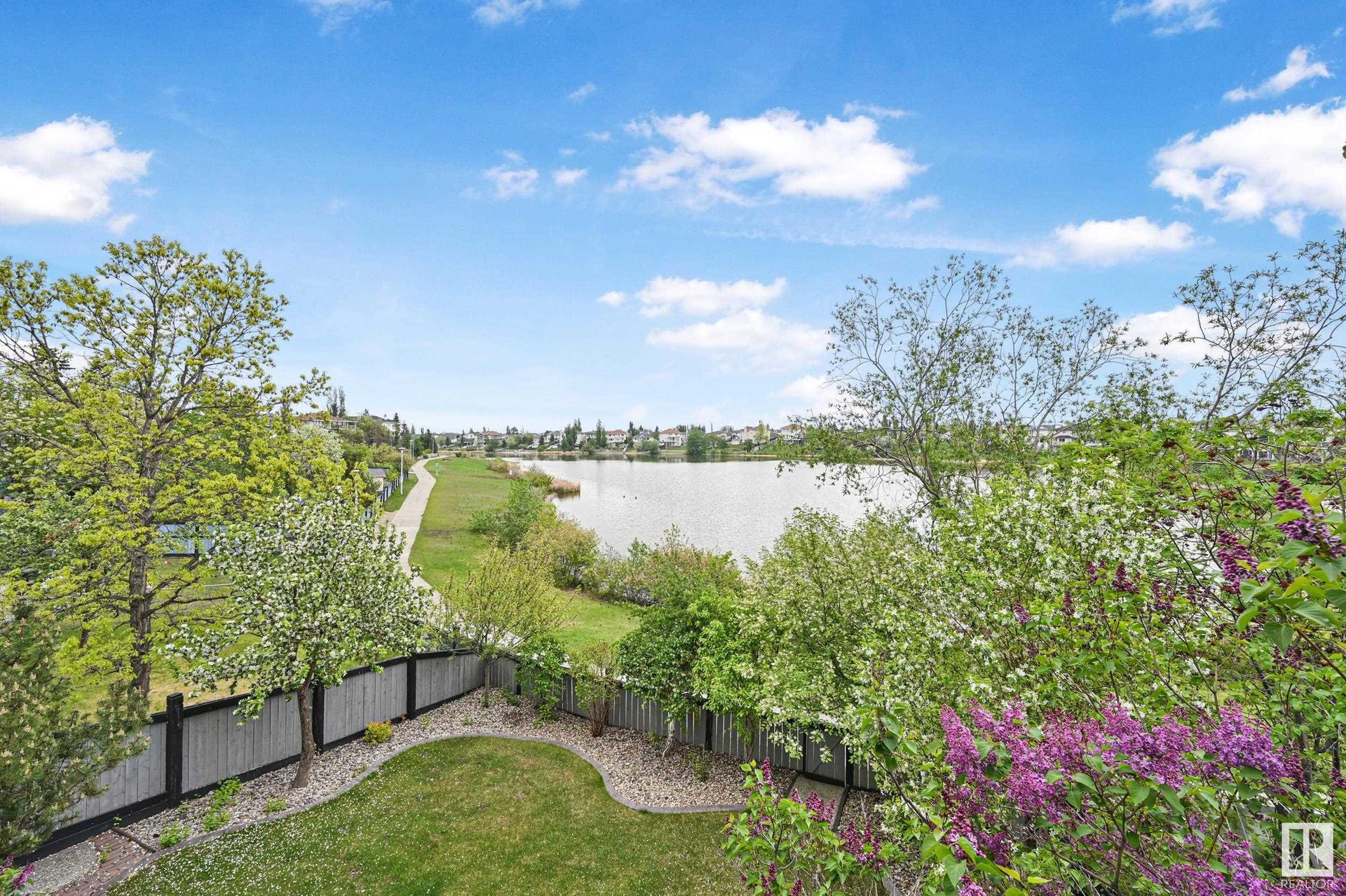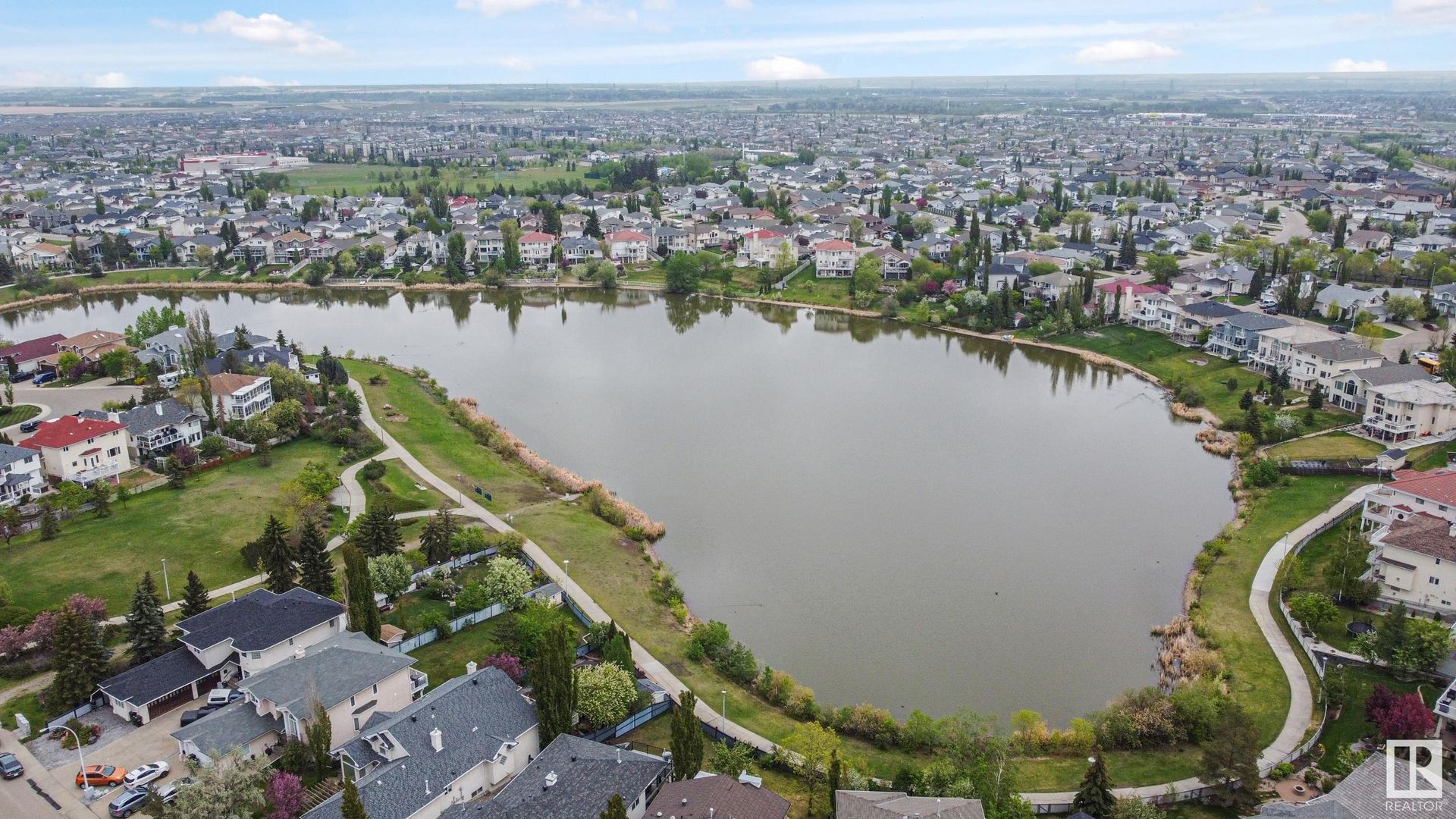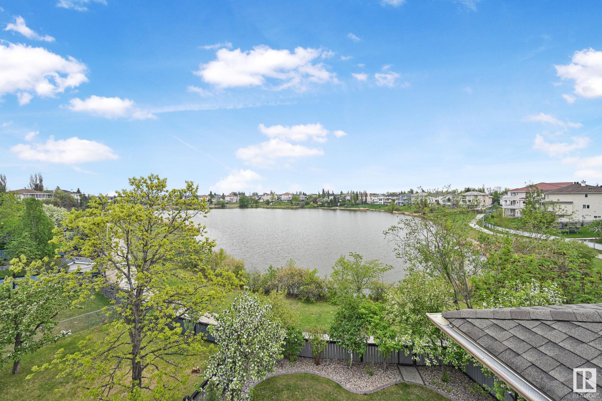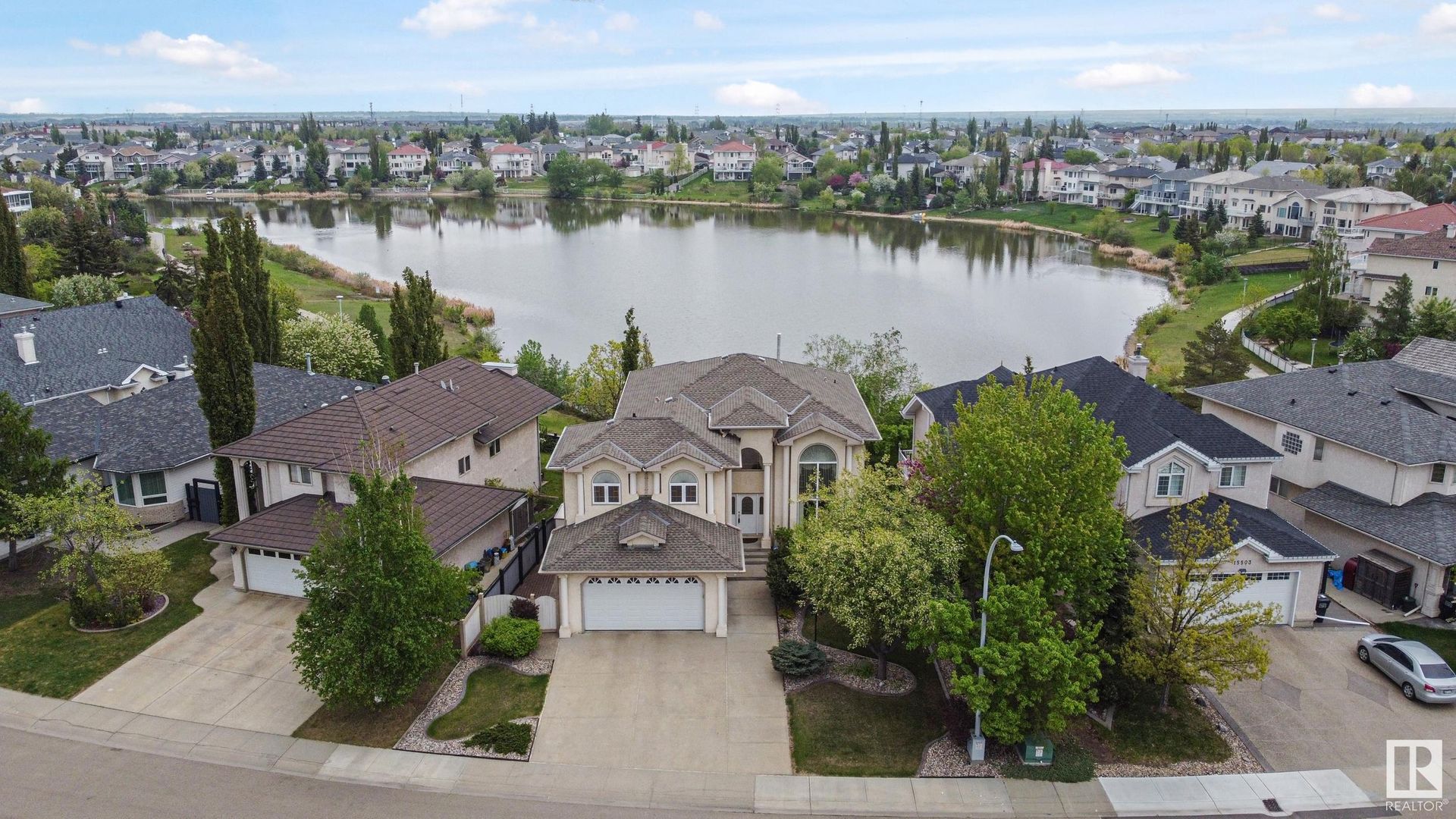 Stunning 2-story, 5bdrms, 4 Full bath Hollick Kenyon home backing onto the lake! Over 2800 sq ft on the upper levels, plus a fully developed walkout basement with 9-ft ceilings, 2 potential additional bedrooms, full bath, a rec area with a wet bar, & a covered patio. The main floor boasts formal living & dining rooms, family room with gas fireplace, & an office/bedroom with an adjacent full bath—ideal for multi-generational living. The kitchen features raised-panel wood cabinets, granite counters, & stainless steel appliances, including a gas stove. Upstairs, find 4 bdrms, including a massive primary suite with a Romeo & Juliet balcony, a large walk-in closet, & a quartz-countered ensuite. Enjoy the flex space/bonus area & another 4-piece bath on the upper level. The oversized, heated garage has a floor drain, man door to back, cabinets & sink. Features include dual furnaces, A/C, permanent Christmas lights, prof landscaping with irrigation & central vacuum. Close to schools, shopping, & lake trails.