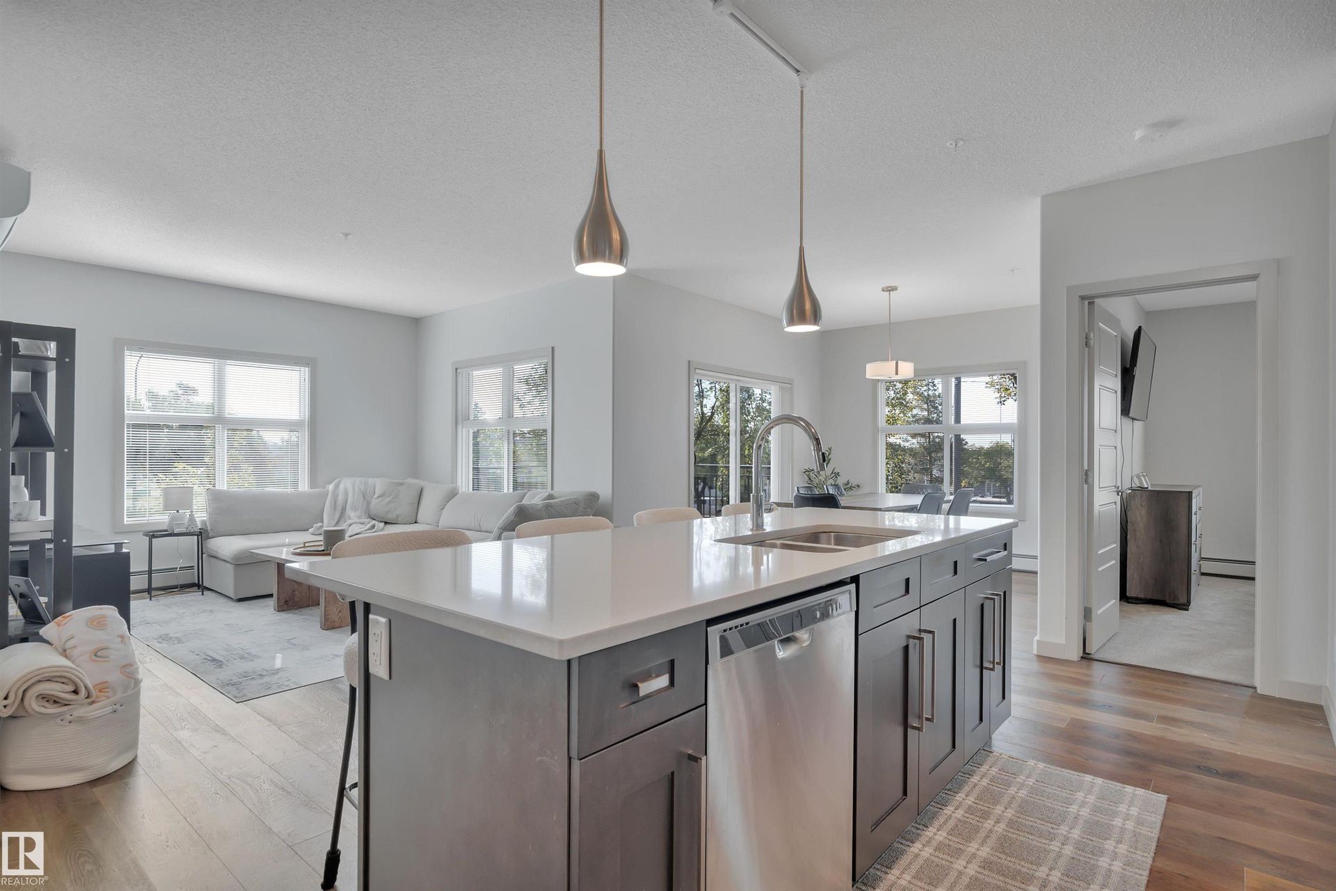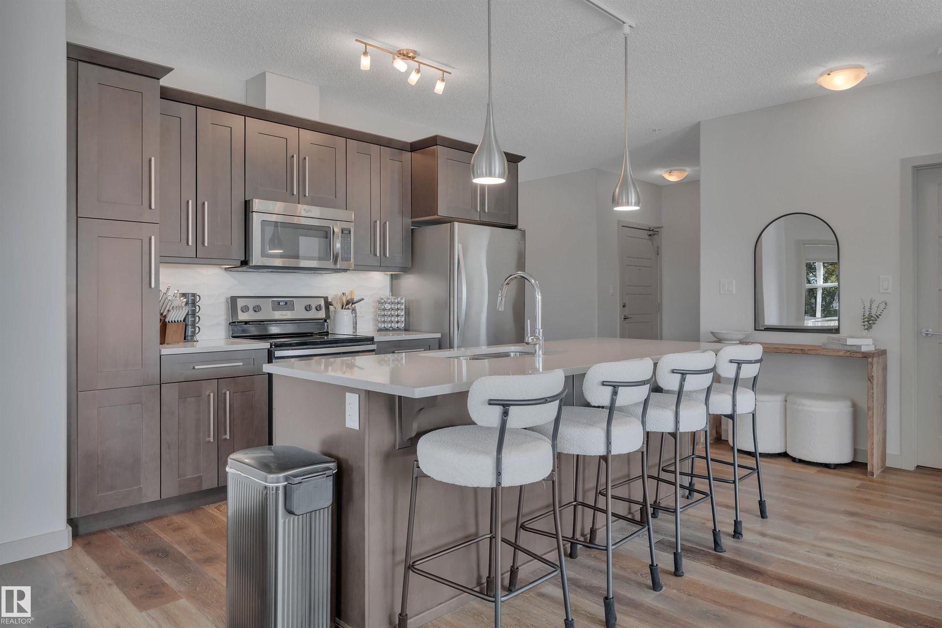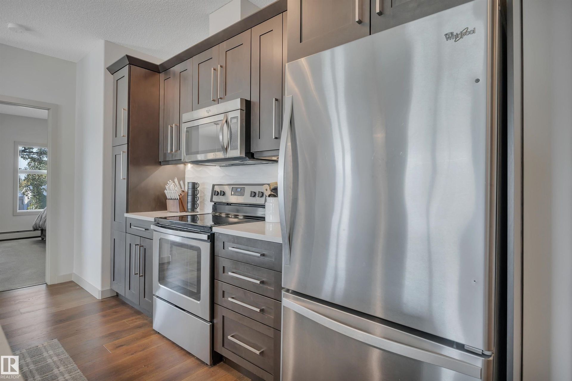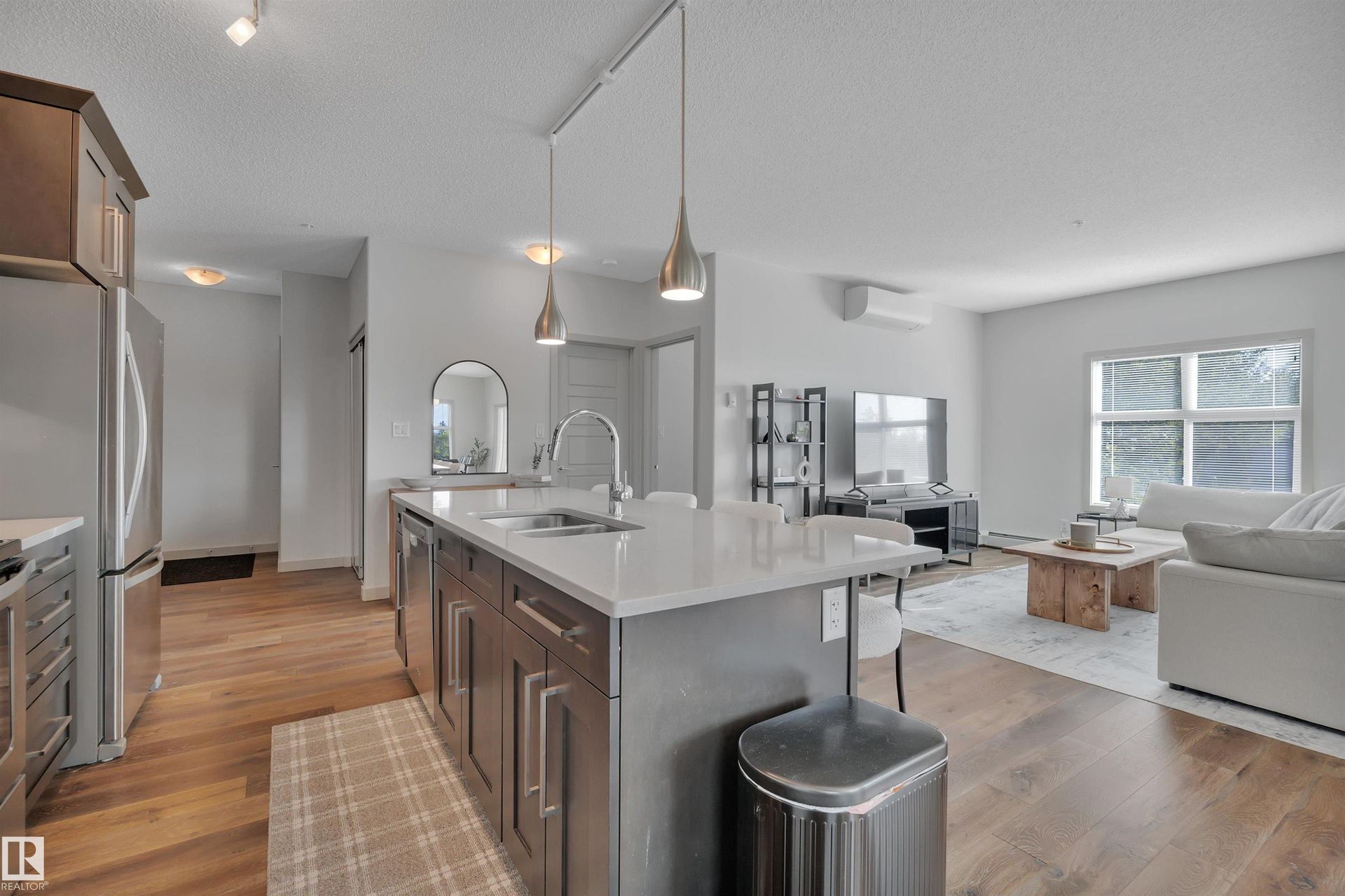 Welcome to Griesbach! Discover this stunning 2 bed / 2 bath + den corner suite in Valour II. This air-conditioned and meticulously maintained condo comes with 2 titled underground parking stalls and a storage cage. The open concept layout, 9' ceilings, large windows, and luxury vinyl flooring welcomes you into the bright main living space. The modern kitchen shines with stainless steel appliances, quartz countertops, and large pantry cupboard. Beyond the spacious living room lies your your SE-facing corner balcony. The primary suite includes a walk-through closet and 3-piece ensuite, while the second bedroom and 4-piece main bath are perfect for guests or a home office. Added conveniences include in-suite laundry and access to the fitness facility and party room. All this just steps away from public transit, walking trails, and the many new shops and restaurants of Griesbach. A must see!