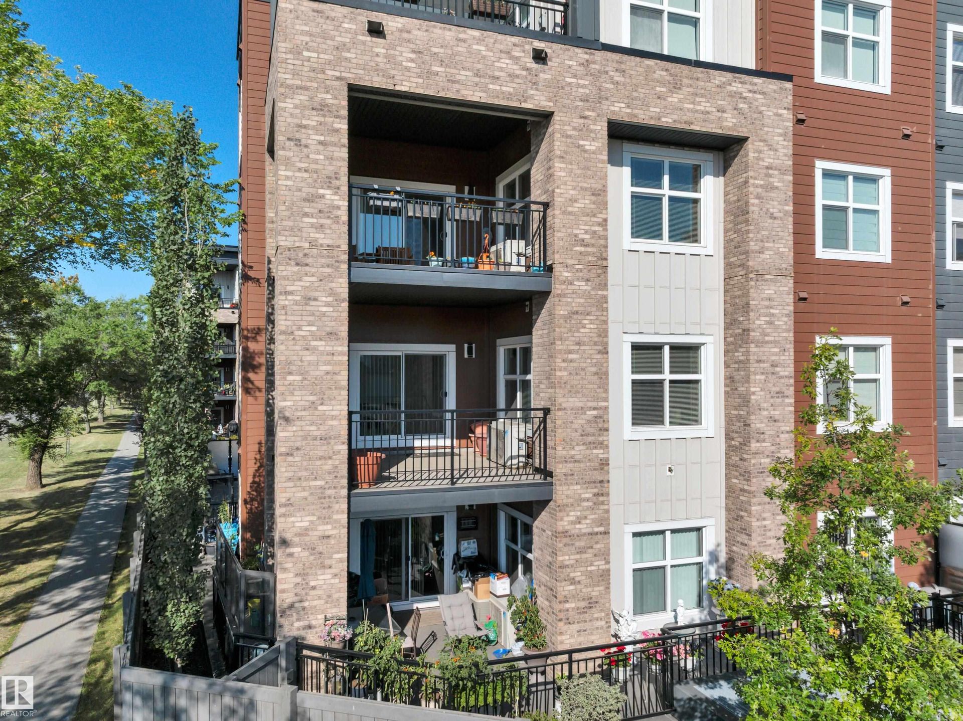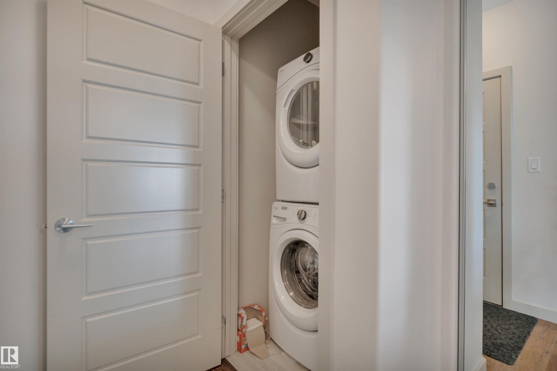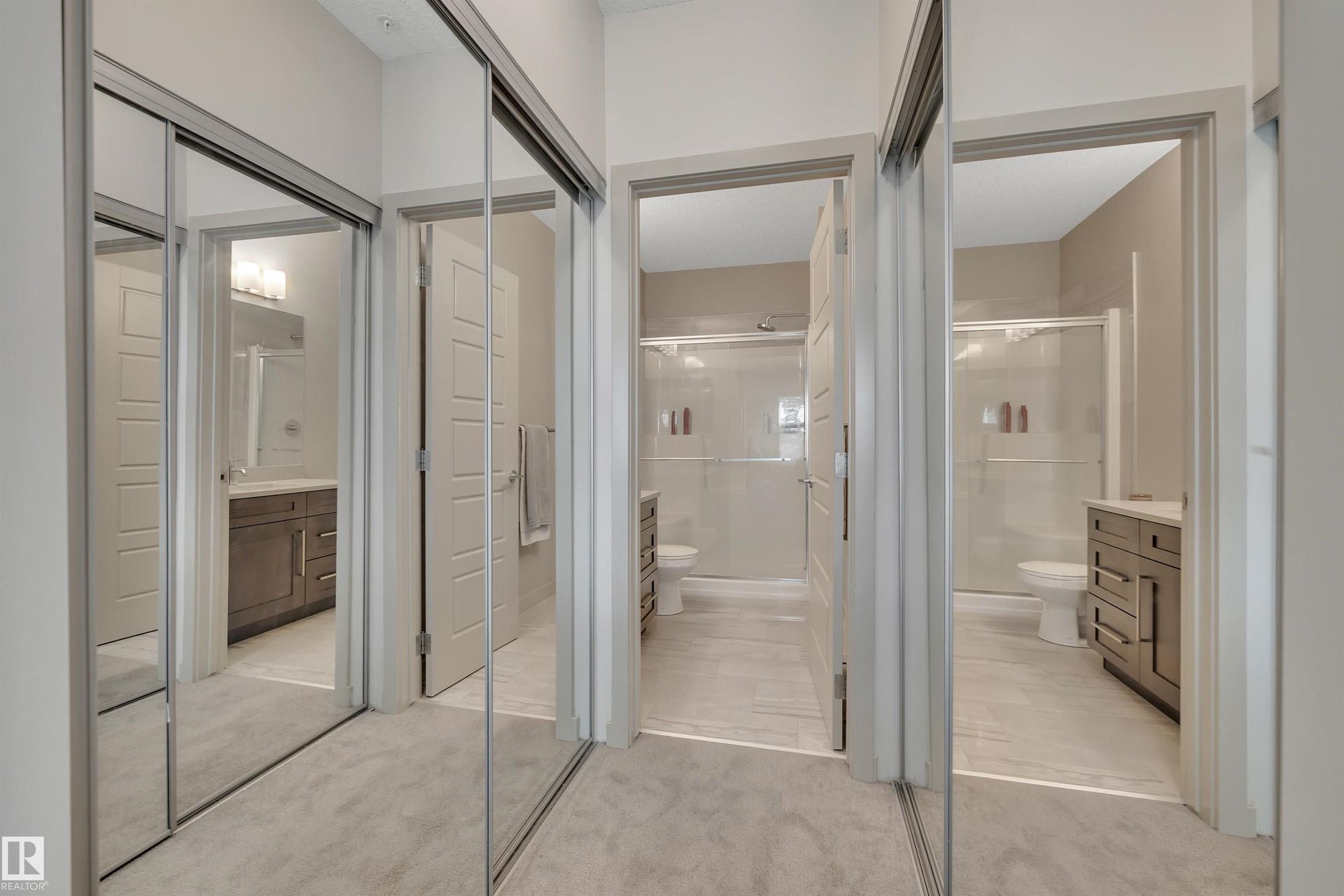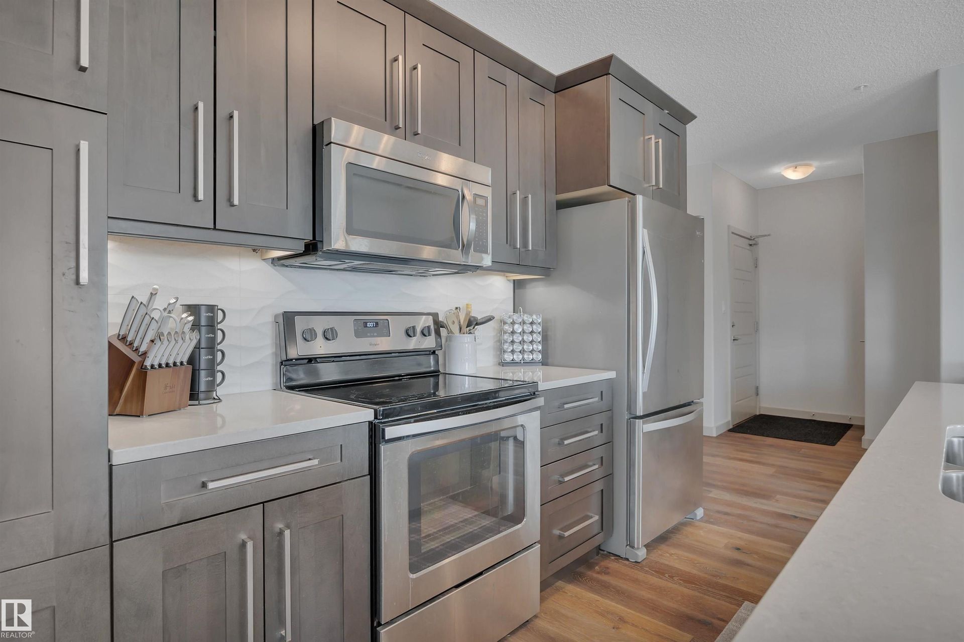 Welcome to Griesbach! Discover this stunning 2 bed / 2 bath + den corner suite in Valour II. This air-conditioned and meticulously maintained condo comes with 2 titled underground parking stalls and a storage cage. The open concept layout, 9' ceilings, large windows, and luxury vinyl flooring welcomes you into the bright main living space. The modern kitchen shines with stainless steel appliances, quartz countertops, and large pantry cupboard. Beyond the spacious living room lies your your SE-facing corner balcony. The primary suite includes a walk-through closet and 3-piece ensuite, while the second bedroom and 4-piece main bath are perfect for guests or a home office. Added conveniences include in-suite laundry and access to the fitness facility and party room. All this just steps away from public transit, walking trails, and the many new shops and restaurants of Griesbach. A must see!