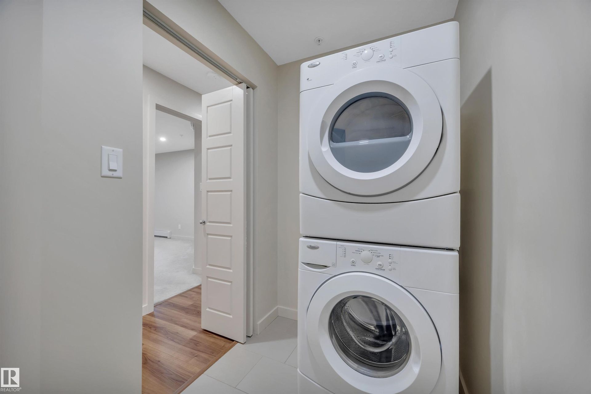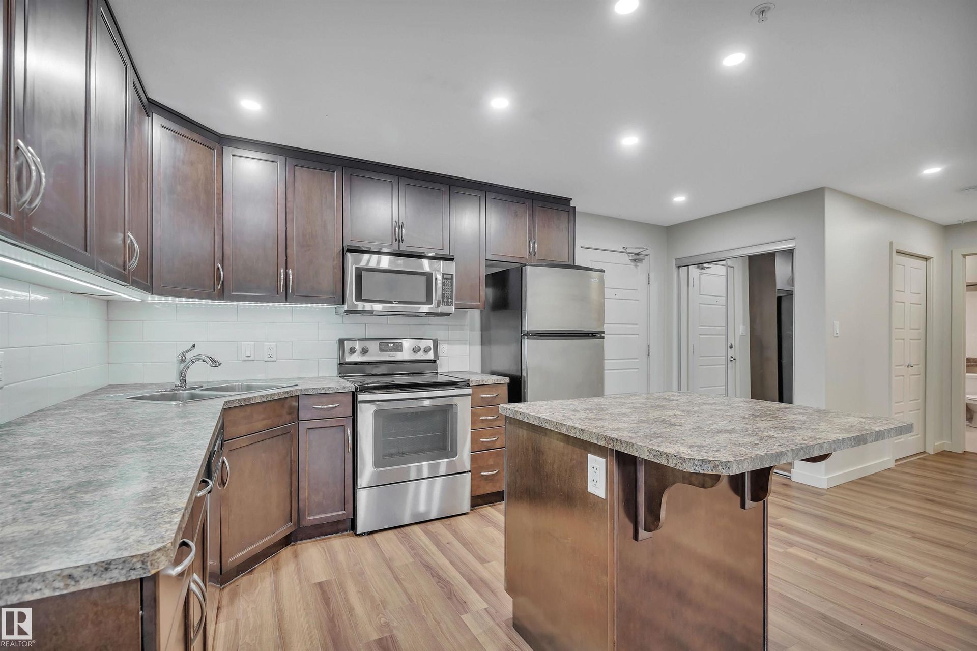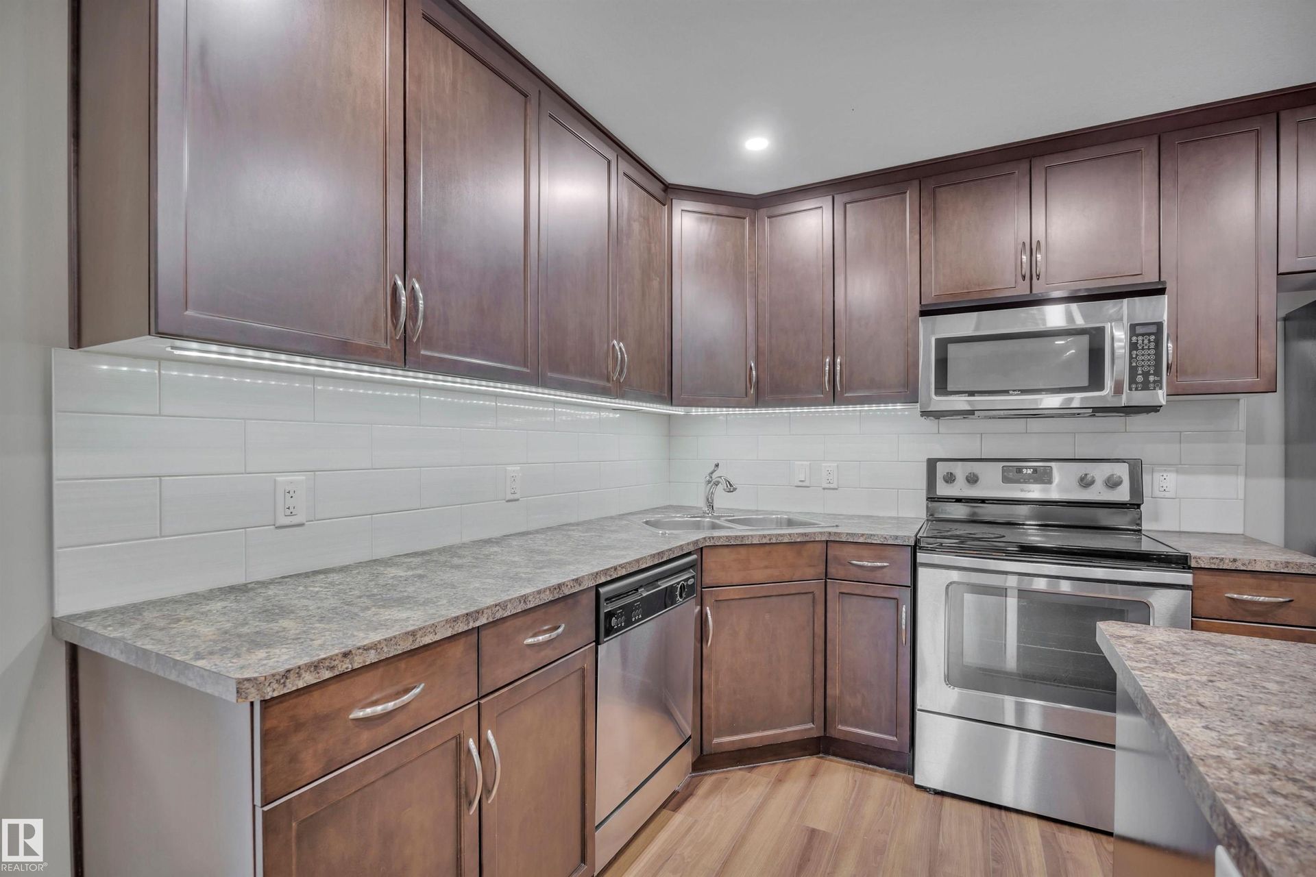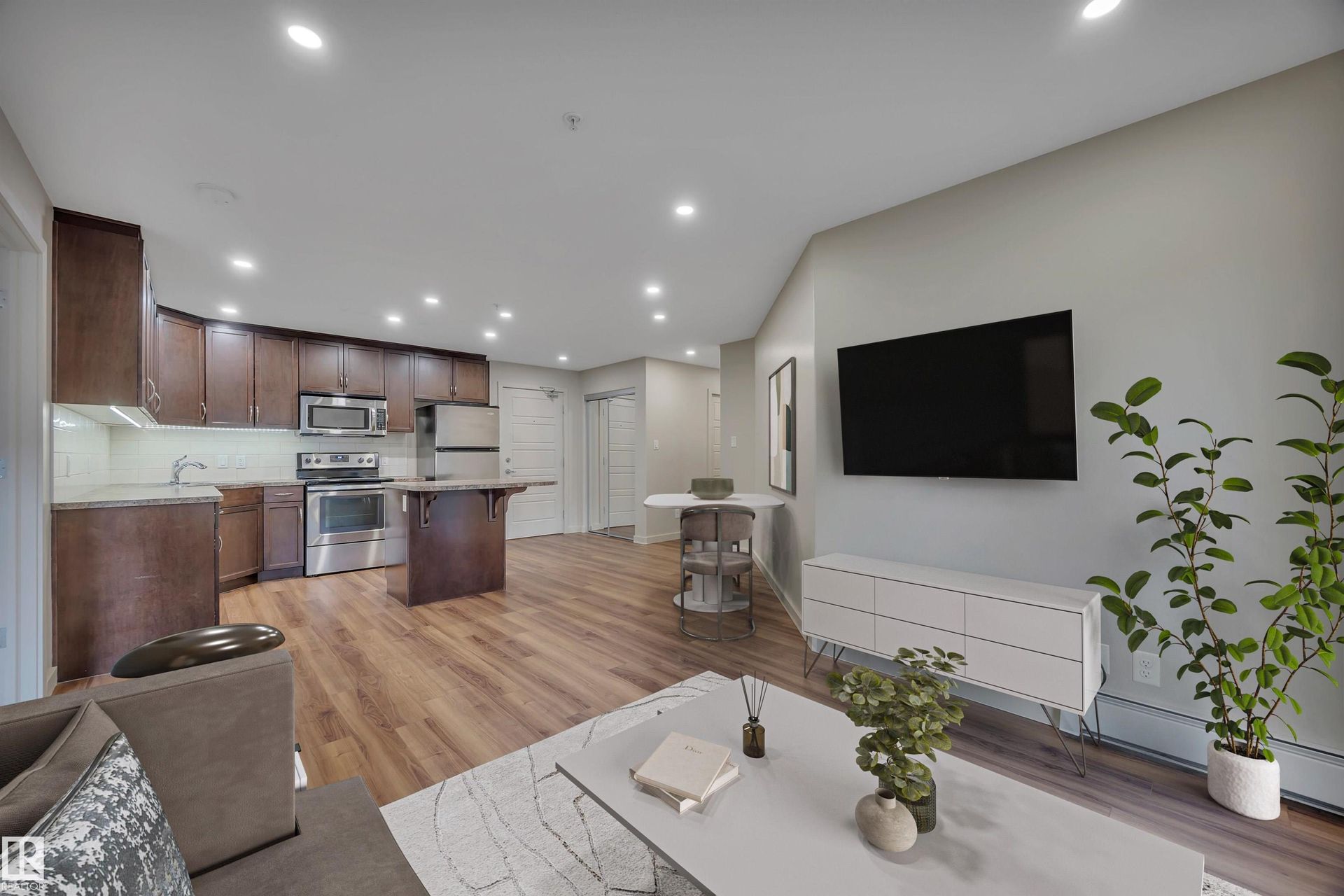 Welcome to Rutherford Gate! This updated and impeccably maintained 2 bedroom condo with underground parking is available for immediate possession. The spacious entryway welcomes you into the freshly painted open concept living space. Enjoy cooking in your stylish kitchen with newer stainless steel appliances and powered island. Relax with family and friends in the large living room and on the adjacent south-facing covered balcony... on the quiet side of the building. Your primary bedroom offers a 3-piece ensuite, while both bedrooms feature oversized walk-in closets. With over 20 pot lights added, the space truly shines. Convenience is key with the large storage room with in-suite laundry, gas line to BBQ, and storage cage. Take advantage of the building's fitness centre, social room, guest suite, and secure underground parking. You'll be in the middle of all the action with prime access to public transit, Anthony Henday, Windermere, and South Edmonton Common. Move-in ready. A must see!
