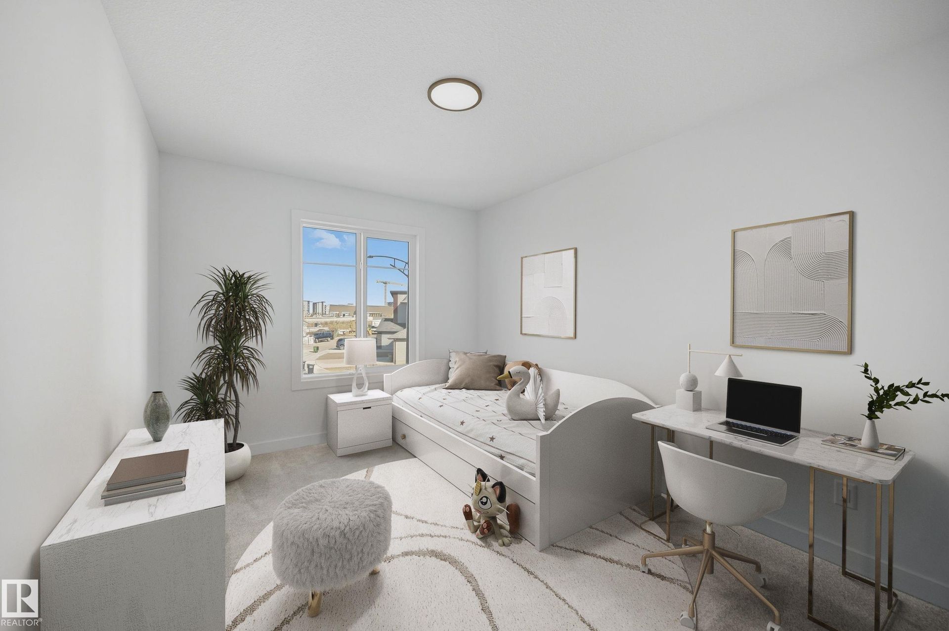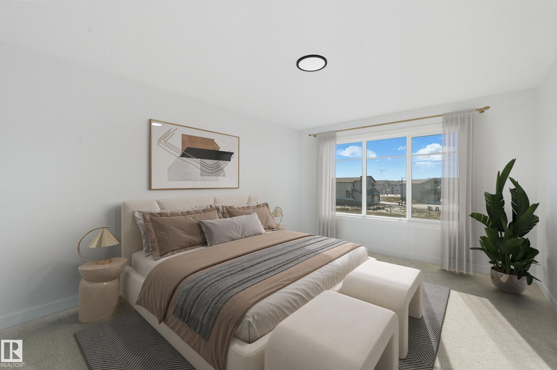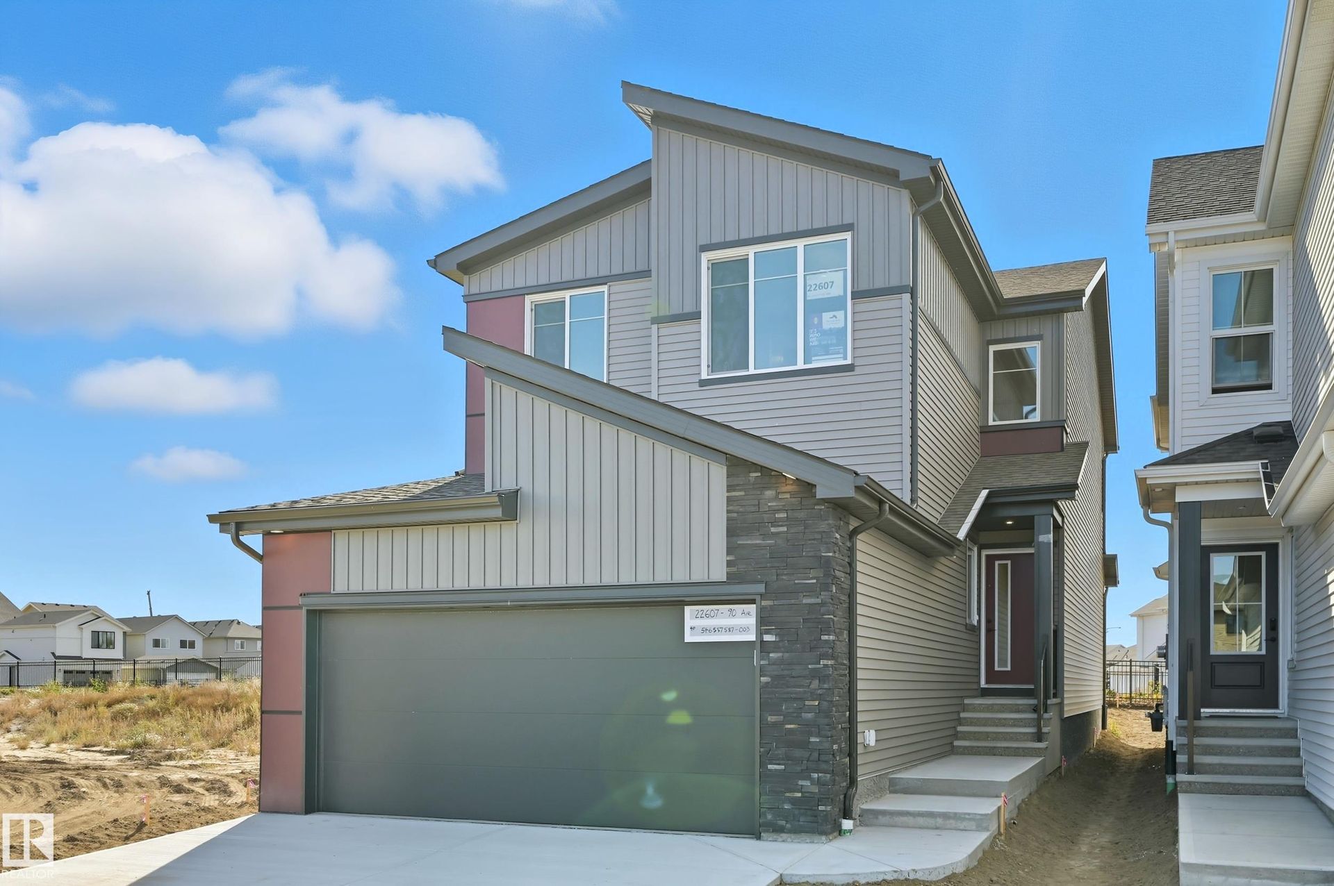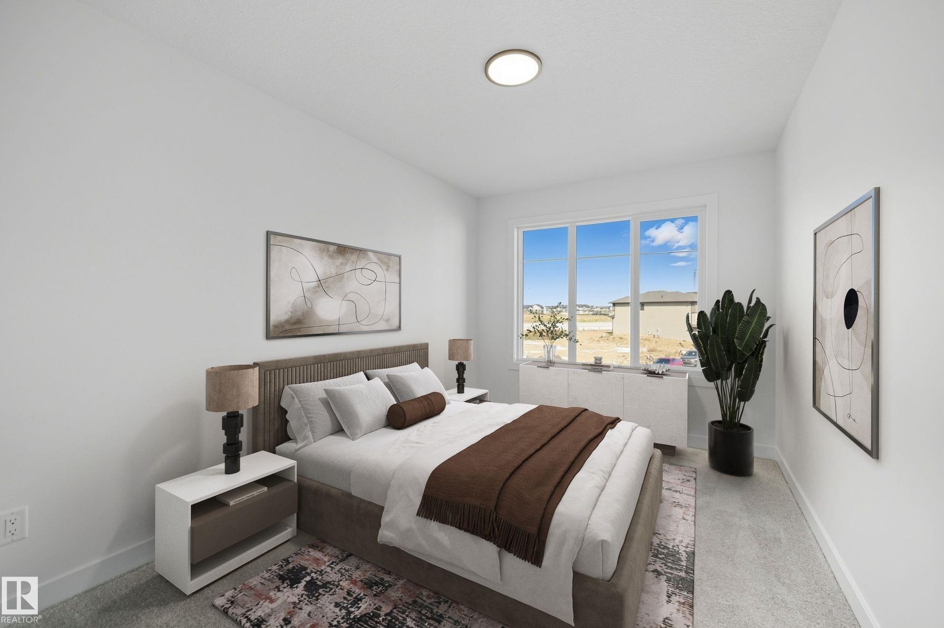 Welcome to the modified Evan, boasting 2,270 sq. ft. of thoughtfully designed living space & ideal backing SW on Greenspace. Versatile layout adapts seamlessly to your lifestyle, whether accommodating guests, office, or multi-generational living. Main floor bdrm with full bathroom, & a convenient side entrance that enhances potential for basement suite. Open-concept main floor where the kitchen shines with a large island, quartz countertops, & a walk-through pantry adjacent to the mudroom. This culinary space overlooks the dining nook & spacious great room, making it ideal for entertaining. Upper level opens to vaulted bonus room perfect for relaxing/play area. Primary suite is designed for rejuvenation, featuring a walk-in closet, spa-inspired ensuite with dual sinks, drop-in tub, & separate shower. Two more bdrms, each with walk-in closets, full bath, upstairs laundry. With 9' main & basement get that airy open feeling. Convenient access to amenities, schools, parks, & the nearby Lewis Farms Rec Centre!