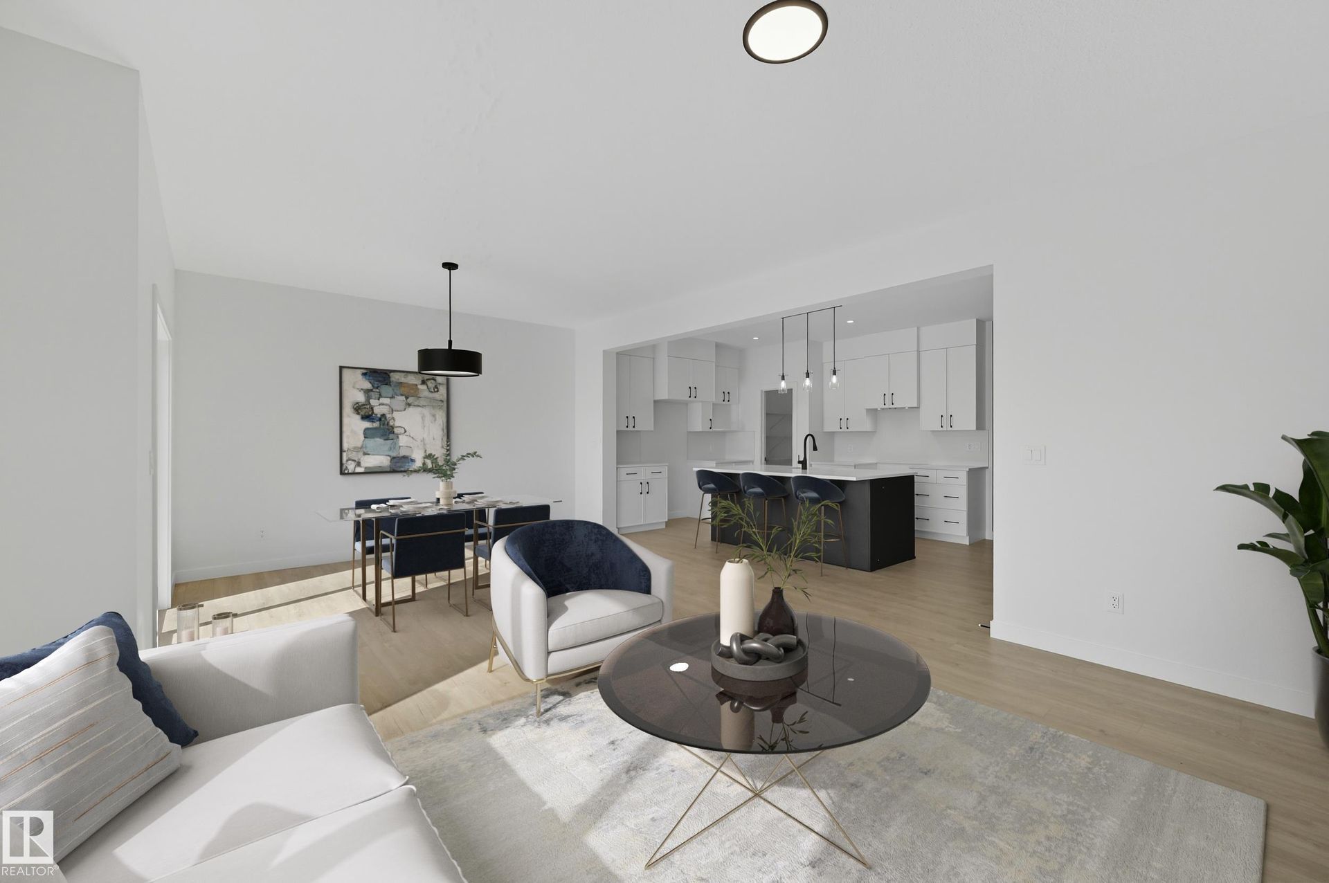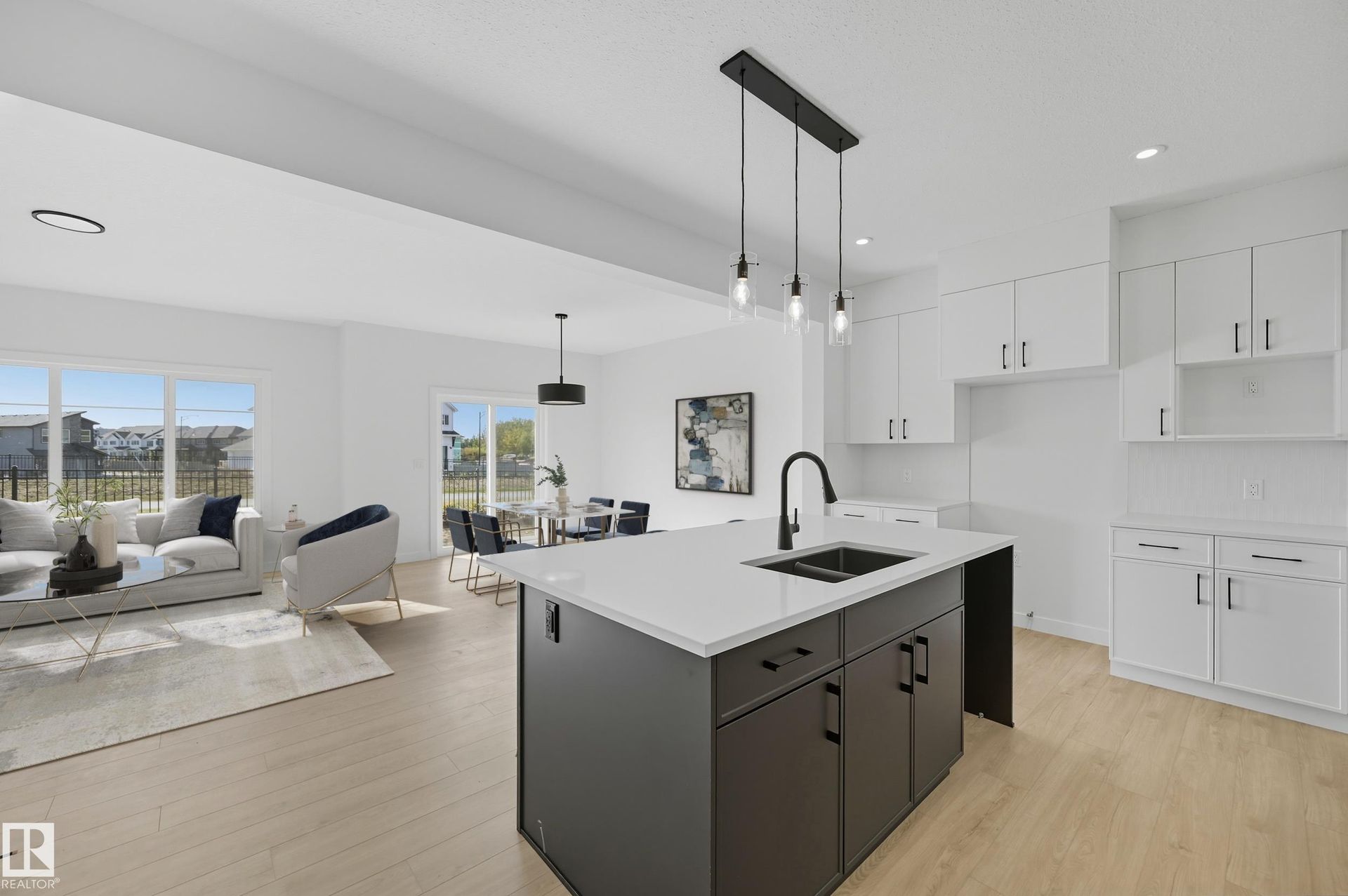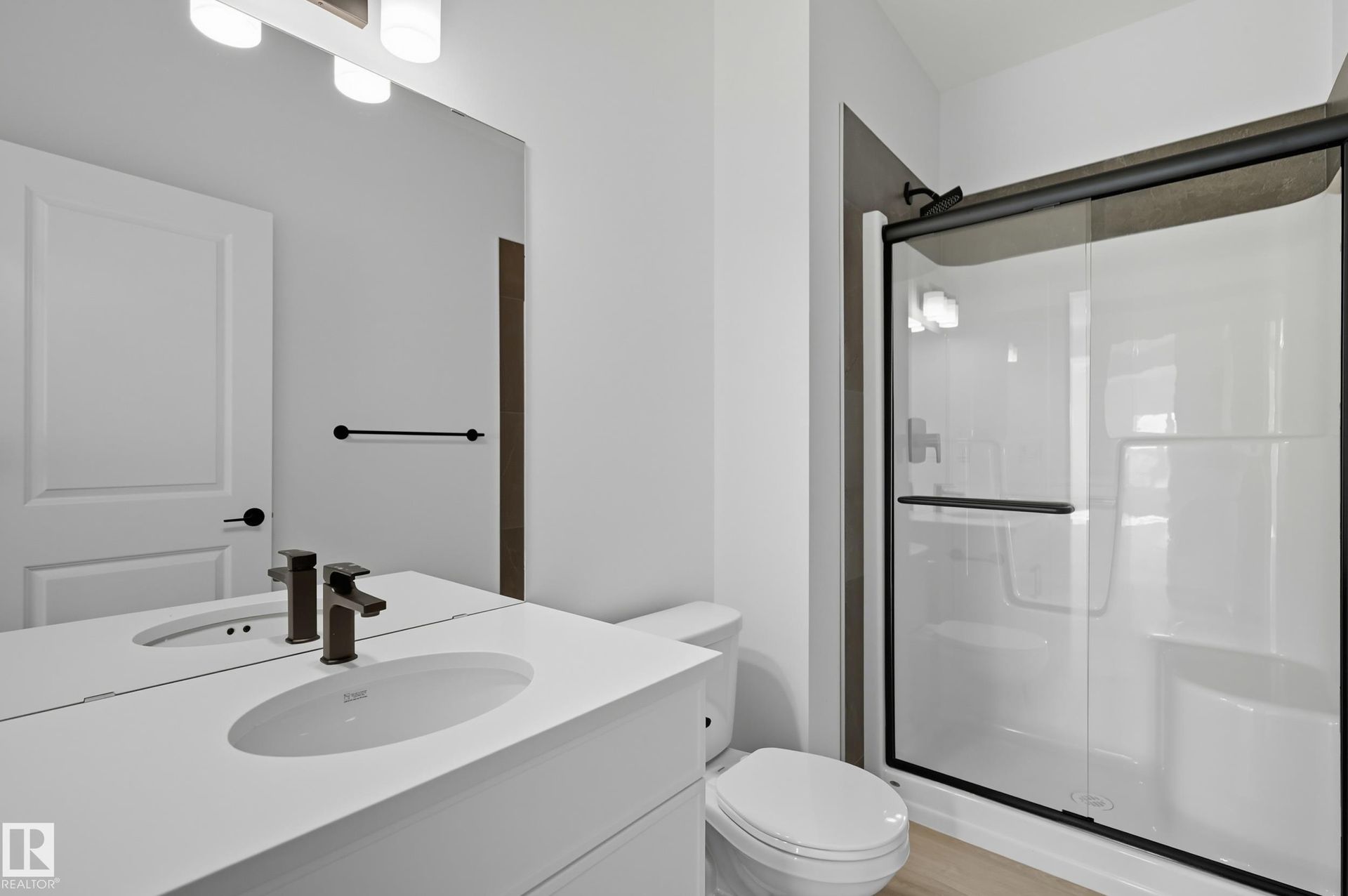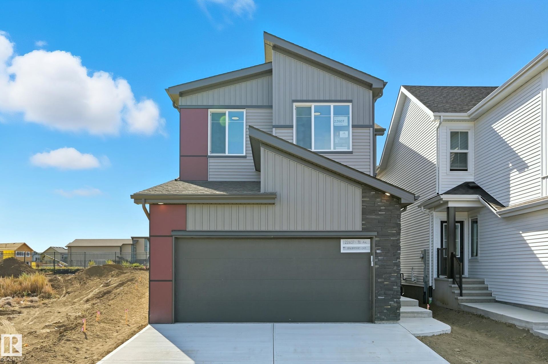 Welcome to the modified Evan, boasting 2,270 sq. ft. of thoughtfully designed living space & ideal backing SW on Greenspace. Versatile layout adapts seamlessly to your lifestyle, whether accommodating guests, office, or multi-generational living. Main floor bdrm with full bathroom, & a convenient side entrance that enhances potential for basement suite. Open-concept main floor where the kitchen shines with a large island, quartz countertops, & a walk-through pantry adjacent to the mudroom. This culinary space overlooks the dining nook & spacious great room, making it ideal for entertaining. Upper level opens to vaulted bonus room perfect for relaxing/play area. Primary suite is designed for rejuvenation, featuring a walk-in closet, spa-inspired ensuite with dual sinks, drop-in tub, & separate shower. Two more bdrms, each with walk-in closets, full bath, upstairs laundry. With 9' main & basement get that airy open feeling. Convenient access to amenities, schools, parks, & the nearby Lewis Farms Rec Centre!