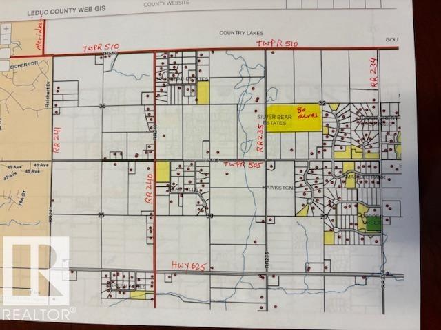 Opportunity is knocking, PRIME LOCATION! If you are looking for a prime developable country residential land then this is what is. Excellent parcel 80 acres, already zoned for country residential development. There are dozens of other already developed country residential subdivisions in this area. There may be possible to approve up to 25 lots. Subdivision from Leduc County. But the buyer and or owner need to apply to the county for their country residential subdivision. Conveniently located between Eagle Rock Golf Course Coloniale Golf Course. Only about 2 miles east of City of Beaumont. Only a few minutes from the southern boundary of City of Edmonton. 15 minutes to Edmonton International Airport. Easy access to Hwy 625, Hwy 21.