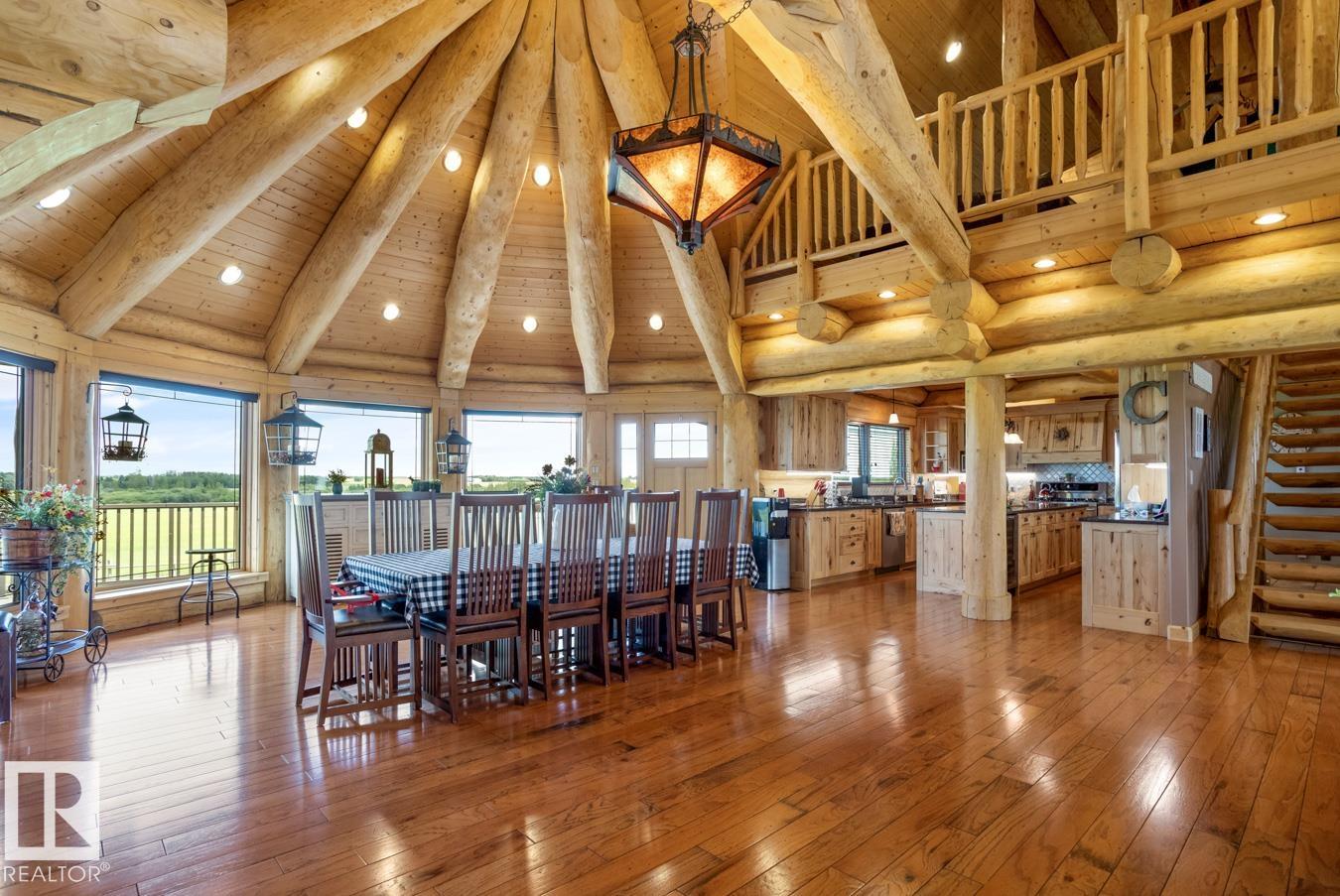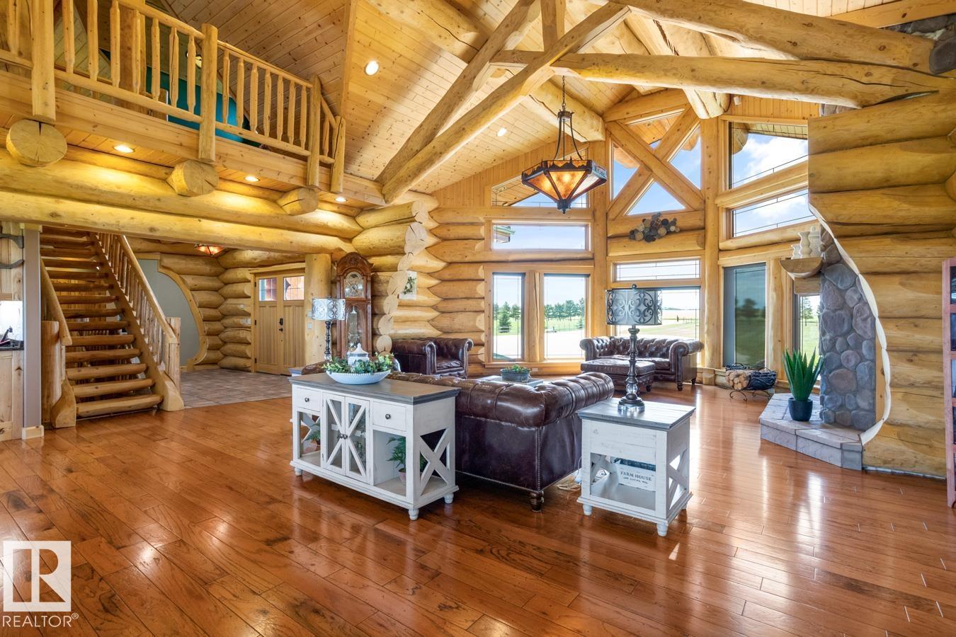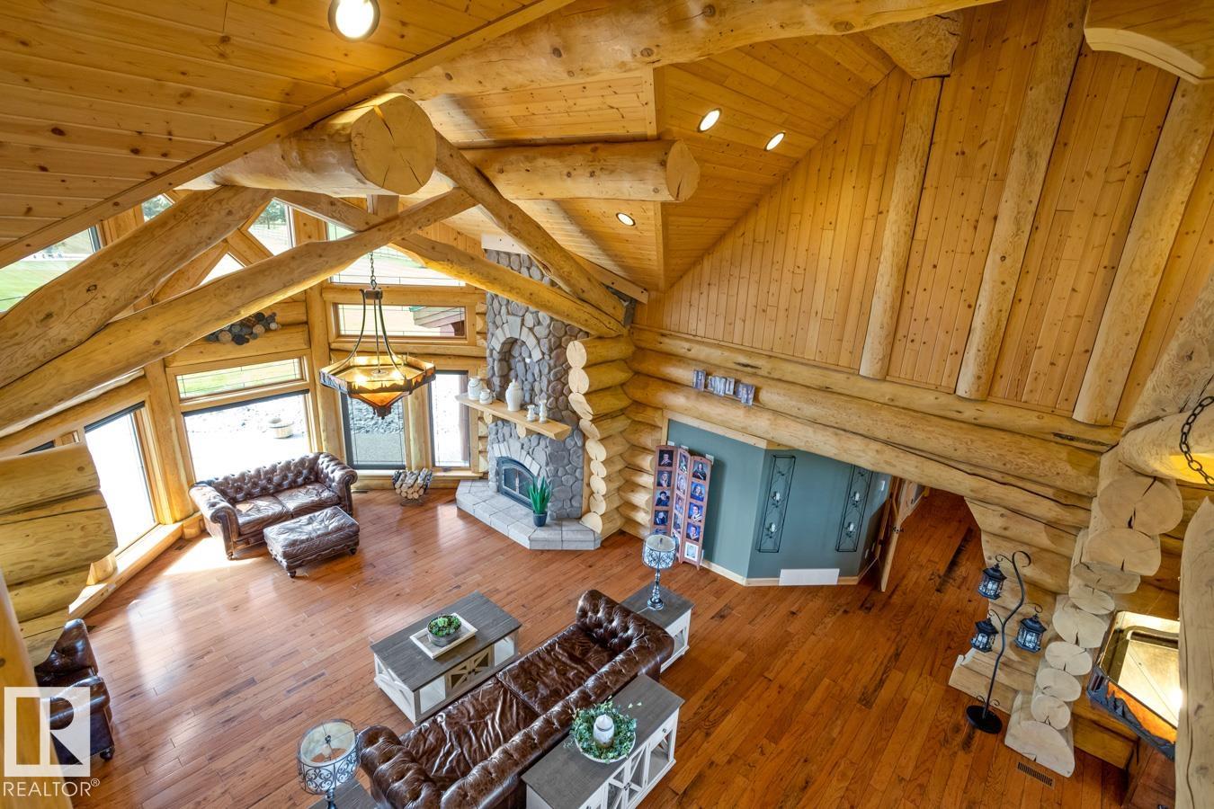 LOG WALK-OUT BUNGALOW nestled on a sprawling 12.31 ACRE ESTATE 33 km S of Edmonton, AB. The 4-bed/4-bath home features 7,818 sqft of TOTAL living space w/ 3 CAR GARAGE & huge 100'x60' SHOP (4 x 14' doors, heat & water). Inside, the great room impresses w/ VAULTED OPEN-BEAM CEILINGS & a stunning STONE FP, flowing into a MASSIVE DINING AREA perfect for entertaining. The chef's kitchen boasts a huge GRANITE ISLAND, S/S APPLIANCES (gas stove), & abundant CABINETRY & countertops. The massive primary suite features a LOFT, a luxurious 4 pc ENSUITE, & a separate bathtub room. Additional highlights include a spacious SUNROOM, 2nd LOFT w/ a maint-free UPPER DECK, NEW A/C, NEW BOILER, fresh exterior stain, ICF FOUNDATION & lots of storage. The basement hosts a HUGE REC ROOM w/ in-flr heat, bar, stone FP, WALK-OUT PATIO, 3 bedrooms, & 2 baths. The estate is completed w/ landscaped yard, Stone firepit, log shed, PAVED DRIVEWAY, fence, tree-lined road & approx 5 acres of FARMLAND, ensuring privacy & tranquility.