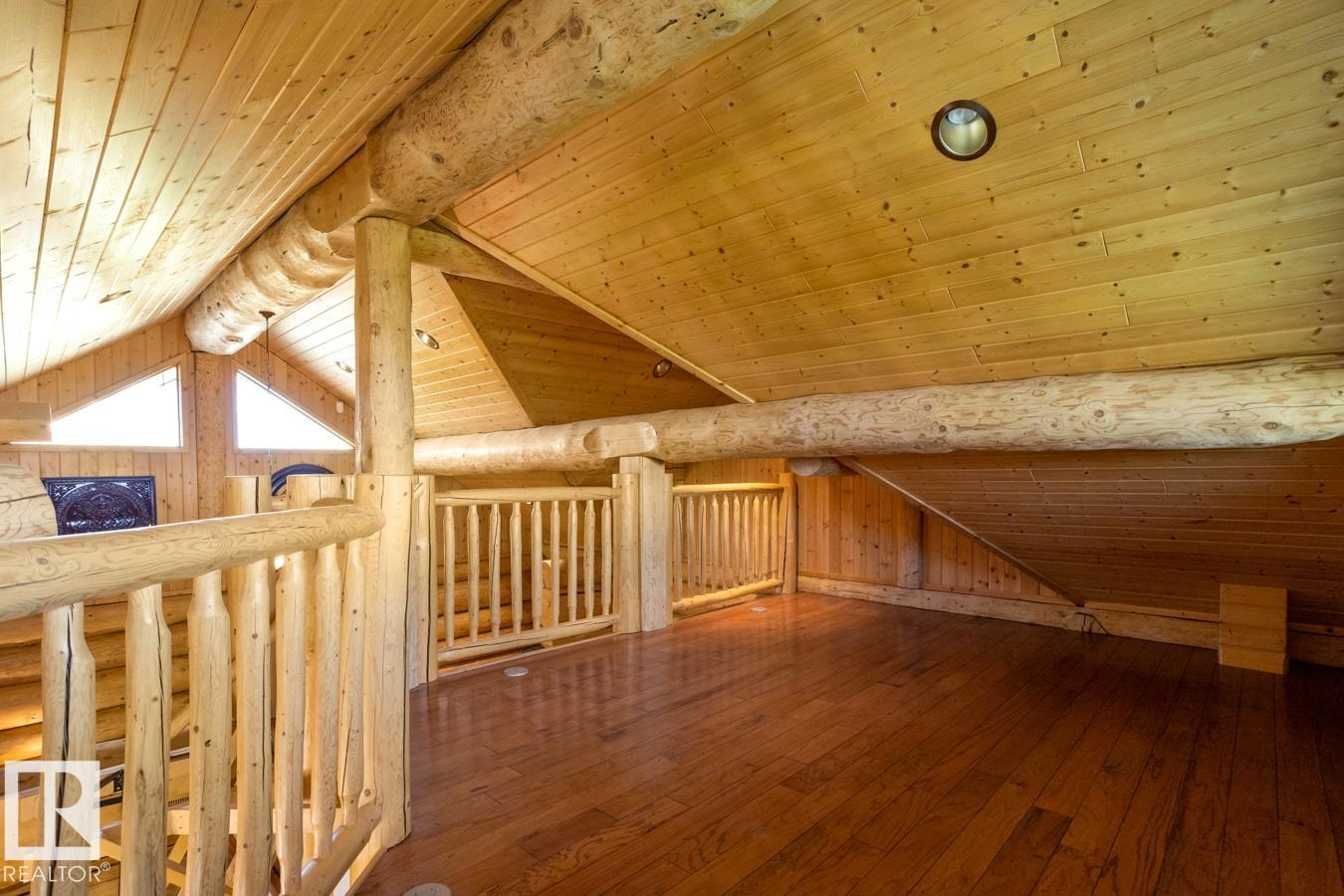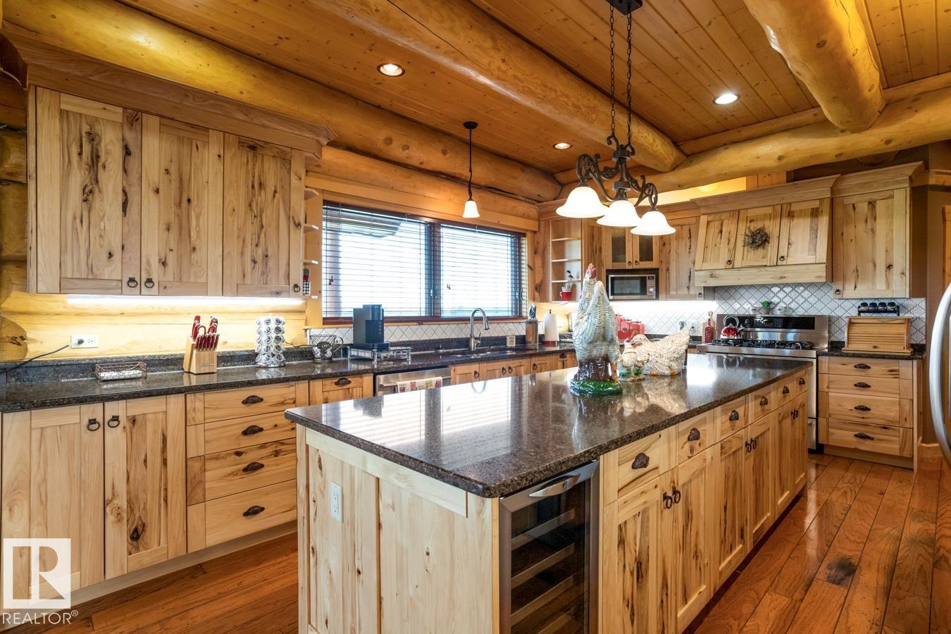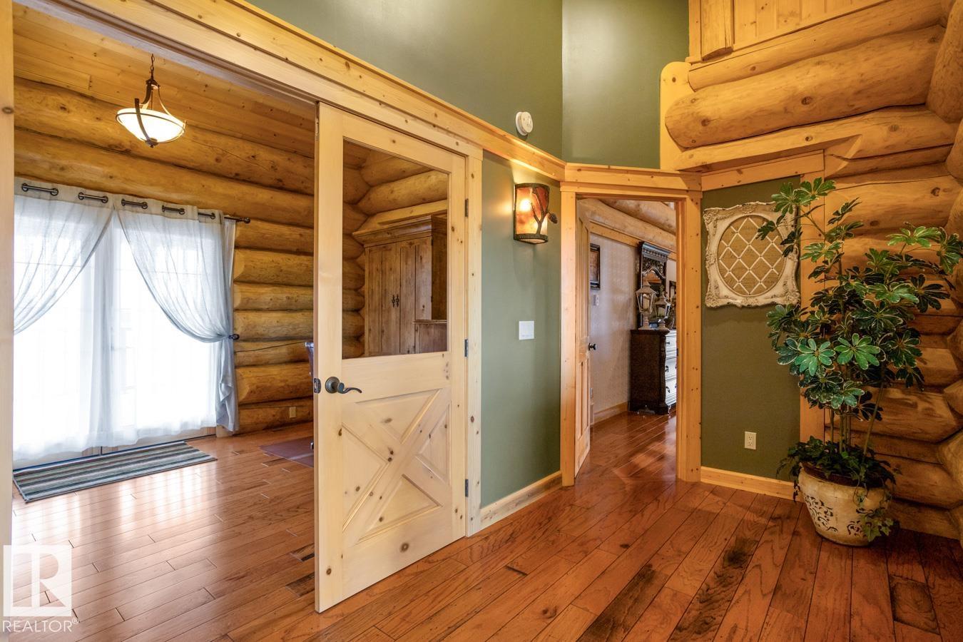 LOG WALK-OUT BUNGALOW nestled on a sprawling 12.31 ACRE ESTATE 33 km S of Edmonton, AB. The 4-bed/4-bath home features 7,818 sqft of TOTAL living space w/ 3 CAR GARAGE & huge 100'x60' SHOP (4 x 14' doors, heat & water). Inside, the great room impresses w/ VAULTED OPEN-BEAM CEILINGS & a stunning STONE FP, flowing into a MASSIVE DINING AREA perfect for entertaining. The chef's kitchen boasts a huge GRANITE ISLAND, S/S APPLIANCES (gas stove), & abundant CABINETRY & countertops. The massive primary suite features a LOFT, a luxurious 4 pc ENSUITE, & a separate bathtub room. Additional highlights include a spacious SUNROOM, 2nd LOFT w/ a maint-free UPPER DECK, NEW A/C, NEW BOILER, fresh exterior stain, ICF FOUNDATION & lots of storage. The basement hosts a HUGE REC ROOM w/ in-flr heat, bar, stone FP, WALK-OUT PATIO, 3 bedrooms, & 2 baths. The estate is completed w/ landscaped yard, Stone firepit, log shed, PAVED DRIVEWAY, fence, tree-lined road & approx 5 acres of FARMLAND, ensuring privacy & tranquility.