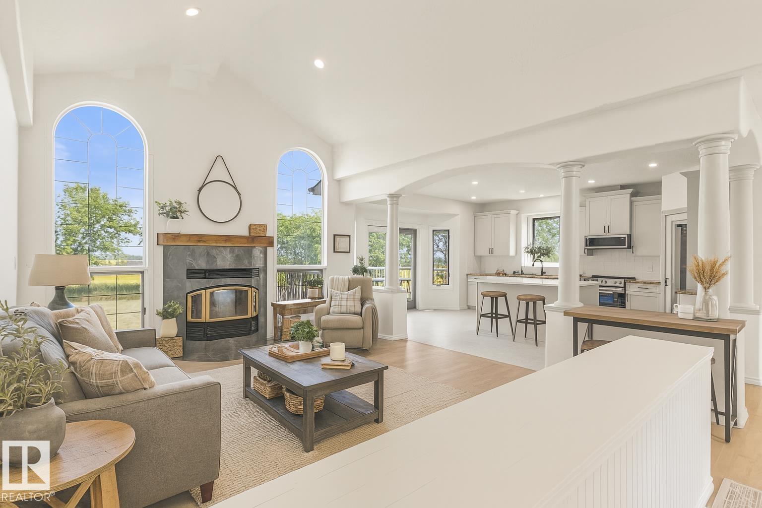 Experience peaceful country living with upscale comfort! Situated on 2.47 beautifully treed acres in Sturgeon County, this tastefully updated bungalow offers over 2,100 sq ft on the main floor plus a legal 1,850 sq ft basement suite—ideal for multigenerational living or supplemental income. The freshly renovated kitchen features quartz counters, a center island with bar seating, S/S appliances & a corner pantry, while the vaulted living room w/ a wood burning fireplace & elegant arched windows bring in natural light & picturesque views. The main level includes a large primary bedroom w/ a 4-pc ensuite, 2 additional bdrms, 4-pc bath & a bright south facing sunroom surrounded by windows. The basement adds 2 more bdrms, a 2nd kitchen & a massive rec room. Outside, a large 4+ car garage/shop with 10’ doors & side kitchen provides all the room you need for toys, tools, or a home business + a greenhouse w/ heat & power. Minutes to St. Albert & Edmonton, this ideal property blends privacy, practicality & charm