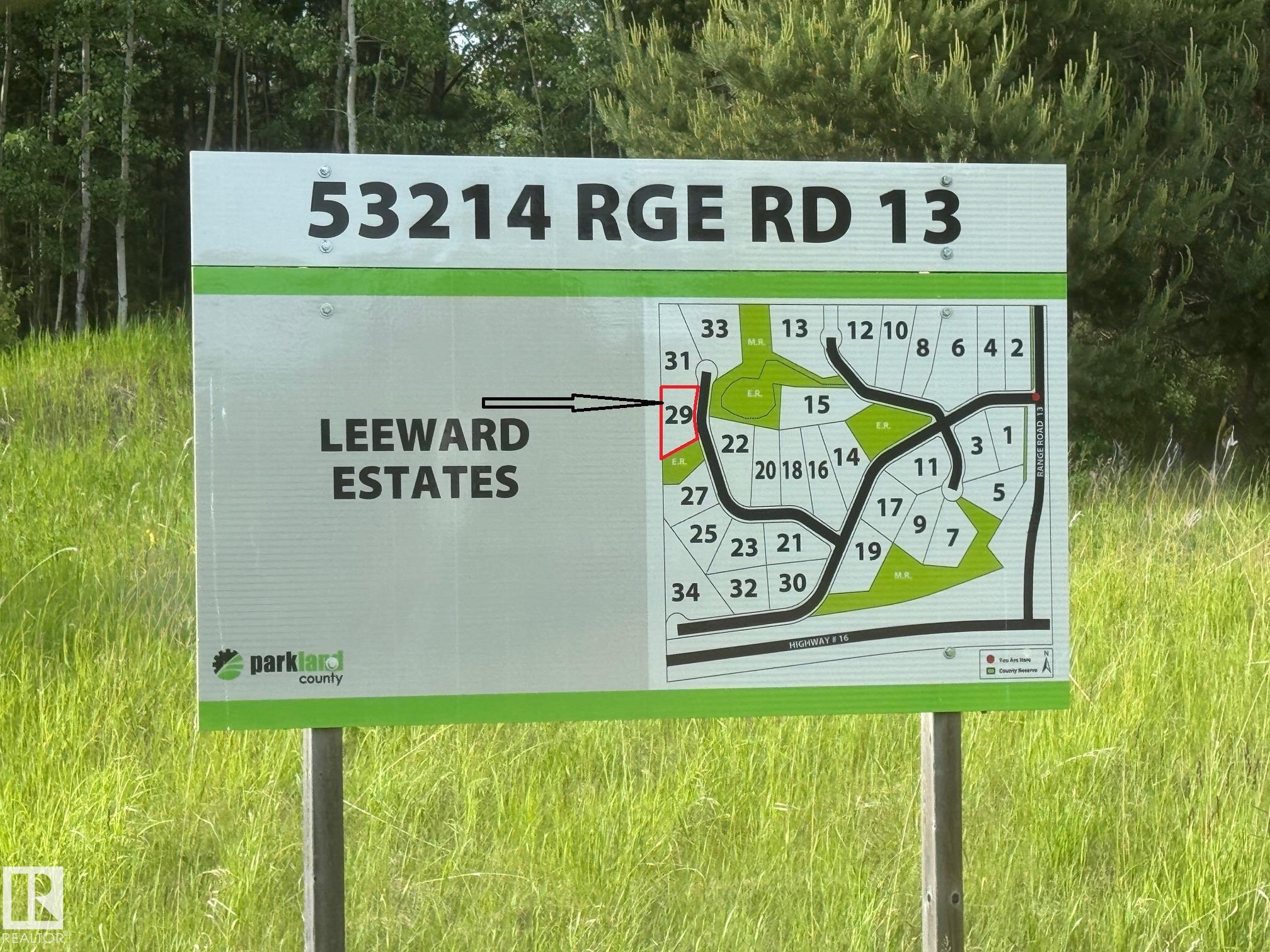 LEEWARD ESTATES .. Range Road 13 ,, just north of Hwy 16 ,, west of Stony Plain ,, LOT 29 is a 2.01 Acre opportunity .. Paved Roads to Property .. Cleared Property … Varied Building options ,, Gas & Power @ Property Line ,, Cistern & Septic System New Owner Responsibility ,, Leeward Estates, in Parkland County, west of Stony Plain. Purchase Price Plus GST