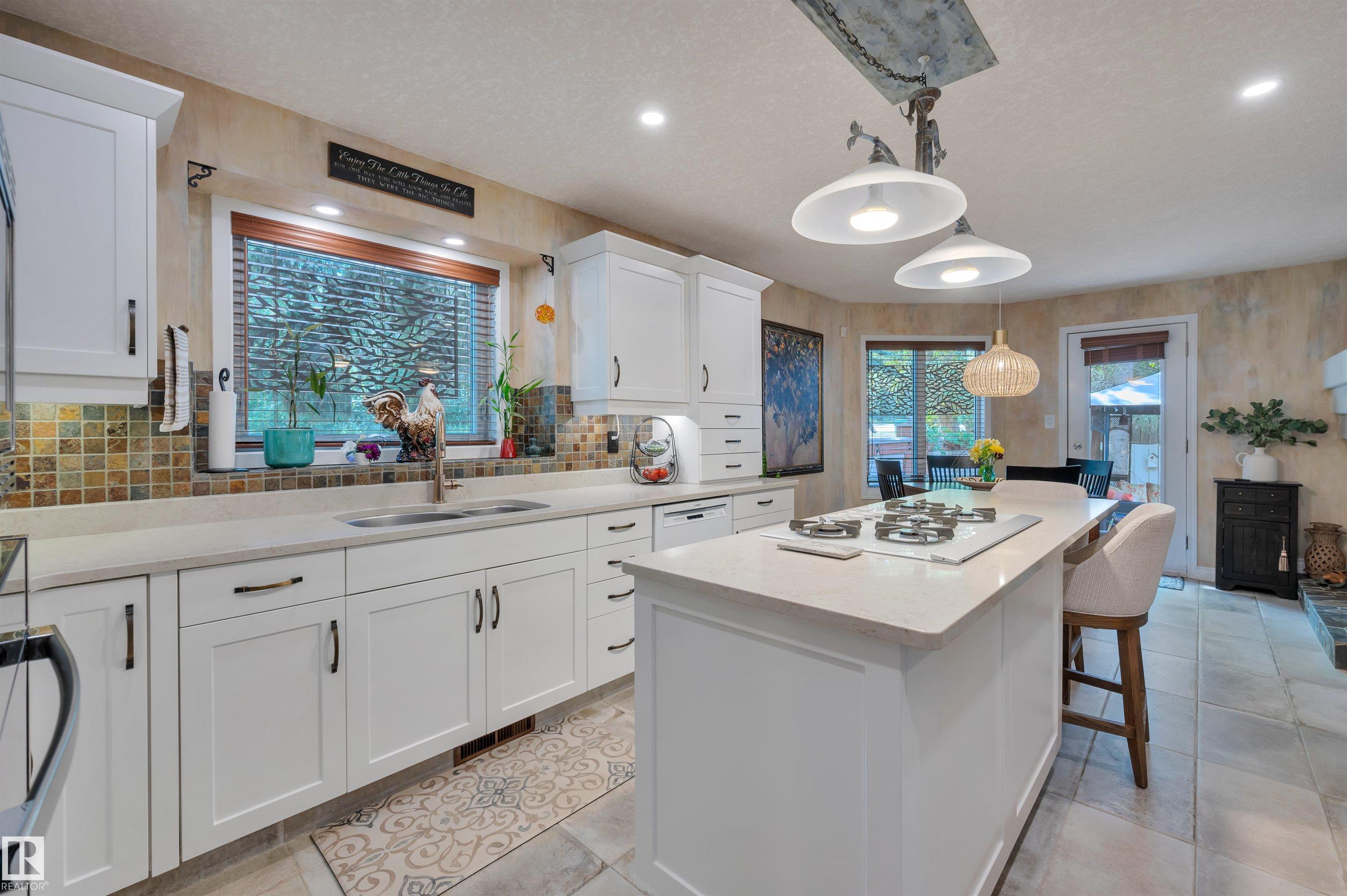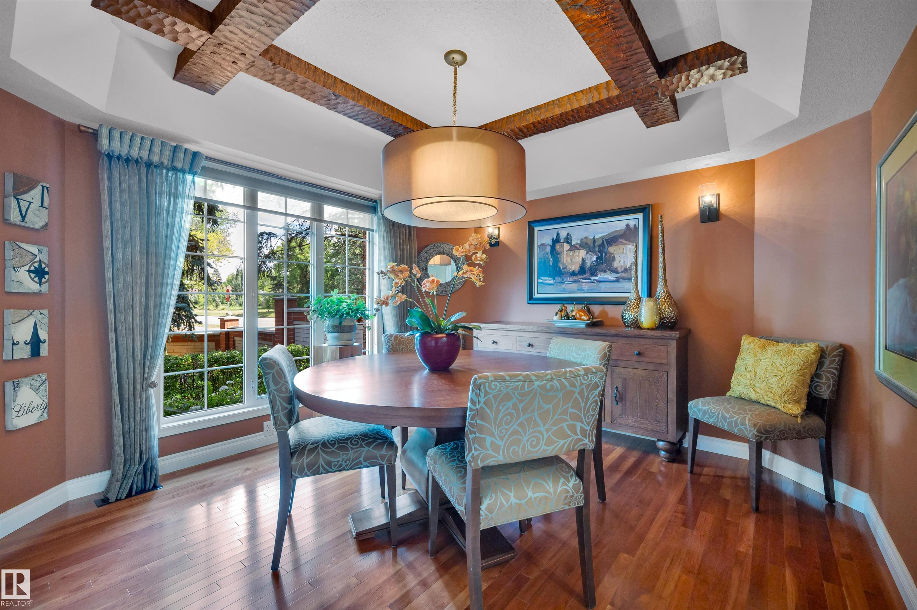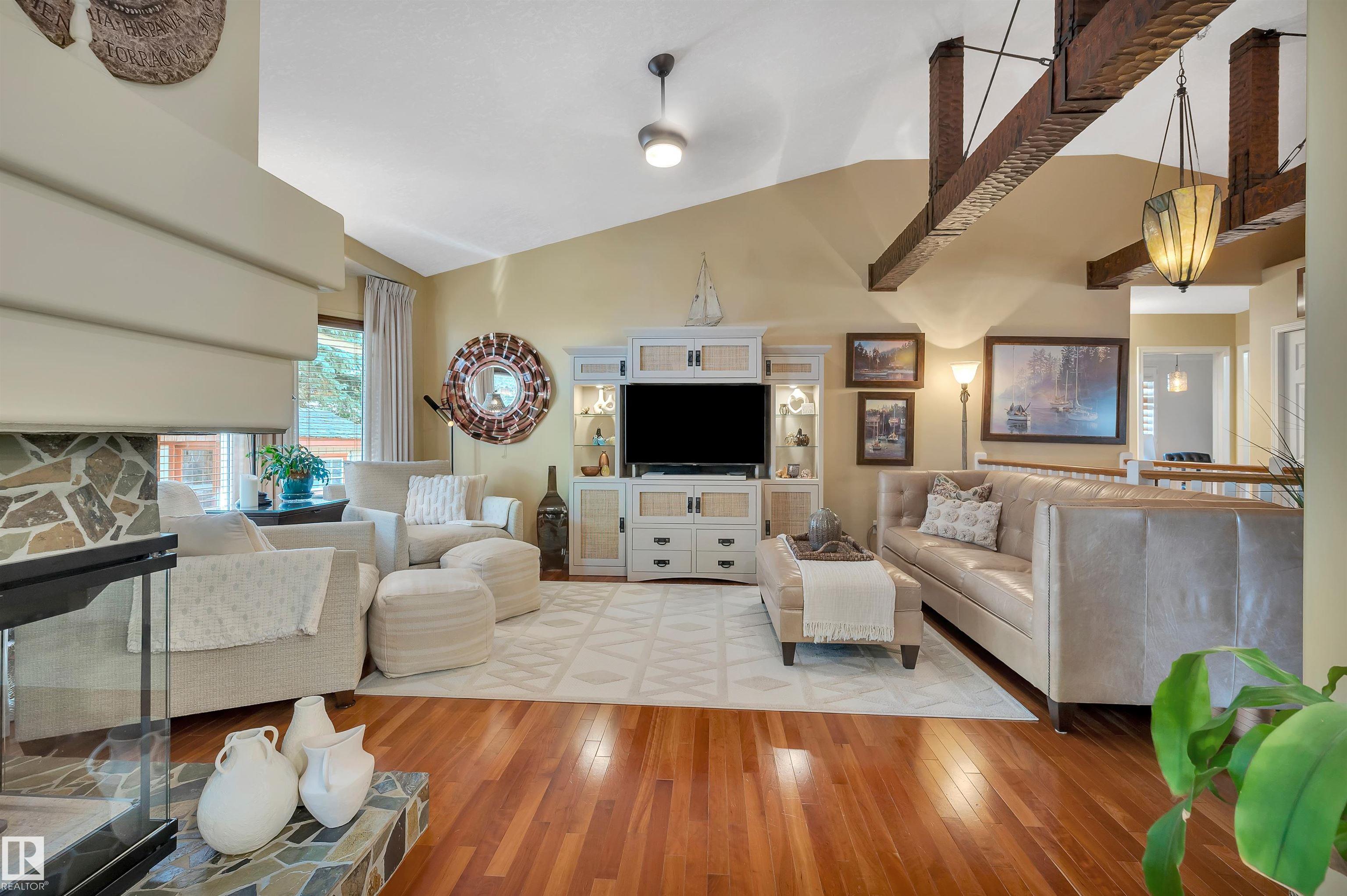 Nestled onto the desirable street of Berrymore Drive, discover this charming EXECUTIVE LIVING bungalow custom built by Champaign Homes. An impressive front courtyard welcomes guests w/ beautiful landscaping & morning sun exposure. The foyer has newer oversized tiles & opens into SOARING VAULTED CEILINGS. The dining room has a coffered ceiling w/ beams & Canadian cherry HARDWOOD FLOORING. The renovated kitchen has white cabinetry w/ some warm toned wood features, quartz counters, gas cooktop w/ a built in fan, pantry, eating bar island, pot lighting, under cabinet lighting, wine bar & the fridge was replaced in 2025. There is a dining nook w/access out to the extremely PRIVATE BACK DECK. The great room has a 3 sided gas f/p. There are 2 main floor bedrooms, a main 4pce bath, a 4pce ensuite w/ a HEATED FLOOR, & laundry room. The FULLY FINISHED BASEMENT has a spacious 3rd bedroom, 4pce bath & a huge rec room. The double attached HEATED GARAGE has RV PARKING! This beautiful home has it all!