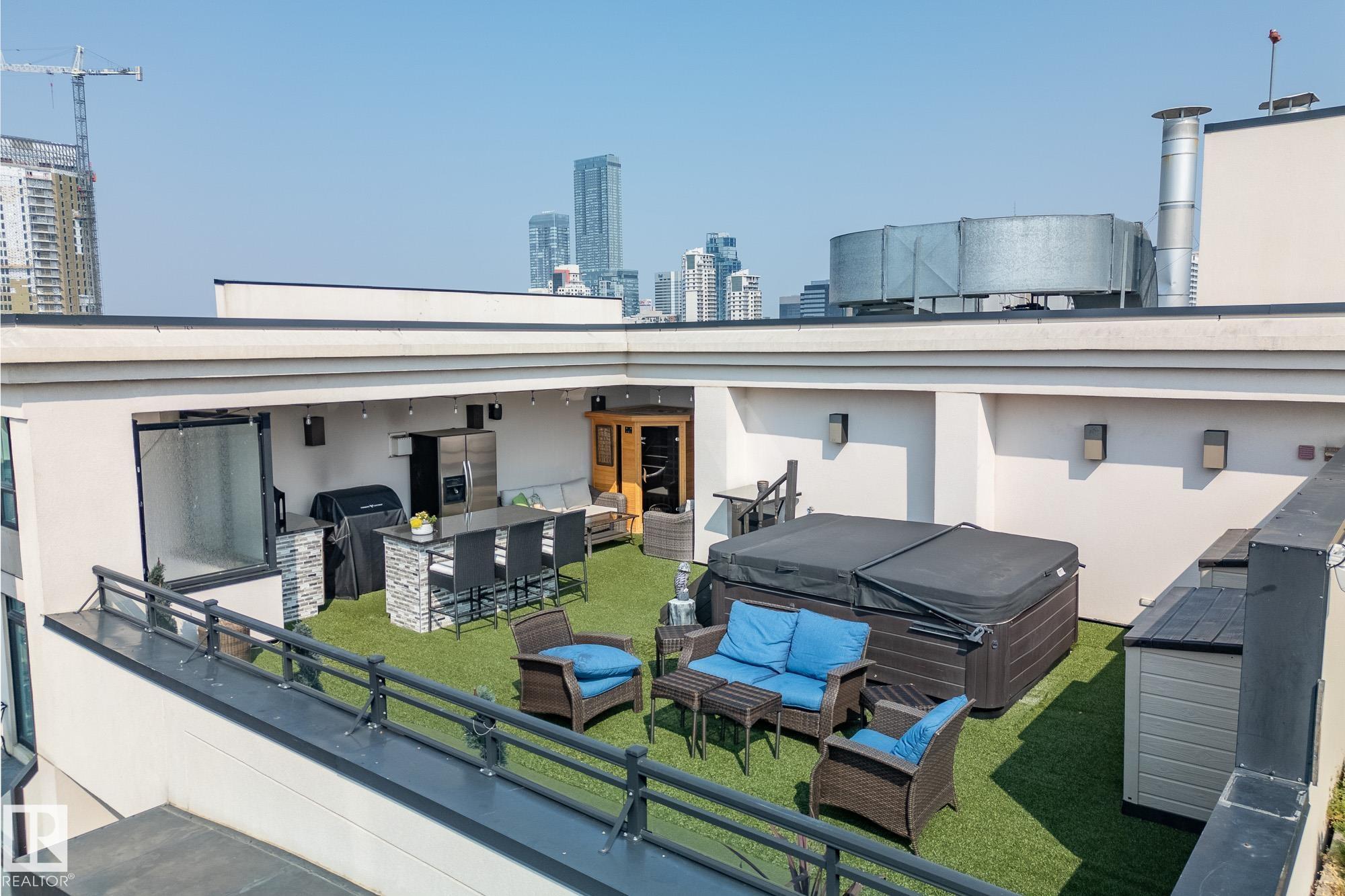 Discover a RARE GEM in the heart of downtown, where luxury, comfort & one-of-a-kind amenities come together. This extraordinary corner unit SPANS 2 LEVELS & boasts EXCLUSIVE PERKS, including a PRIVATE ROOFTOP PATIO & 3 TITLED PARKING STALLS - a true downtown rarity! The chef-inspired kitchen is a showstopper, featuring a MASSIVE GRANITE ISLAND, 6 burner gas stove, wine cooler & plenty of space for culinary creativity & entertaining. The main floor offers 2 bedrooms - one with its own 3pce ensuite plus a separate full bath for guests. Upstairs, the PRIVATE PRIMARY SUITE impresses with a double-sided fireplace, walk-in closet, & SPA-LIKE 6pce ensuite with SOAKER TUB, double sinks & STEAM SHOWER. This level also includes a bonus room & laundry. Step onto your PRIVATE ROOFTOP RETREAT, designed for relaxation & entertainment, with a bar, hot tub, infrared sauna, putting green, & SWEEPING CITY VIEWS. Combining modern conveniences with high-end finishes, this one-of-a-kind condo is the ultimate urban sanctuary!