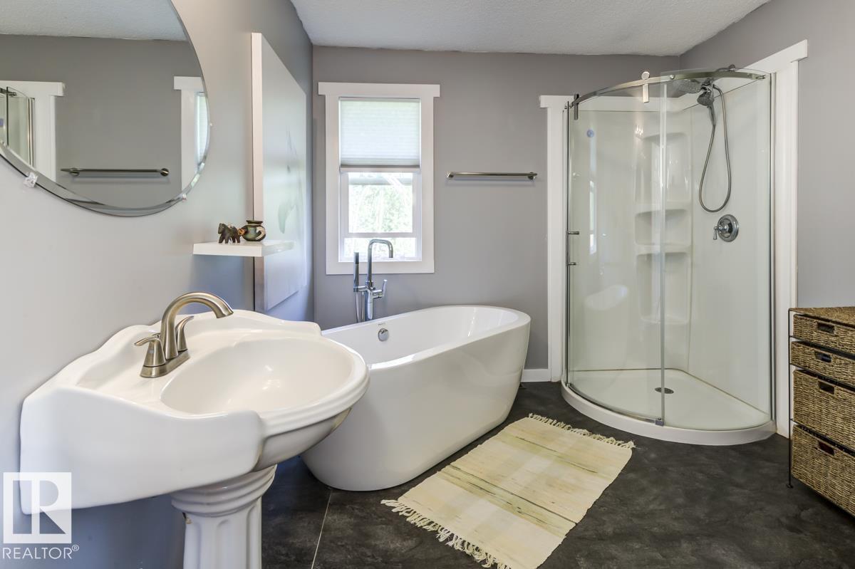 Only 15 minutes from Sherwood Park, this 20-acre gated property offers the perfect mix of country tranquility and modern convenience. The fully finished bungalow is bright and inviting, featuring continuous updates including laminate flooring, a stylish kitchen with stainless steel appliances, refreshed lighting, ceiling fans, and a finished lower level. Step outside to a sprawling south- and east-facing deck with gazebo, ideal for relaxing or entertaining. A paved driveway connects to all buildings, including a versatile barn with spacious loft, tack and feed rooms, and potential for three stalls plus lean-to storage. For work or hobbies, the 40x30/ft quonset-style shop boasts a 14’x14’ overhead door, car hoist, compressed air, 240 amp service, bright LED lighting, and two attached seacans with man-door access. Perimeter fencing, an automated gate, & security system complete this country retreat