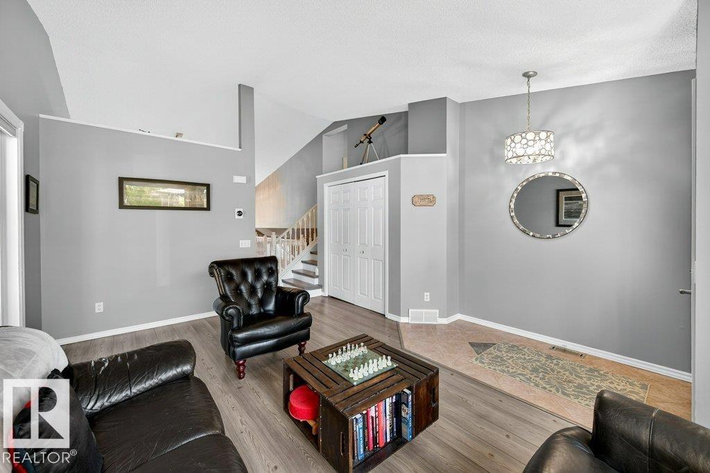 This well-maintained family home in Stony Plain sits on a large corner lot with RV parking & a double gate. It features a huge fenced yard, a stamped concrete patio, low maintenance landscaping, and a fire pit for those summertime hangouts. Inside, you will find vaulted ceilings, neutral paint, 4 bedrooms (3 + 1) and 3 bathrooms, including a large ensuite. Recent updates include windows, new laminate flooring & lighting, SS appliances, and an updated bathroom with a glass shower, making it move-in ready for your family. The spacious layout on every level provides ample storage and comfortable living for families of all sizes. Enjoy evenings with a cozy fire in the 3rd-level family room for movie night. The attached garage is also wonderful in the winter, too, just imagine....no more shoveling off your car!! Conveniently located near the Golf course, schools, shopping, and parks, with easy access to commuter routes into Edmonton, this property offers both practicality and value in a desirable community.