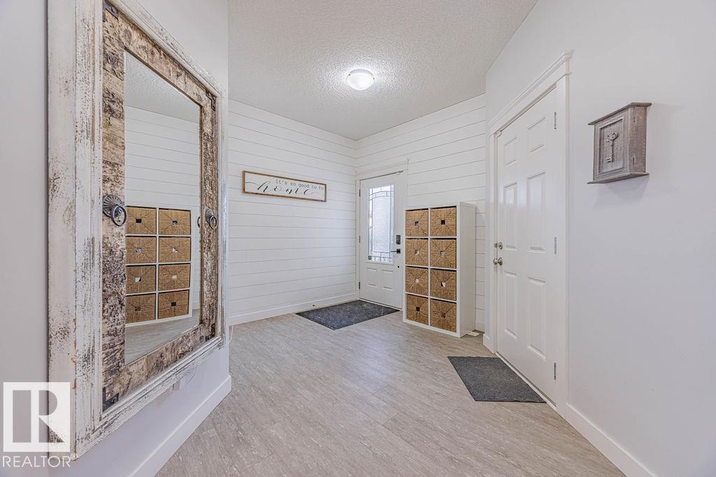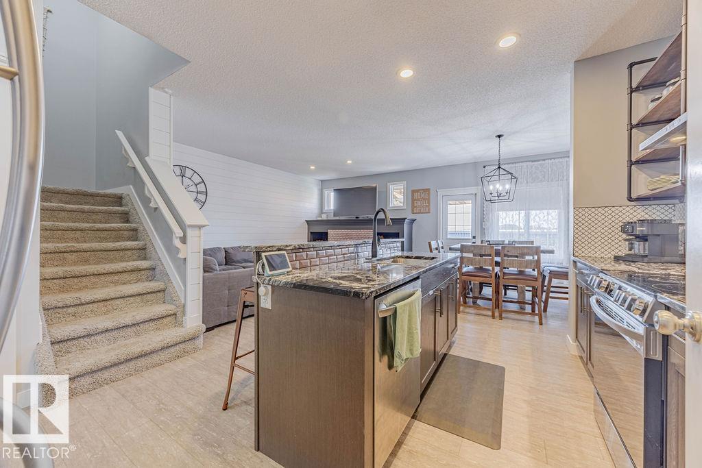 This modern duplex offers impressive design and a functional open floor plan. The kitchen features rich maple cabinets, exotic granite countertops, and a raised eating bar island, opening to a bright great room with a 36” gas fireplace and custom tiled mantel. The main level is enhanced with stylish shiplap accents, adding warmth and character. Upstairs, you’ll find 3 spacious bedrooms, including a primary suite with a walk-in closet and 4-pc bath, along with the convenience of an upper-level laundry room. The partially finished basement adds even more living space with a bedroom, den, living room, and roughed-in bathroom. Outside, enjoy beautifully landscaped grounds with a solid wood pergola and stunning views of the surrounding farmers’ fields. Additional highlights include central air conditioning, a double attached garage, and a striking stone exterior. Perfectly located near the Stony Plain Golf Course and close to schools, shopping, and amenities—this gorgeous home is a must-see!
