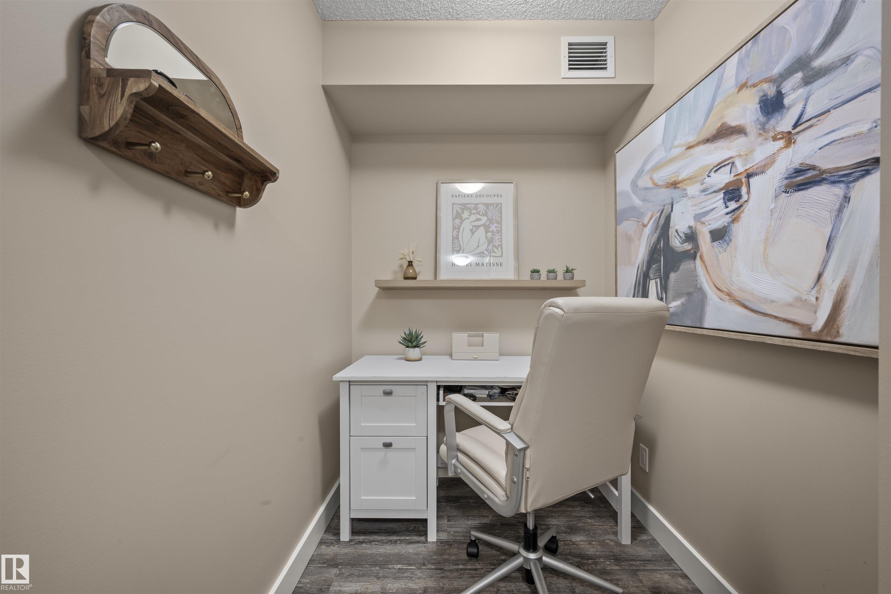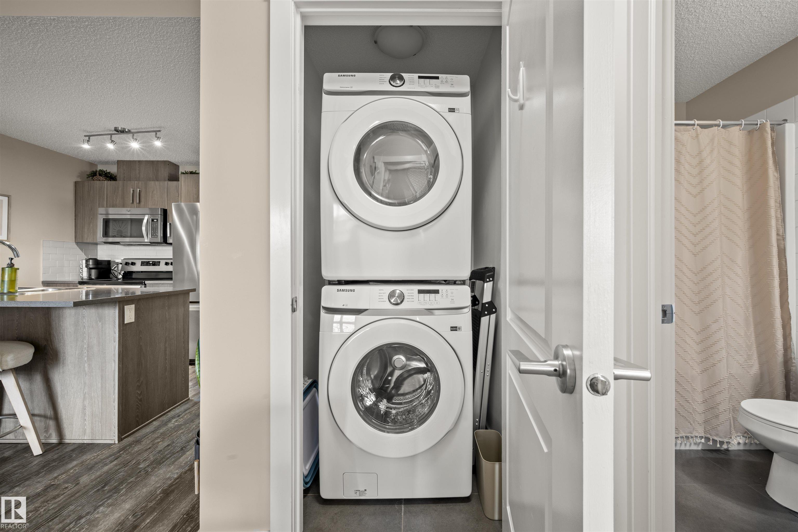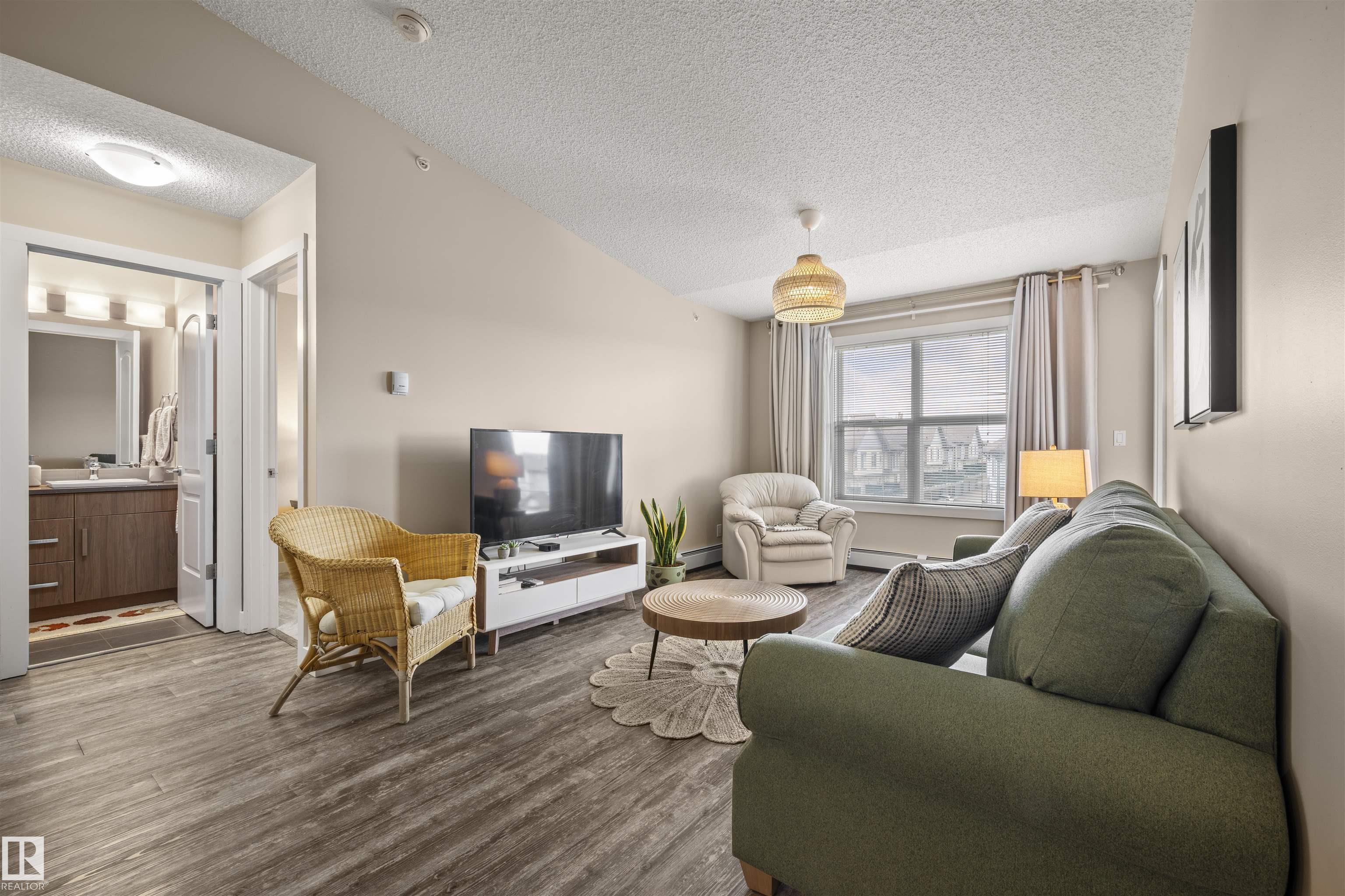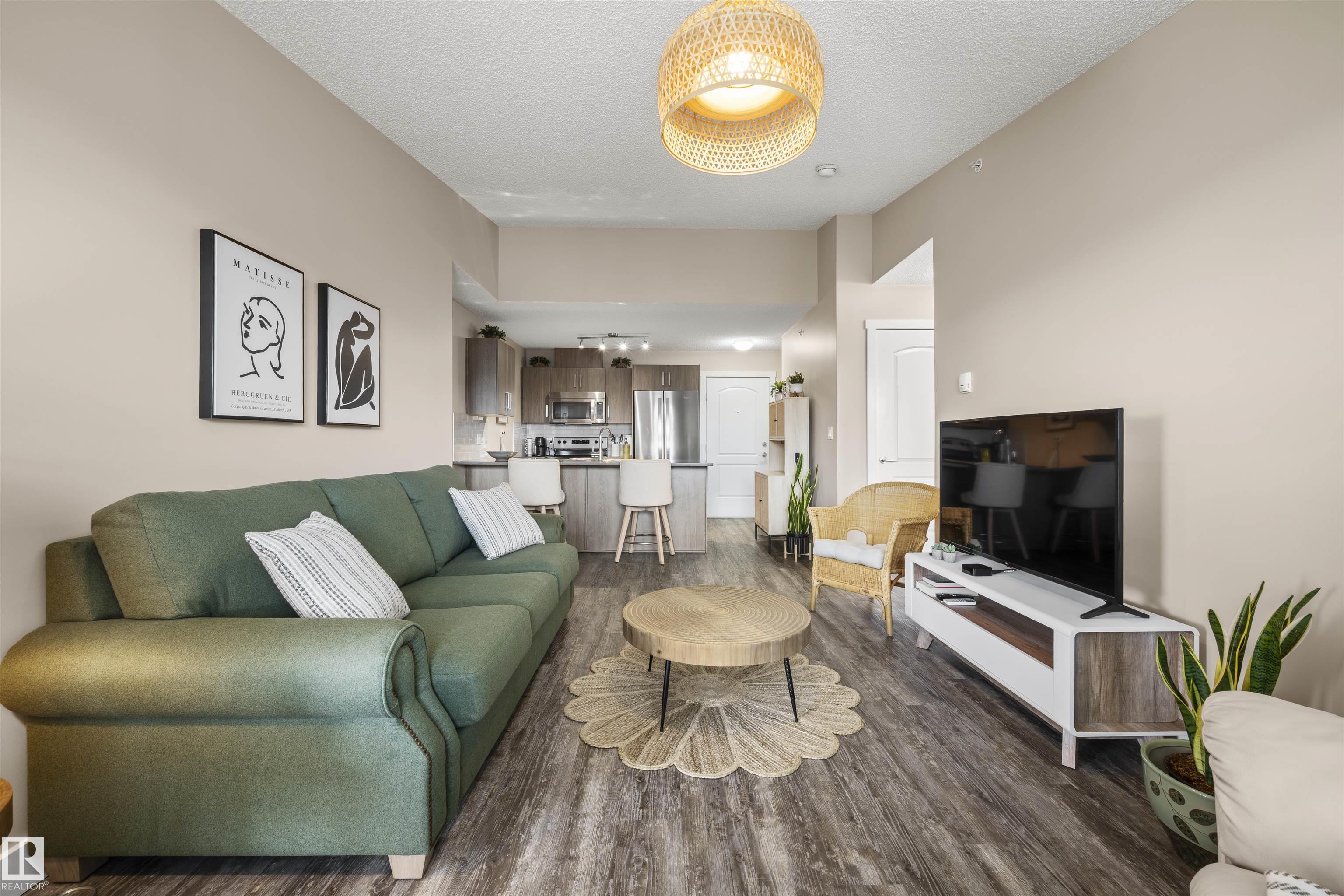 Immaculate top-floor 2 bedroom + den condo in the desirable community of Walker Lakes! This bright and spacious unit features vaulted ceilings in the living room and a modern open-concept layout, perfect for both relaxing and entertaining. The bedrooms are thoughtfully placed on opposite sides of the unit—ideal for roommates or added privacy. The primary bedroom includes a walkthrough closet and a 3-piece ensuite. You'll also find a versatile den space, in-suite laundry, and the convenience of underground parking. The well-maintained complex offers great amenities including a social room and an exercise room. Located with easy access to Anthony Henday, shopping, schools, and transit. Whether you're a first-time buyer, downsizer, or investor, this condo has it all.