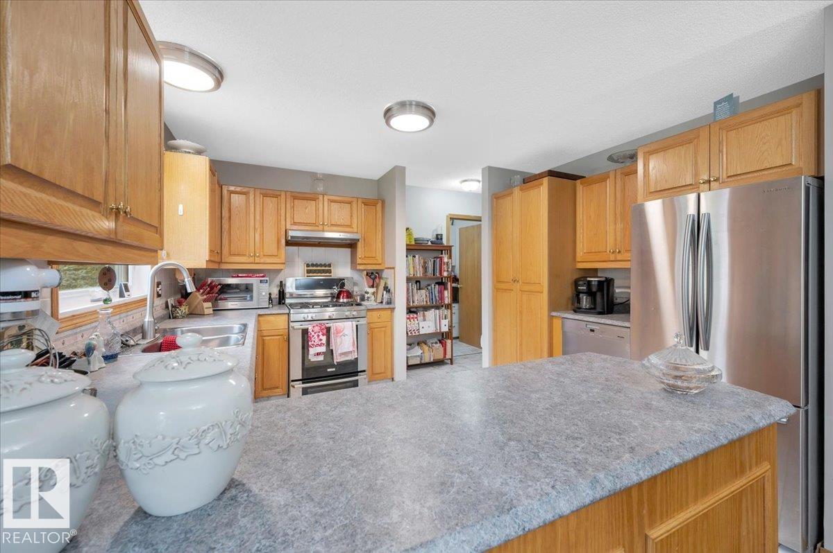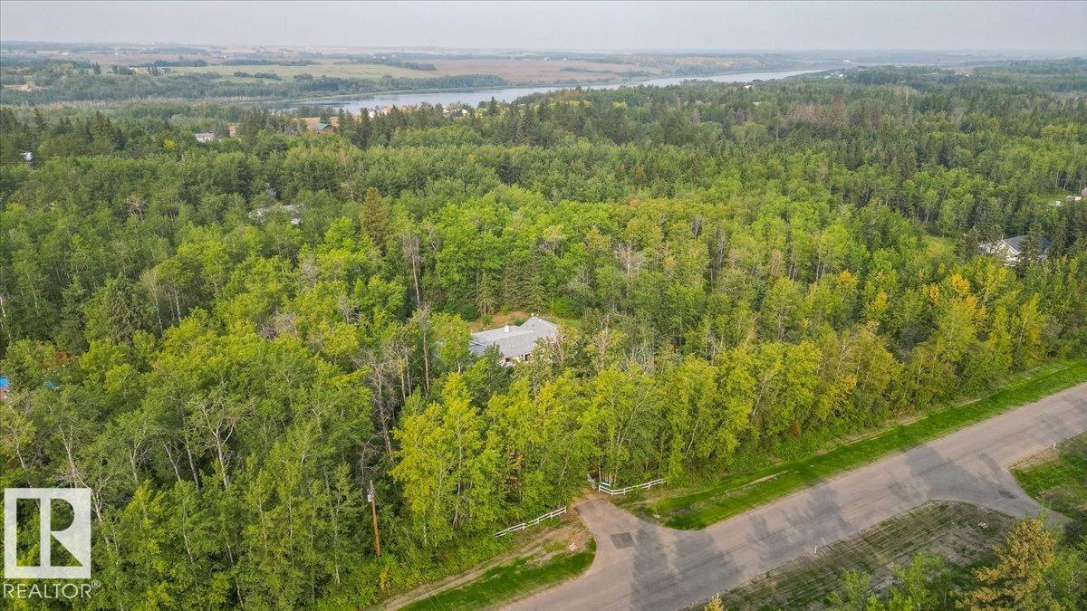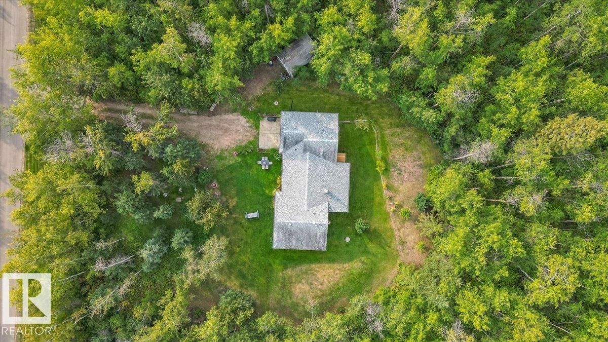 Discover this charming ranch-style bungalow offering just under 1,900 sq ft, nestled on a private, treed lot. Step into a spacious foyer leading to a bright dining area with a large bay window and a well-appointed kitchen featuring ample cupboard and counter space. The expansive living room showcases a beautiful two-sided fireplace, shared with a sun-drenched sunroom perfect for relaxing. Off the foyer, you'll find a 4-piece bath, two generously sized bedrooms, and a spacious primary suite with a 2-piece ensuite. A tree-lined driveway welcomes you to the home, opening to a large, peaceful yard ideal for outdoor activities. The 14' x 22' quonset provides excellent additional storage. Enjoy the tranquil setting with birdsong all around. Located moments from Lily Lake, just 10 minutes to Gibbons, and a short drive to Edmonton, this serene retreat offers the perfect blend of privacy and convenience.