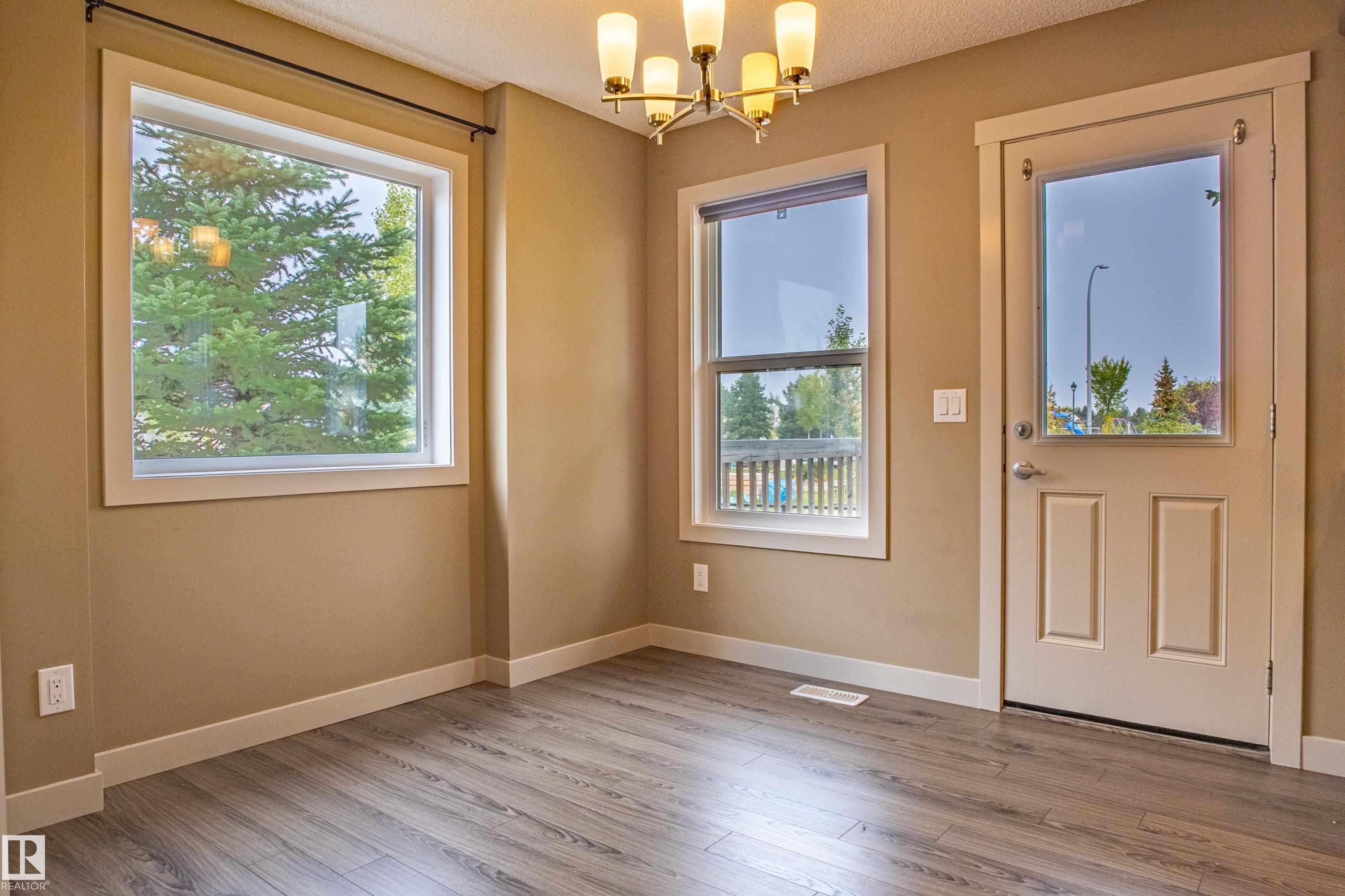 Welcome to Haddow Landing! This air-conditioned, bright south-facing 3-bedroom townhouse includes ***two titled parking stalls right in front of your door*** The two-storey layout is filled with natural light and features an unfinished basement ready for your customization. The main floor offers premium vinyl plank flooring, stainless steel appliances, ^black granite countertops^, and a half bath. Upstairs you’ll find 3 bedrooms and a full bath, with the primary boasting a large walk-in closet. The unit is quietly tucked into the interior of the complex, away from traffic noise. Out back, enjoy a private deck with natural gas BBQ hookup overlooking Haddow Community Park with the Ridge Community Center, playground, hockey rink, and sports fields just a short walk away. Fantastic location only one minute to Terwillegar Drive, close to The Currents at Windermere, and transit is right outside the complex. This home is ready for you!