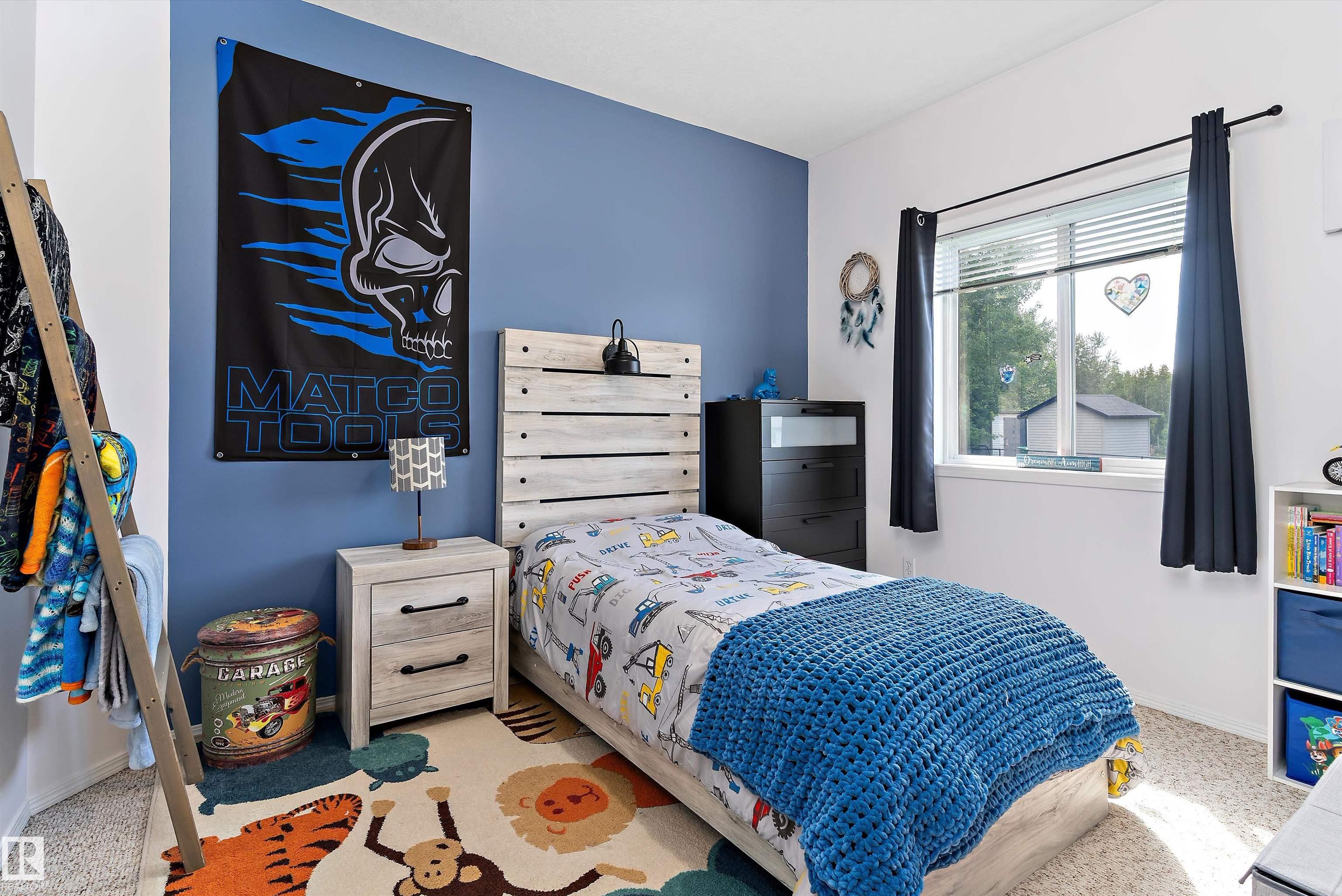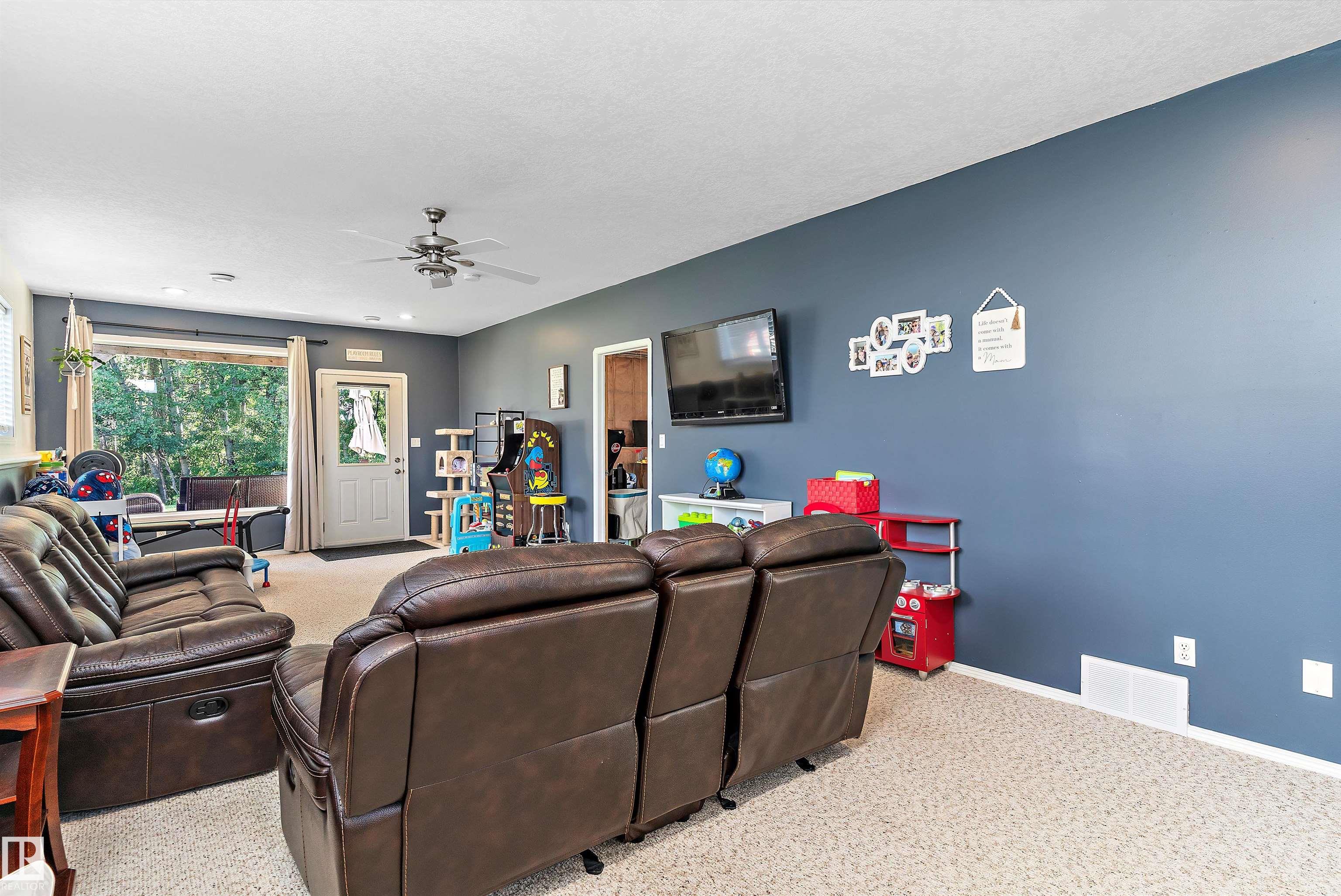 10/10 fenced acreage! Here is your chance to move into Willow Peak Park in the village of Spring Lake. This walk out Bi-level offers 3 bedrooms and 2 bathrooms. Main floor offers open concept with abundance of light. Beautiful oak kitchen with lots of storage, island, peninsula and walk in pantry and new appliances. Cozy living room with gas fireplace and vaulted ceiling. The main floor offers 2 bedrooms and a 4 piece bathroom. Just a few steps up will lead you to the large primary bedroom with a huge walk in closet and 4 piece bath with corner tub. The basement has large family room and laundry room. Additional basement space for a bedroom and bathroom. Two tiered deck allows for great entertaining in this private yard. Lots to explore on this beautiful property,walk down to the trees for a separate secluded fire pit area.Double attached garage with ample parking for vehicles and RV'S. Upgrades include new hot water tank (2023) Garage door(2024) and fence(2024) close to Blueberry school and Stony Plain