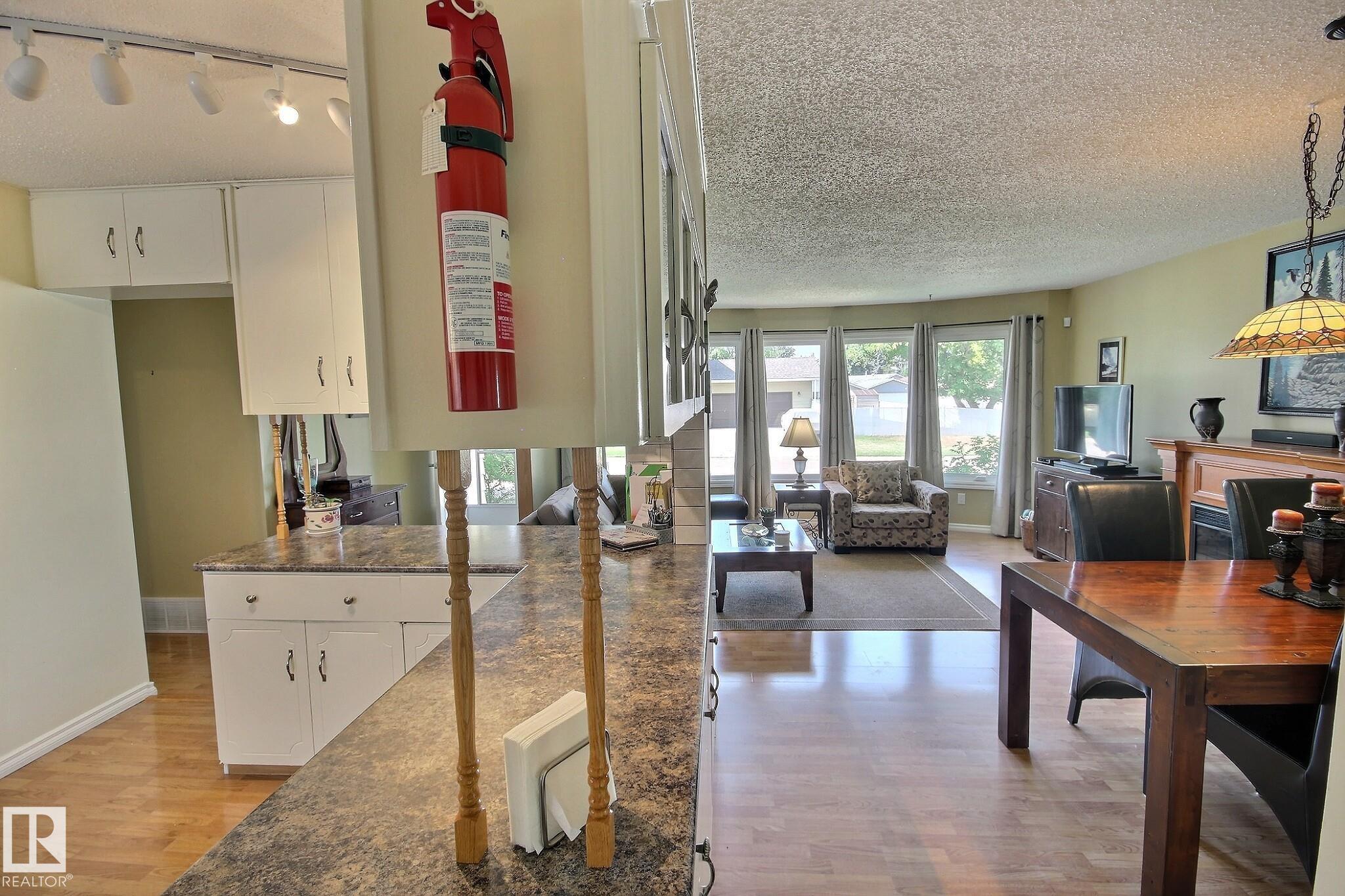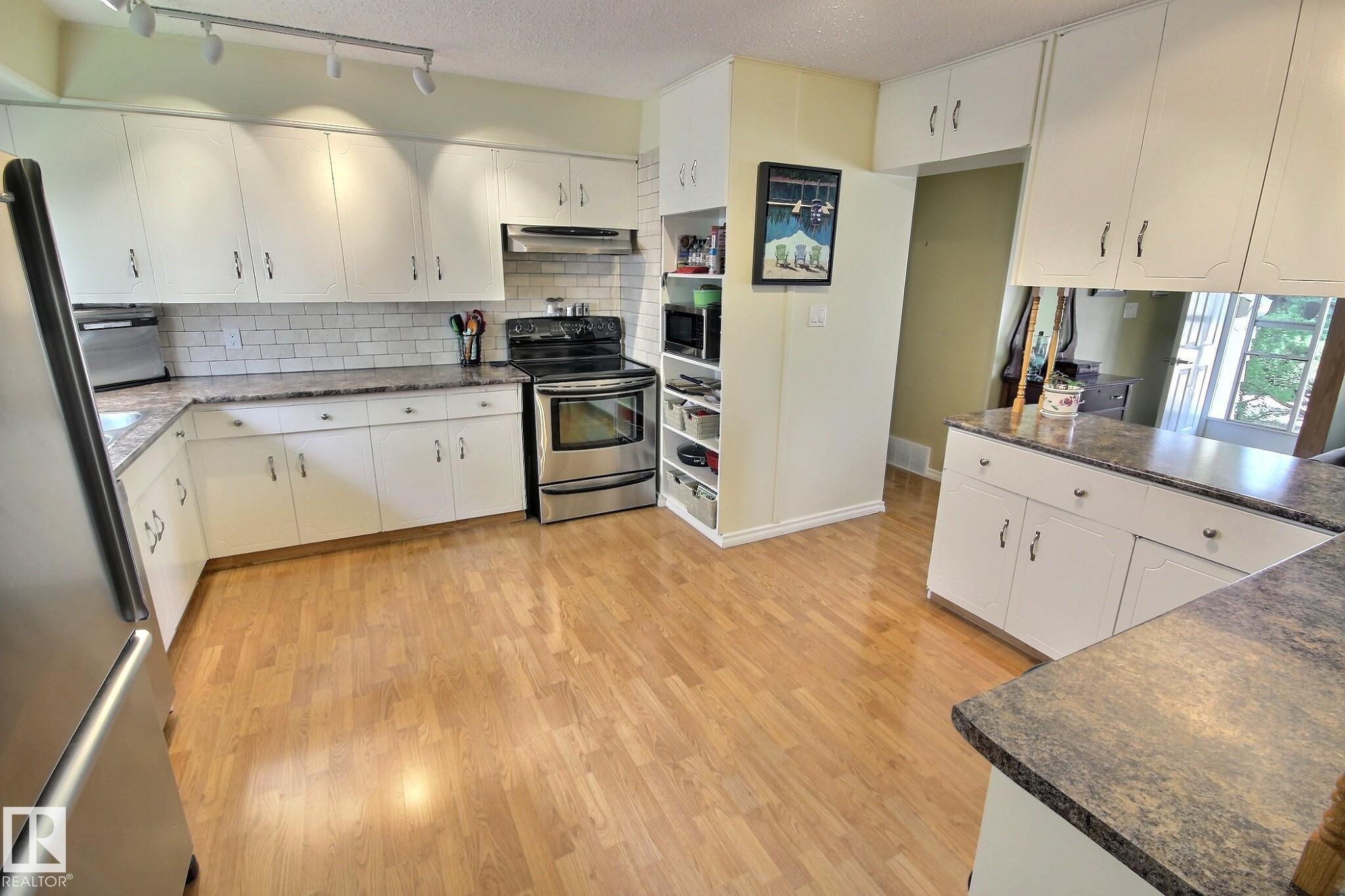 GREAT VALUE! This wonderful home has been loved by the same family for decades and pride of ownership is evident throughout. Perched on a big corner lot with a massive double attached garage, this home sides a park that connects directy to the Spruce Grove's extensive trail system! Boasting an updated main floor with open kitchen with loads of white cabinets, newer stainless steel appliances, open to dining nook and huge living room with bow window overlooking the mature front yard, 3 good sized bedrooms, primary with 2 piece ensuite and an updated 4 piece bath complete the main level, separate entrance to the lower level with original finishings, 2 good sized rooms, big rec room, laundry and mechanical complete the lower level. Updates include newer vinyl windows on the main level, new roof in 2025, newer appliances and hot water tank. Fenced and landscaped side yard completes the package. Easy walk to schools, quick drive to Edmonton. Add this one to your must see list.