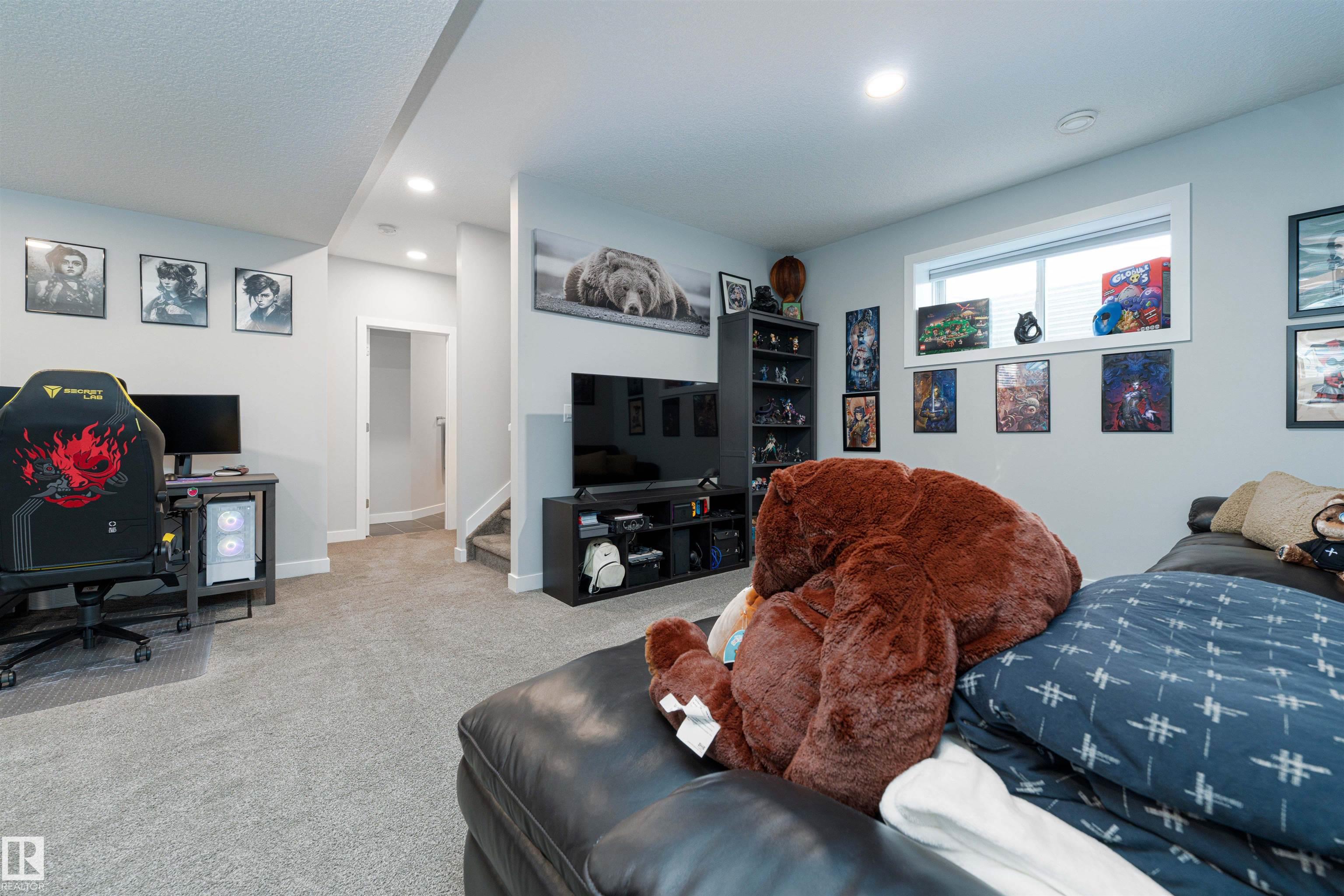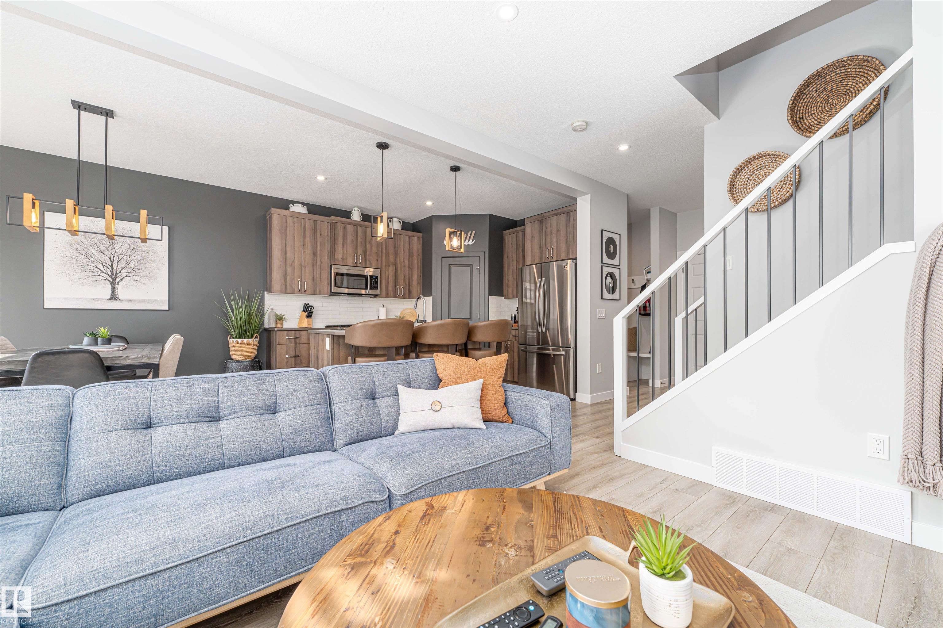 Welcome to this beautifully maintained house in Sienna, Fort Saskatchewan, initially built by Alquinn Homes, steps from schools, shopping, and scenic walking paths. The open-concept main floor is perfect for entertaining and extends onto a show-stopping two-level composite deck with built-in lighting, privacy panels, tons of space for lounging or hosting, and a hot tub! Inside, you will find the moody kitchen with dark accents, a granite undermount sink, a gas range, new appliances, and a large pantry. The open living area centers around a fireplace framed by large windows. Upstairs offers a bonus room, upper laundry, and spacious bedrooms. The primary suite includes a walk-in closet and spa-like bath with a freestanding tub. The professionally finished basement has tall ceilings, a full bath, and space for a fourth bedroom. The garage is a standout too—finished with sleek epoxy floors and plenty of room for storage. This home is ready to impress, inside and out!