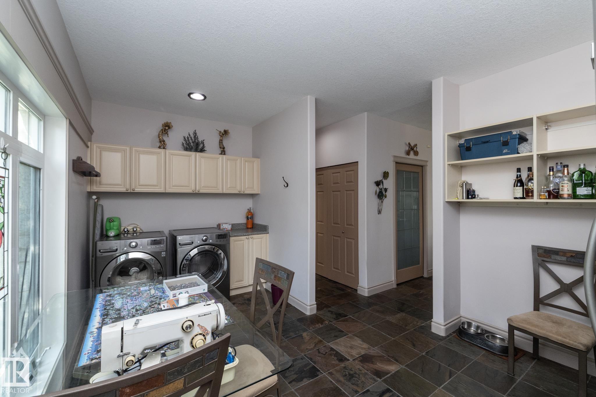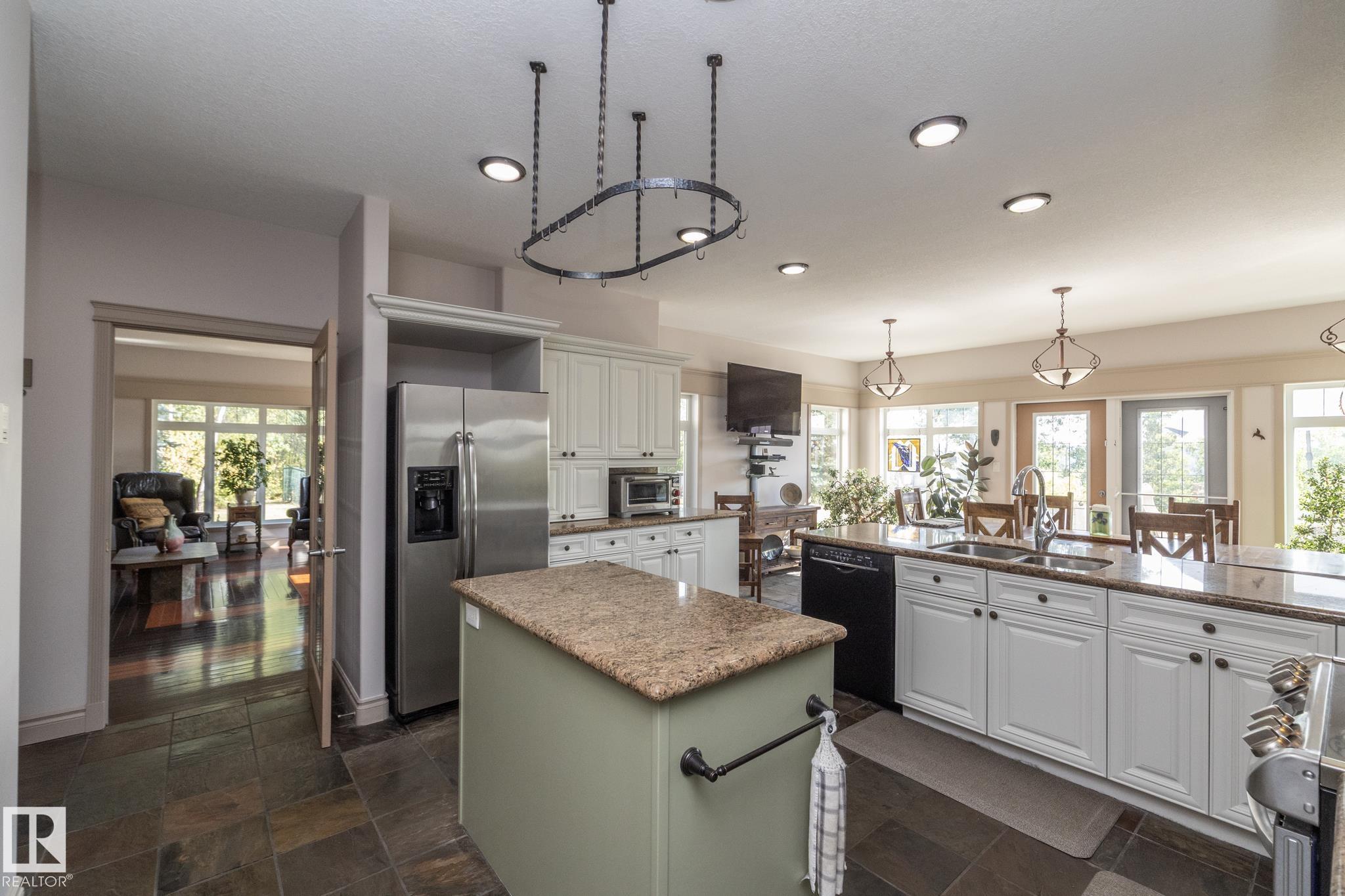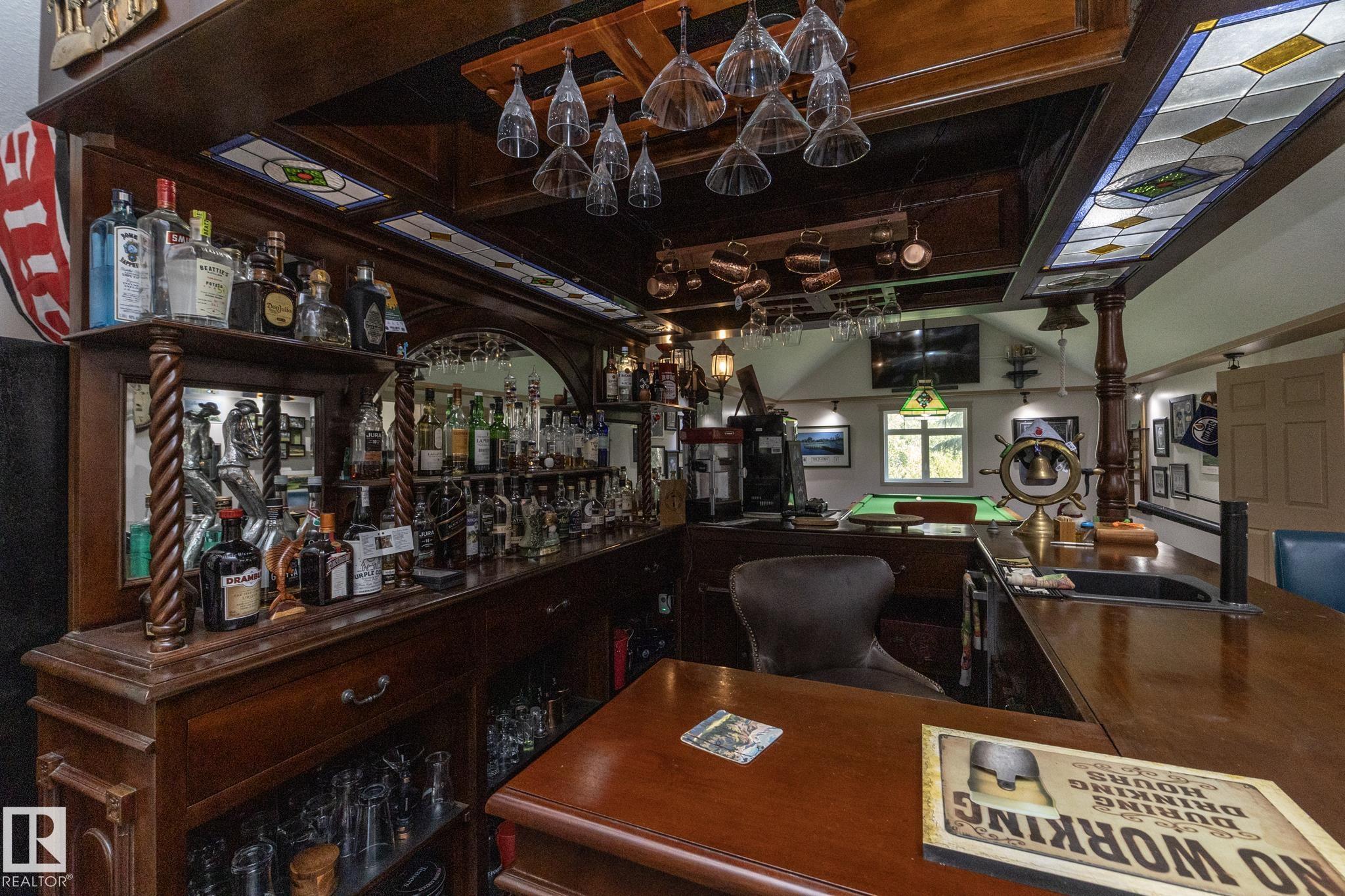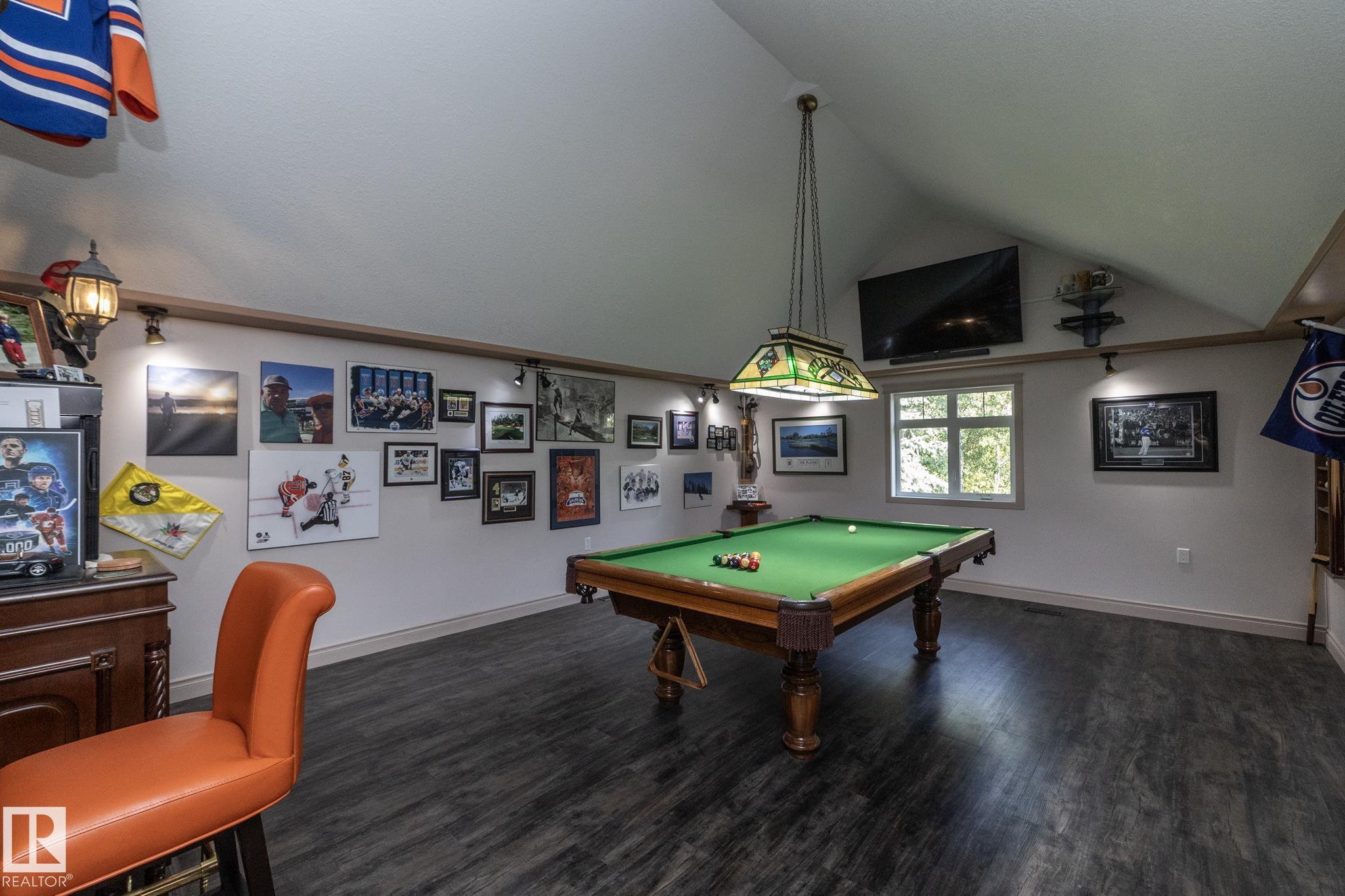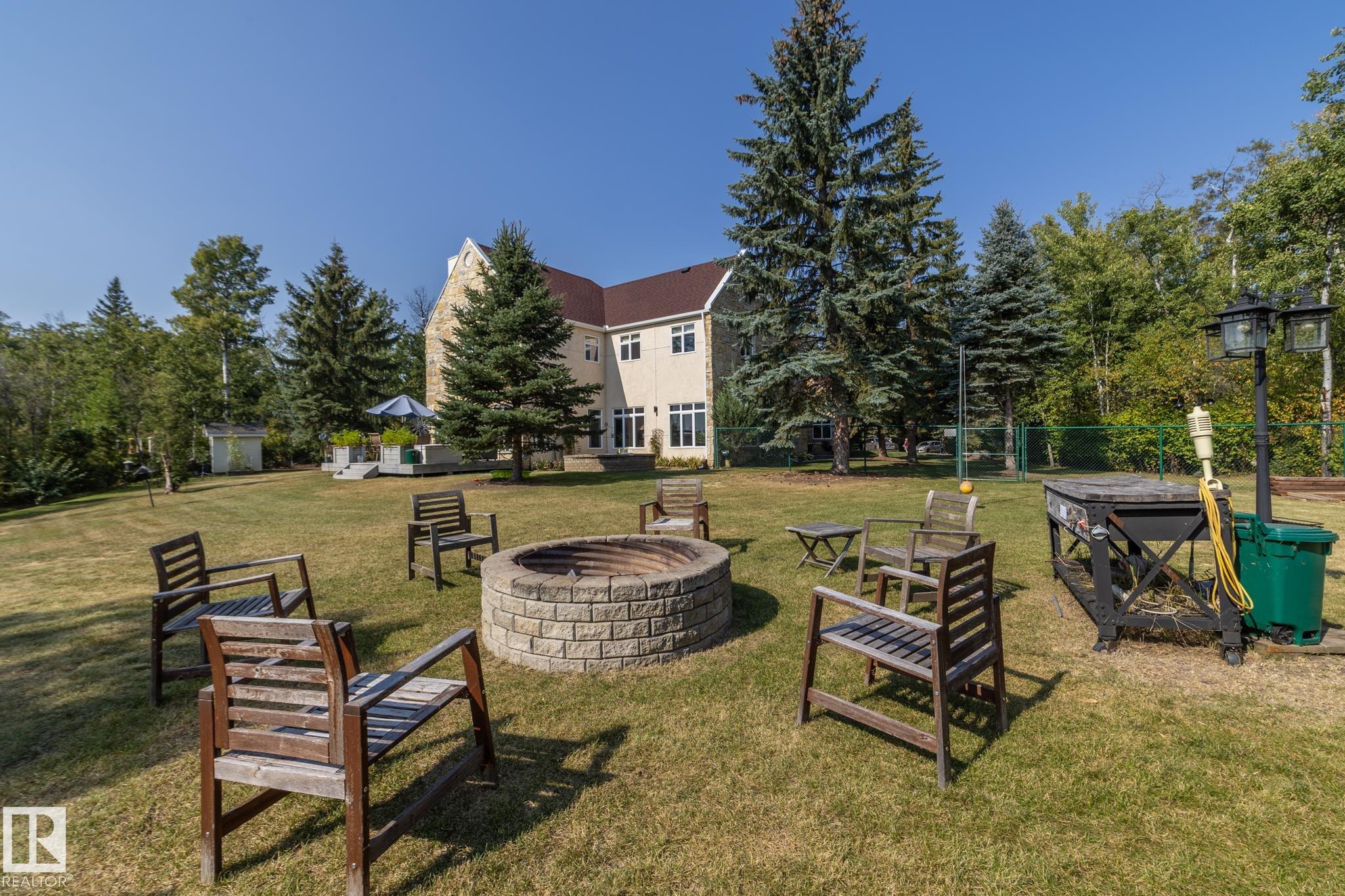 EXCEPTIONAL RIVERFRONT RETREAT. Tucked among towering trees along the North Saskatchewan River, this one-of-a-kind estate offers serene privacy and breathtaking scenery at every turn. Floor-to-ceiling windows capture panoramic river views throughout the home, while a charming Irish pub on the 2nd storey provides the perfect gathering spot after a day outdoors. Stroll your community walking trails, launch a canoe or kayak from a secluded riverside spot, or unwind by the firepit and picnic areas — all set on over 30 acres of untouched nature with no public access. Landscaping frames a spectacular yard, fully fenced for pets, creating a safe haven for family & four-legged friends alike. Peaceful, yet only minutes to Devon and a short drive to Edmonton, this 5,555-sqft Tyndall-stone manor combines timeless architecture with an outdoor lifestyle rarely found so close to the city. With an oversized double garage, versatile bedrooms, a den, and bonus room, this property is as functional as it is unforgettable.