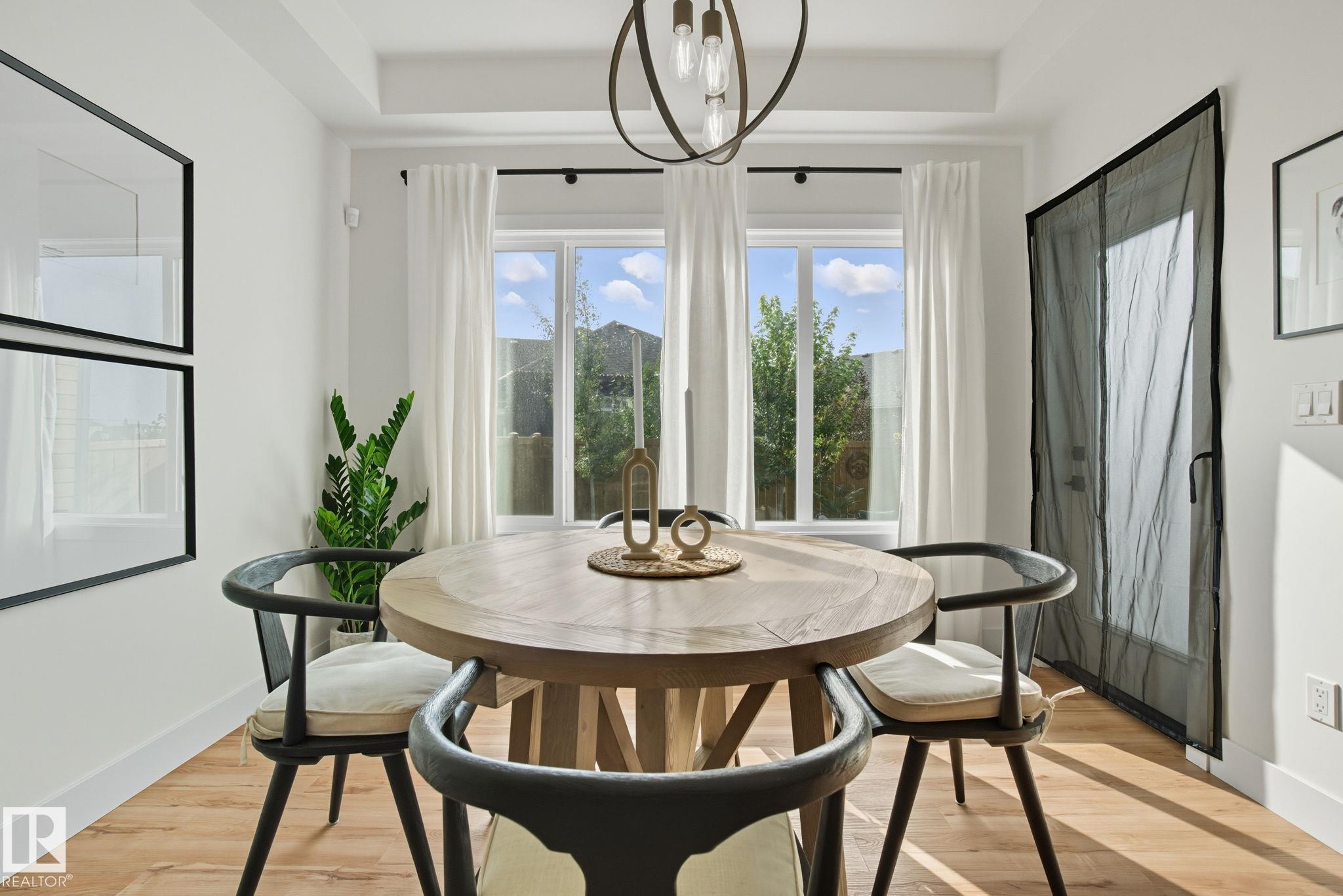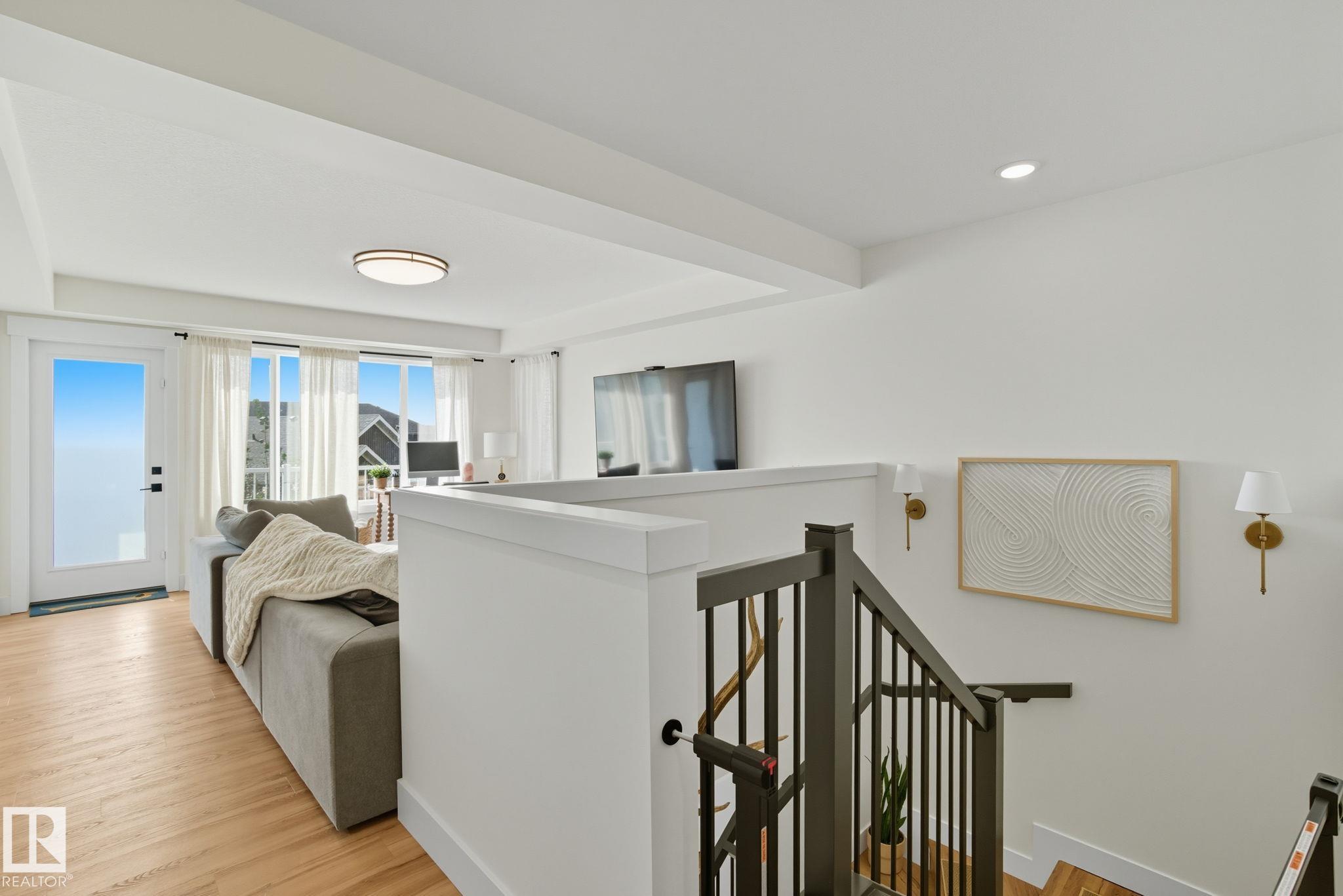 This property truly has it all. Nestled in a family-friendly community, surrounded by scenic walking trails where you can enjoy pond views from your very own balcony! Soaring 9' main floor ceilings, a chic tile fireplace with open display shelving, hard surface flooring throughout the entire home, and gorgeous iron railing create a luxurious feel. Thoughtfully designed mudroom with bench and shelving, seamlessly connects to the gourmet kitchen via walk-through pantry. The kitchen impresses with full height, soft-close cabinetry, gas stove, breakfast bar, and premium countertops & backsplash. Beautiful coffered ceiling creates a stylish dining area that leads to your outdoor oasis complete with BBQ gas line and concrete stamped patio. Enjoy all season comfort with heated garage (22'x19'), A/C, smart thermostat and triple pane windows. This home even has upstairs laundry room + side entrance for possible basement suite! Close to YEG airport and south Edmonton. Welcome to your peaceful retreat!