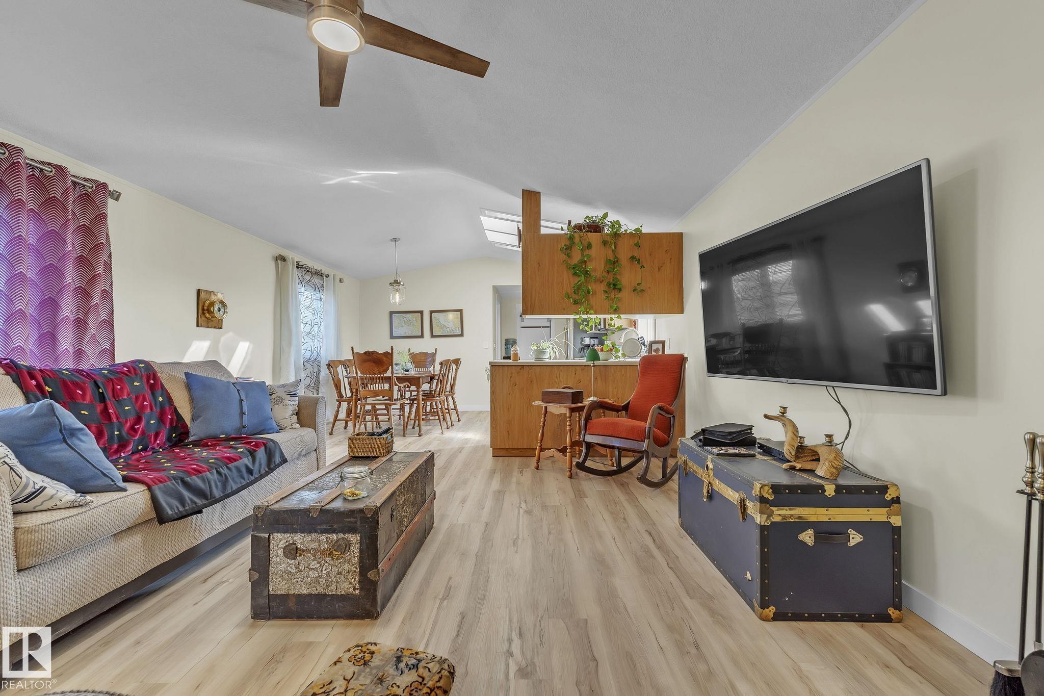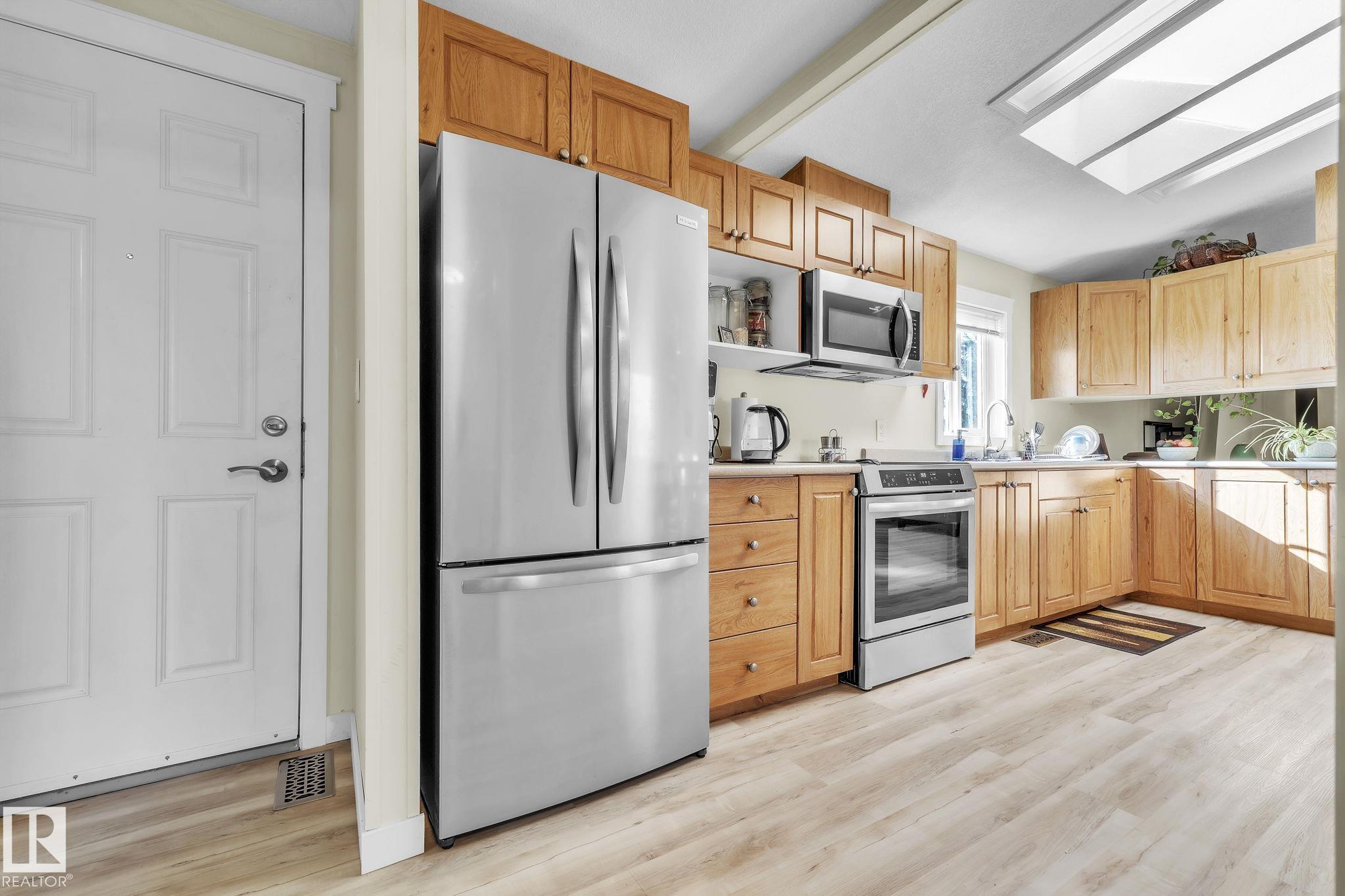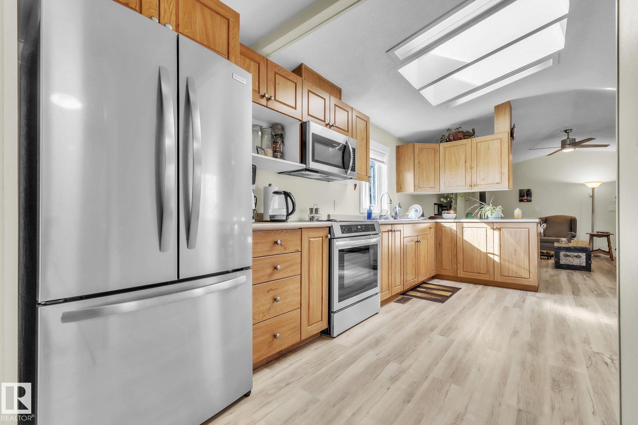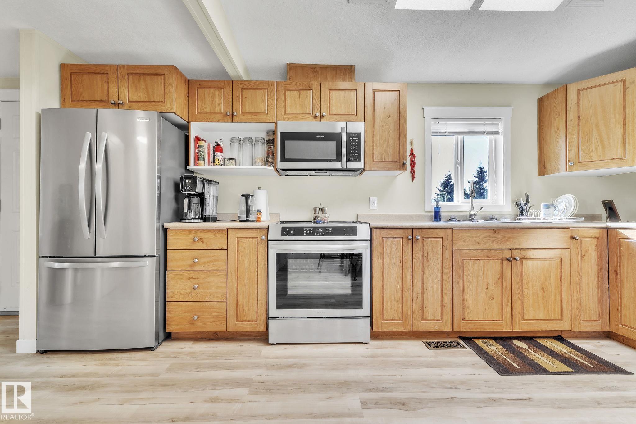 Welcome to this beautifully maintained 2.45 acres, minutes to Bon Accord & only 15 min to Edmonton on Sunnyside Road! This picturesque property is serviced with city water and features a mature, treed setting with open views - an ideal spot for a 2nd residence or future building site! The renovated home offers an open floor plan with vaulted ceilings and skylights, creating a bright and inviting atmosphere. Updates include new flooring, lighting, paint, doors and baseboards throughout. The spacious kitchen features new stainless appliances and loads of room for friends and family to gather for meals - while the living room is highlighted by a cozy wood stove for cool evenings. The thoughtful layout has the primary suite privately located at one end of the home, with the 2 additional bedrooms and full bathroom at the opposite end. Outside, you'll find a double detached garage, numerous storage sheds and plenty of space to enjoy the peace and quiet of country living. Move in ready with room to grow!