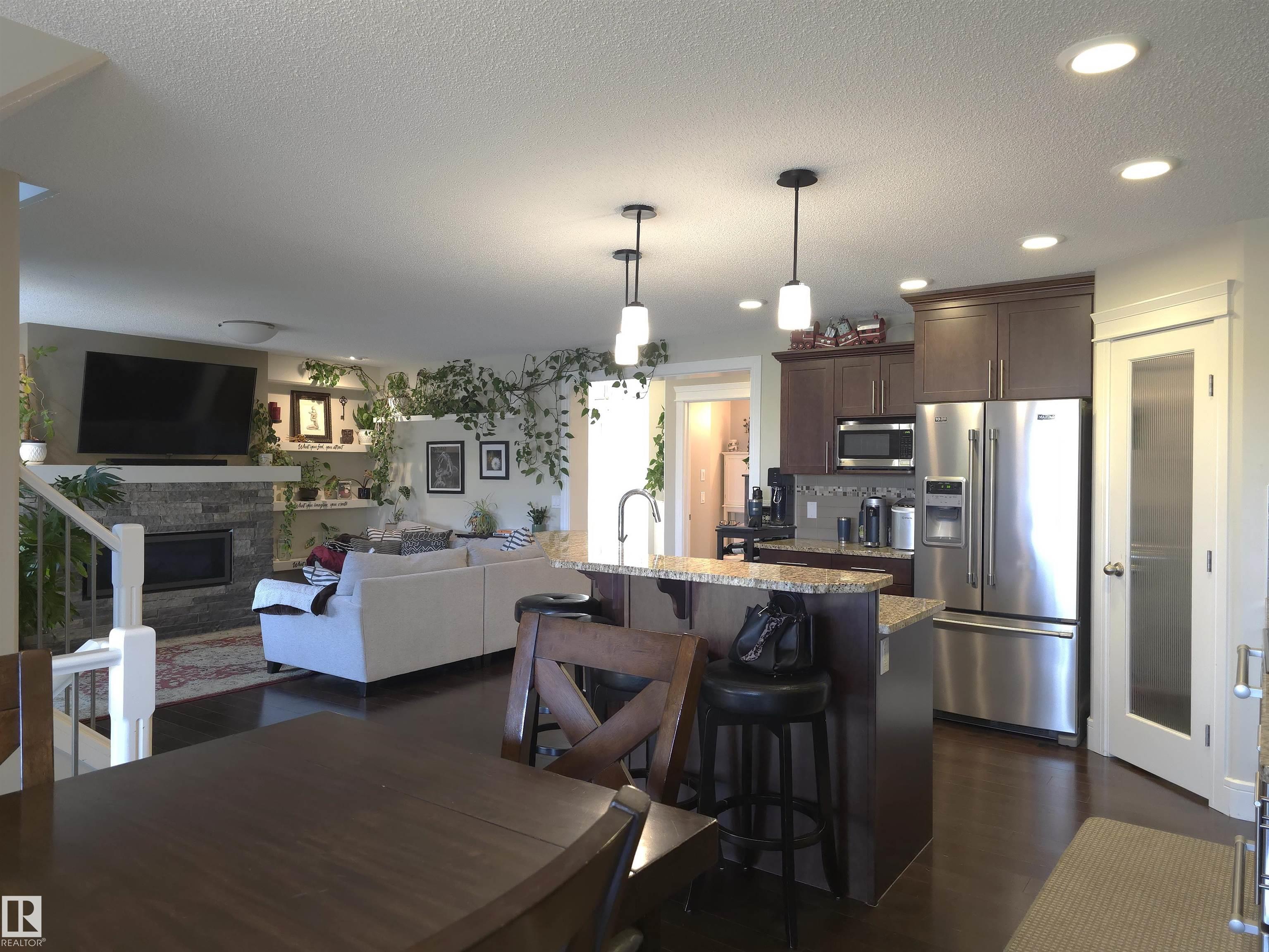 Wonderful family ready home in a beautiful, quiet setting in Sienna Fort Saskatchewan! This well appointed 2 storey home is in a cul de sac on a large pie lot with a view of an open field with gorgeous sunrises. The spacious main floor features a large granite kitchen with eating bar, walk-thru pantry, large dining area with patio doors to the huge back yard oasis. The living room has hardwood floors + a beautiful ribbon-style fireplace with stone surround and built-in shelving. The rear stairway keeps the layout very open and bright with big windows. The 2nd floor features a large bonus room, 2 big secondary bedrooms and an impressive main bedroom suite! The king-sized main bedroom has dual walk-in closets plus an luxury 5 pc ensuite with water closet, large shower, corner soaker tub and dual sink vanity. The basement has fantastic potential for development with a start on layout. A double 24x24 attached & heated garage, central A/C, dog run, close to Southfort School, highway access & all amenities.
