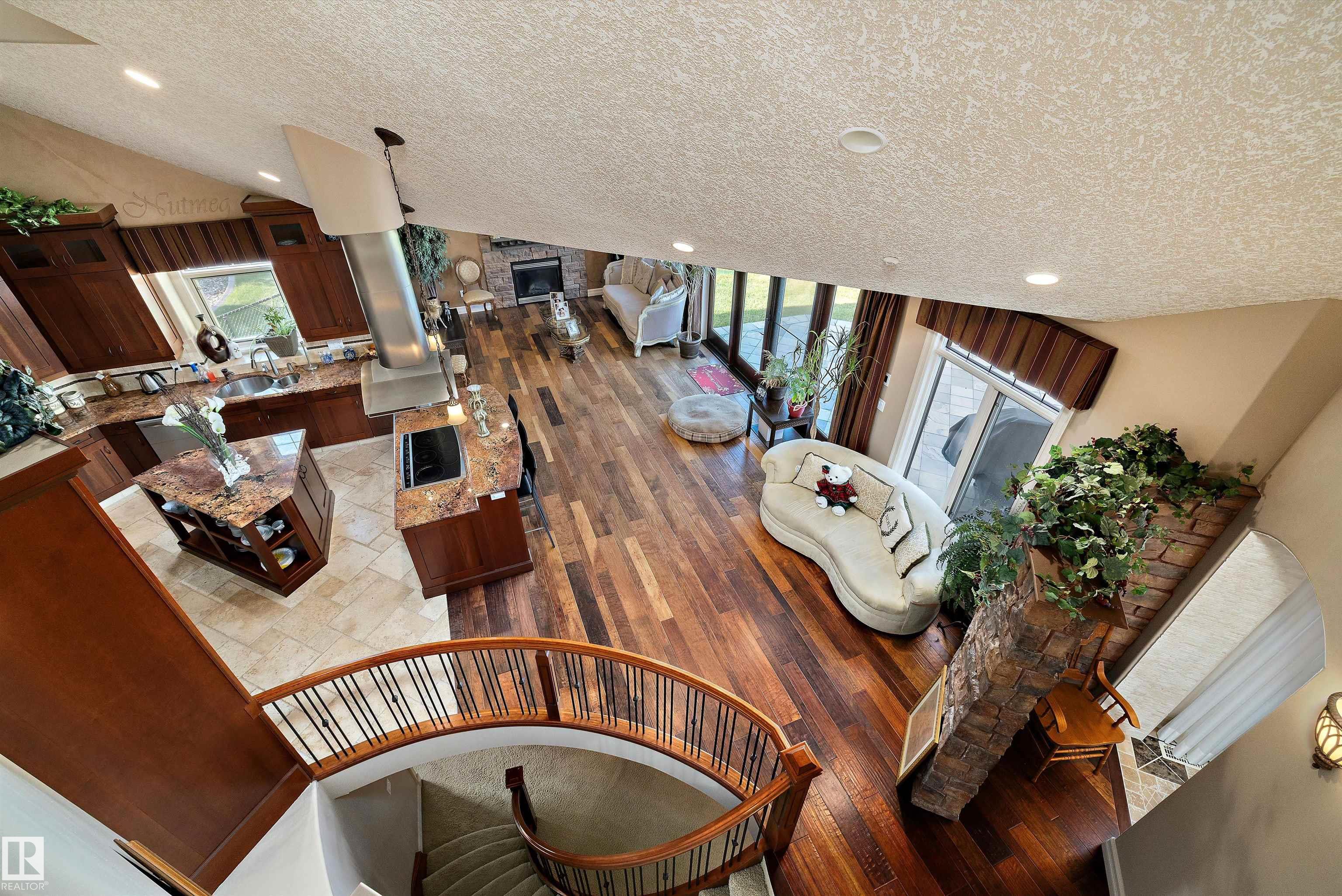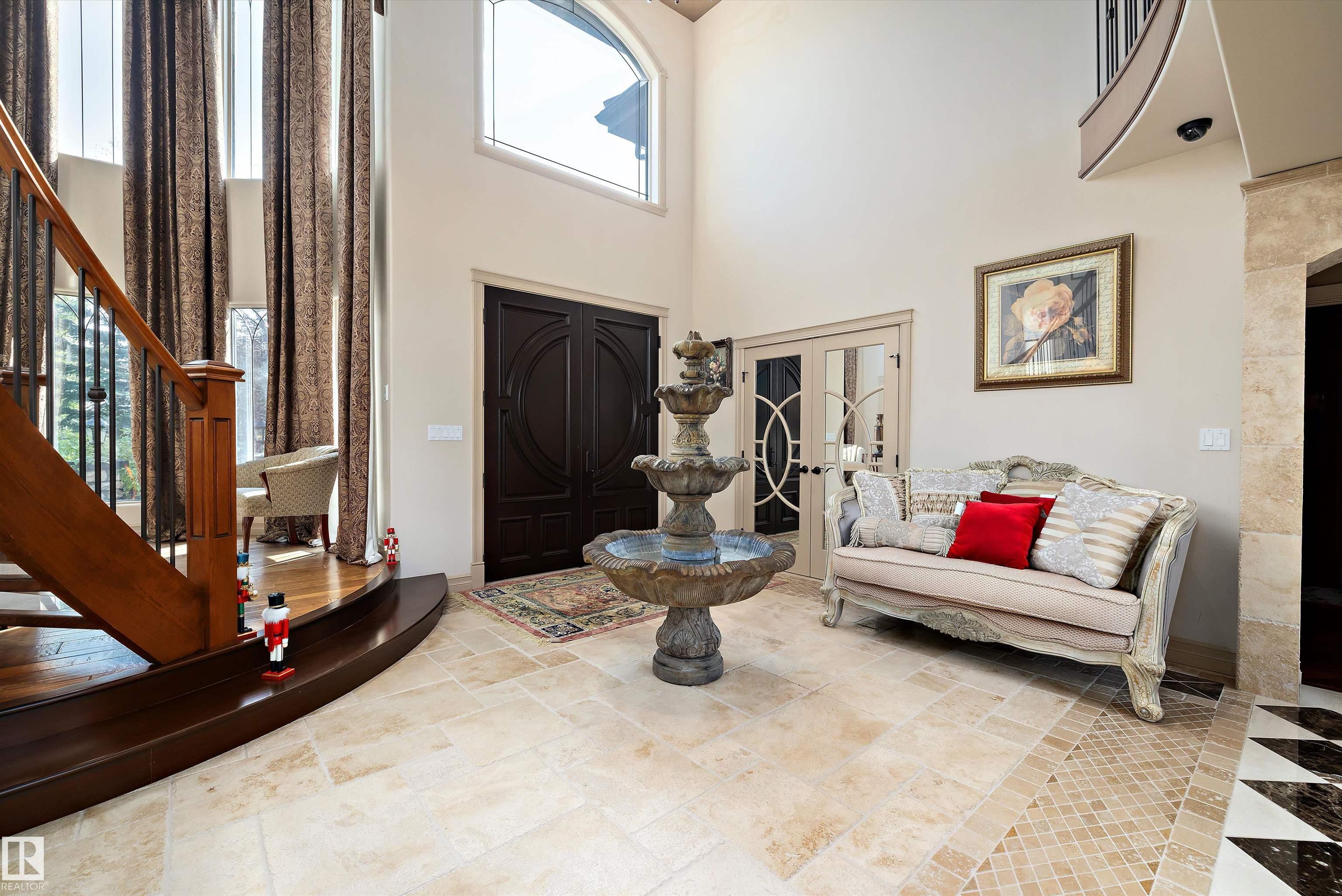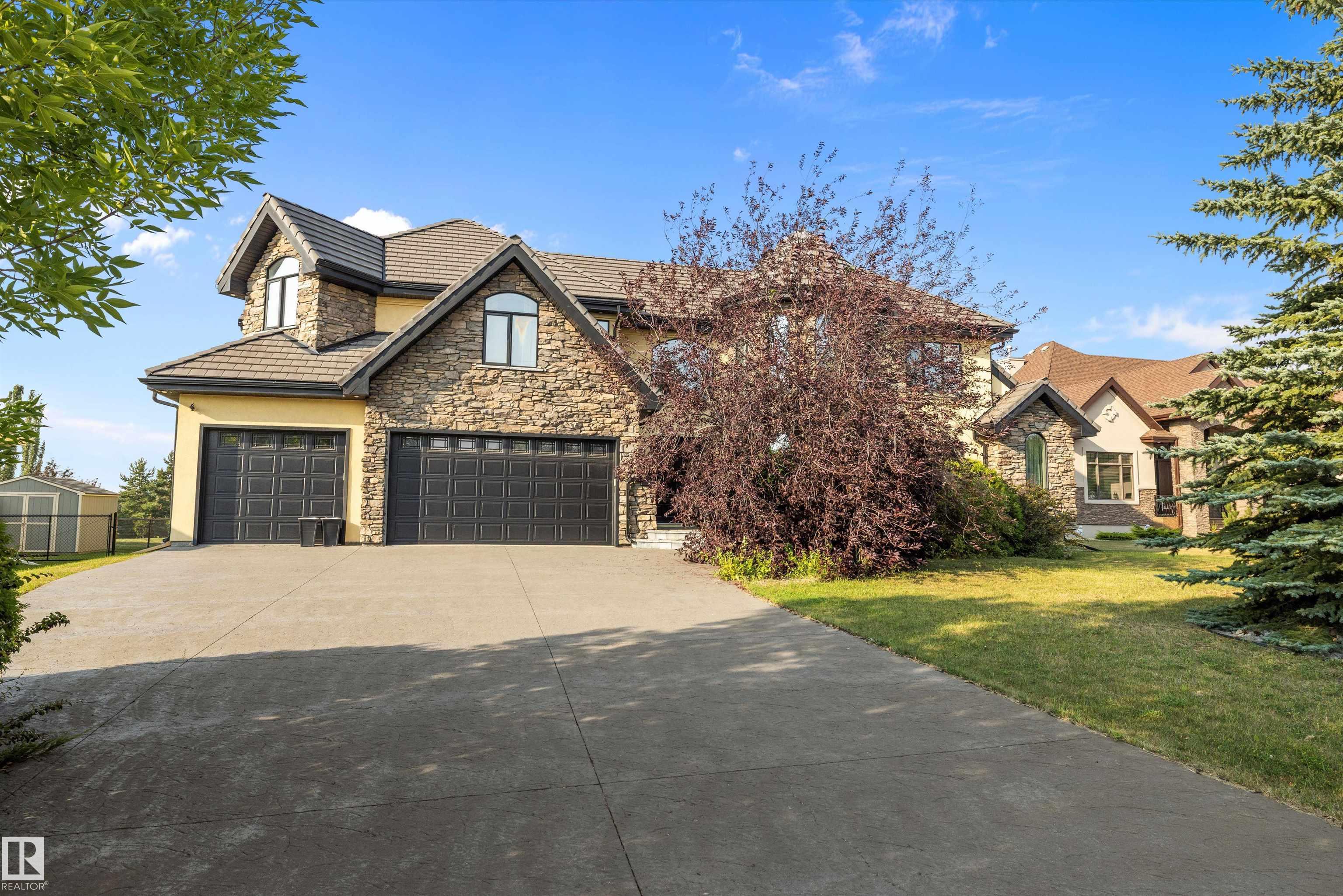This could be the home you have been waiting for minutes from Edmonton & St. Albert. This 3687 sq. ft. 6 bedroom 2 storey is situated on a half acre fully serviced lot in Tuscany Hills. This home features geo-thermal heating and cooling, concrete roof tile shingles, smooth acrylic stucco exterior, Tumbled travertine floors, fumed cherry hardwood, cherry cabinets with granite counters throughout, gourmet vaulted kitchen with dual islands and 66" wide fridge/freeze. The primary bedroom has an ensuite with round jetted tub and Kohler digital shower system. The curved cherrywood staircase with marble inlays takes you upstairs to 3 additional bedroom two with their own ensuites. The downstairs features a theater room, large rec room with bar and fireplace, plenty of storage and utility room. Park your vehicles in the triple attached garage. This home has too many features to mention but you won't be disappointed.