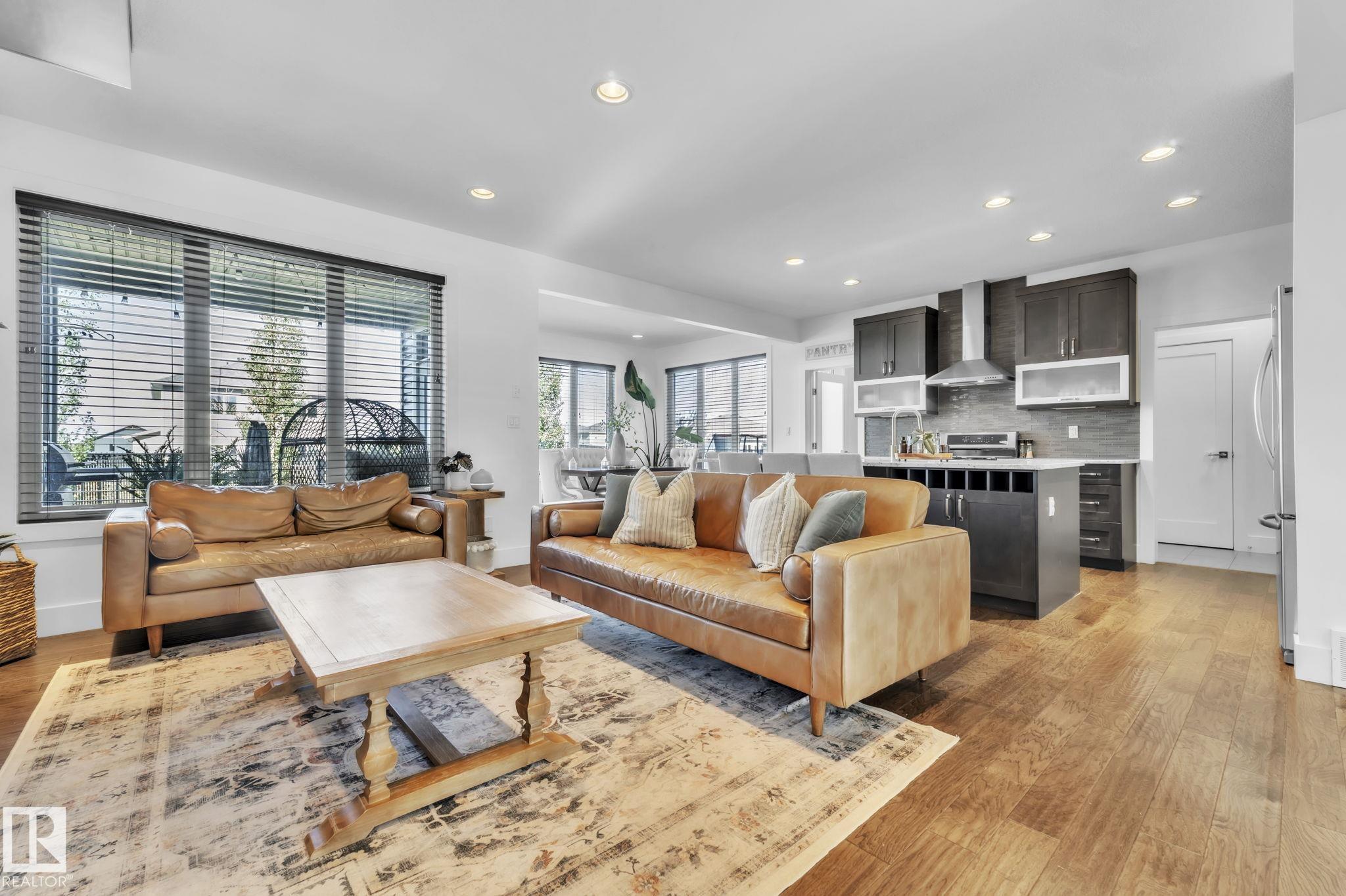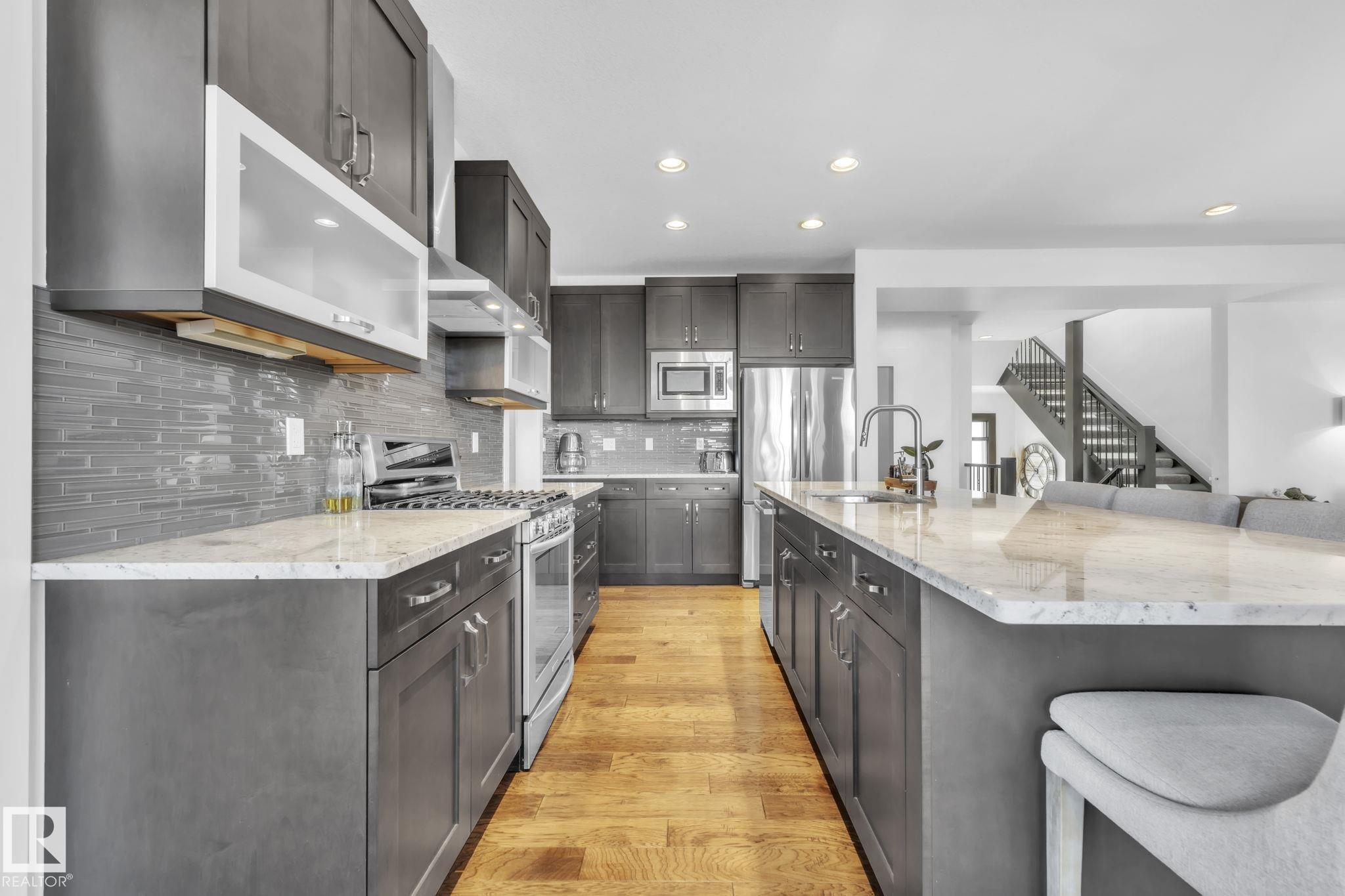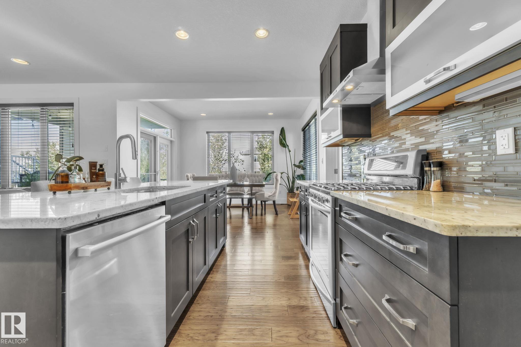 This STUNNING, custom designed 2 storey stands apart with a unique and well appointed floorplan unlike any other! Featuring, 9' ceilings, this home blends style, comfort and functionality! The main floor offers a spacious living room with striking gas fireplace feature wall, a chef's kitchen with solid wood cabinetry, granite counters, gas stove and a massive walk through pantry, plus convenient main floor den and abundant storage. Upstairs, you will find a bright bonus room, 2 large bedrooms and luxurious primary suite with a spa like ensuite and walk in closet. The newly finished basement expands your living space with 4th bedroom, den and huge recreation room PLUS massive storage. Outside, enjoy a fully fenced yard with a deck AND patio area, all backing onto walking trails leading to scenic river valley & paths. A heated garage that fits TWO full size trucks complete the package. Located within walking distance to playgrounds - this home truly HAS IT ALL!