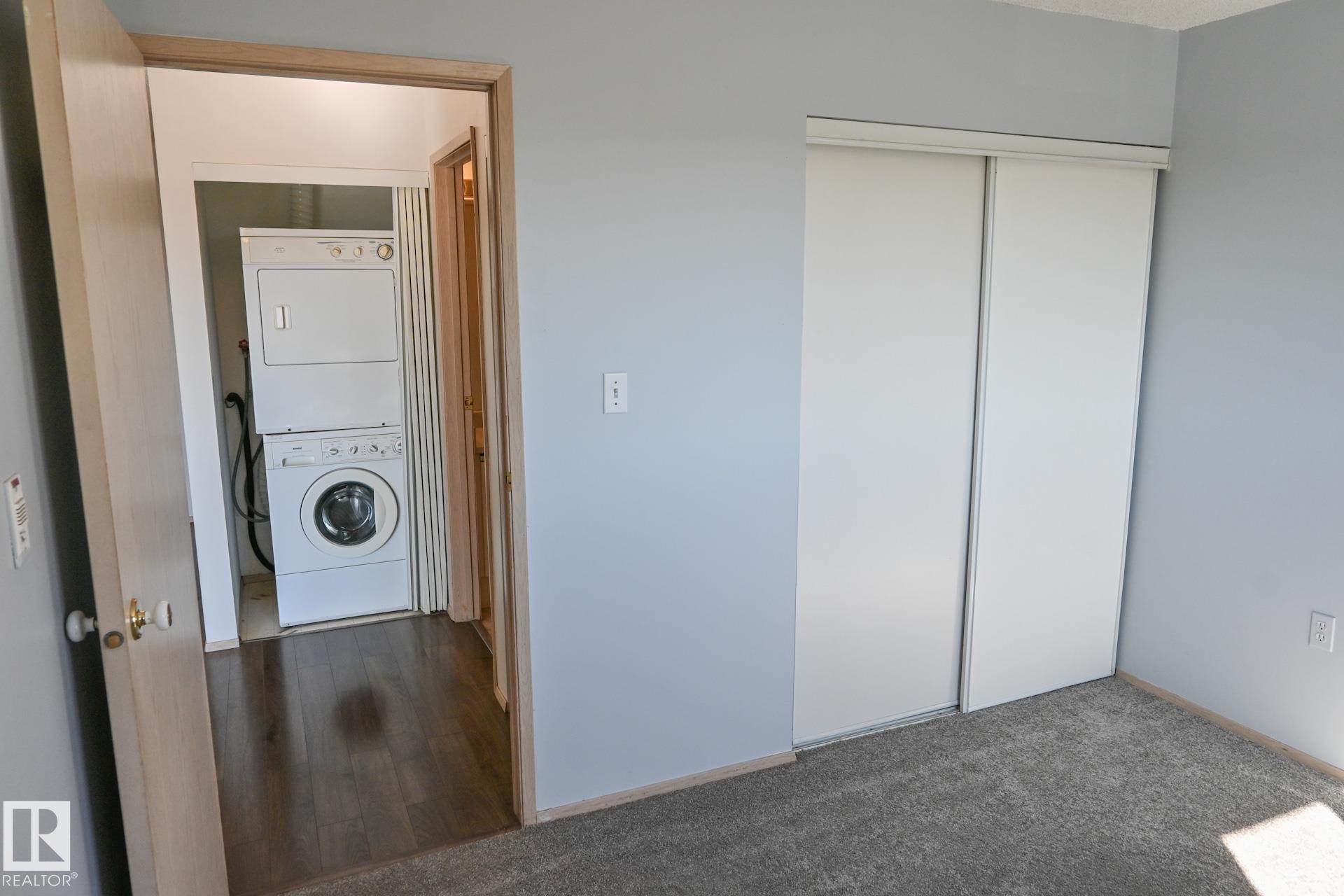 Bright top-floor 2 bedroom, 2 bathroom condo offering 789 sq ft of comfortable living space in the heart of West Edmonton — just steps to public transit and minutes from groceries, shopping, and West Edmonton Mall. This well-maintained unit features an open-concept layout with newer laminate flooring in the living areas and bathrooms, brand new carpet in both bedrooms, and fresh paint throughout. Enjoy a spacious living room with access to your private balcony, perfect for relaxing or entertaining. The kitchen offers ample cabinet space and flows nicely into the dining and living areas. The primary bedroom includes a walk-through closet and full ensuite, while the second bedroom and full bath are privately situated on the opposite side — ideal for roommates, guests, or a home office setup. Great accessibility with 2 elevators- one just out the door that leads to an entry across from the parking stall that comes with this unit!