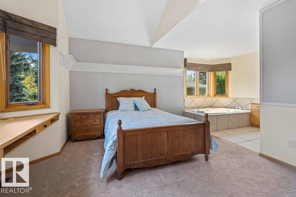 This 4876 sq.ft. 2-storey is situated in a quiet Oleskiw location, backing the 12th hole of the Edmonton Golf & Country Club. With a classic design and modern upgrades, this home is perfect for those looking style, function and a great space for entertaining. The home has 6 bedrooms, 8 bathrooms, finished lower level, and a gorgeous landscaped yard with salt water pool and patio area. As you enter you are greeted with vaulted ceilings, spiral staircase, amazing natural light and Brazilian cherry hardwood throughout the main. The upgraded gourmet kitchen has high-end appliances including gas cooktop, massive island, granite counters, coffee bar & access to the solarium area with hot tub. The upper level of the home has 4 bedrooms, with an impressive primary that includes a n/g fireplace, steam shower, soaker tub, and balcony views of the yard and greenspace. Features of the home include: sun rm new roof, hydronic heating (newer boiler); upgraded HVAC; A/C; 3 fireplaces and heated triple attached garage.