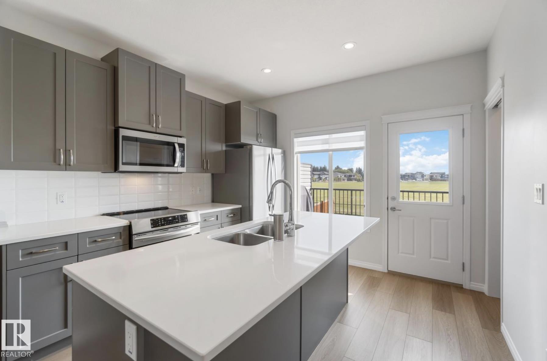 Welcome to this beautiful corner-unit 2-storey home in sought-after Glenridding Ravine, offering 3 bedrooms and 3 bathrooms with thoughtful design throughout. All bedrooms are generously sized with ample closet space, and the master suite features a private ensuite for comfort and convenience. The main floor showcases an inviting open-concept layout that seamlessly connects the living room, dining area, and modern kitchen, complete with striking sterling-grey cabinetry, quartz countertops, and a timeless subway tile backsplash. Perfect for families and entertainers alike, the property also includes a rare oversized tandem double garage that is insulated, heated, and equipped with both a drain and water connection. Step outside to a large back deck and enjoy peaceful views of the green space behind the home—an ideal spot to relax or host gatherings.