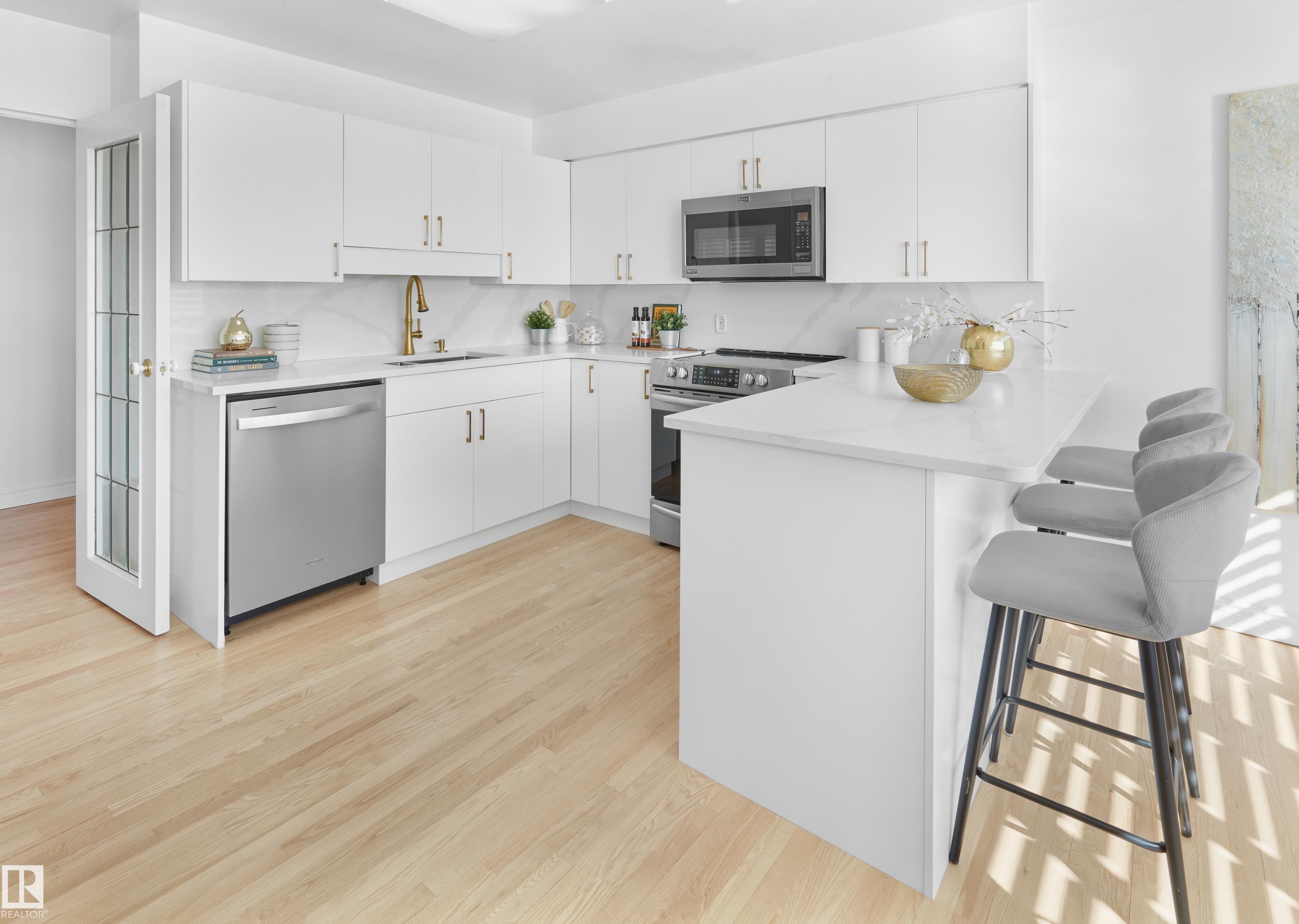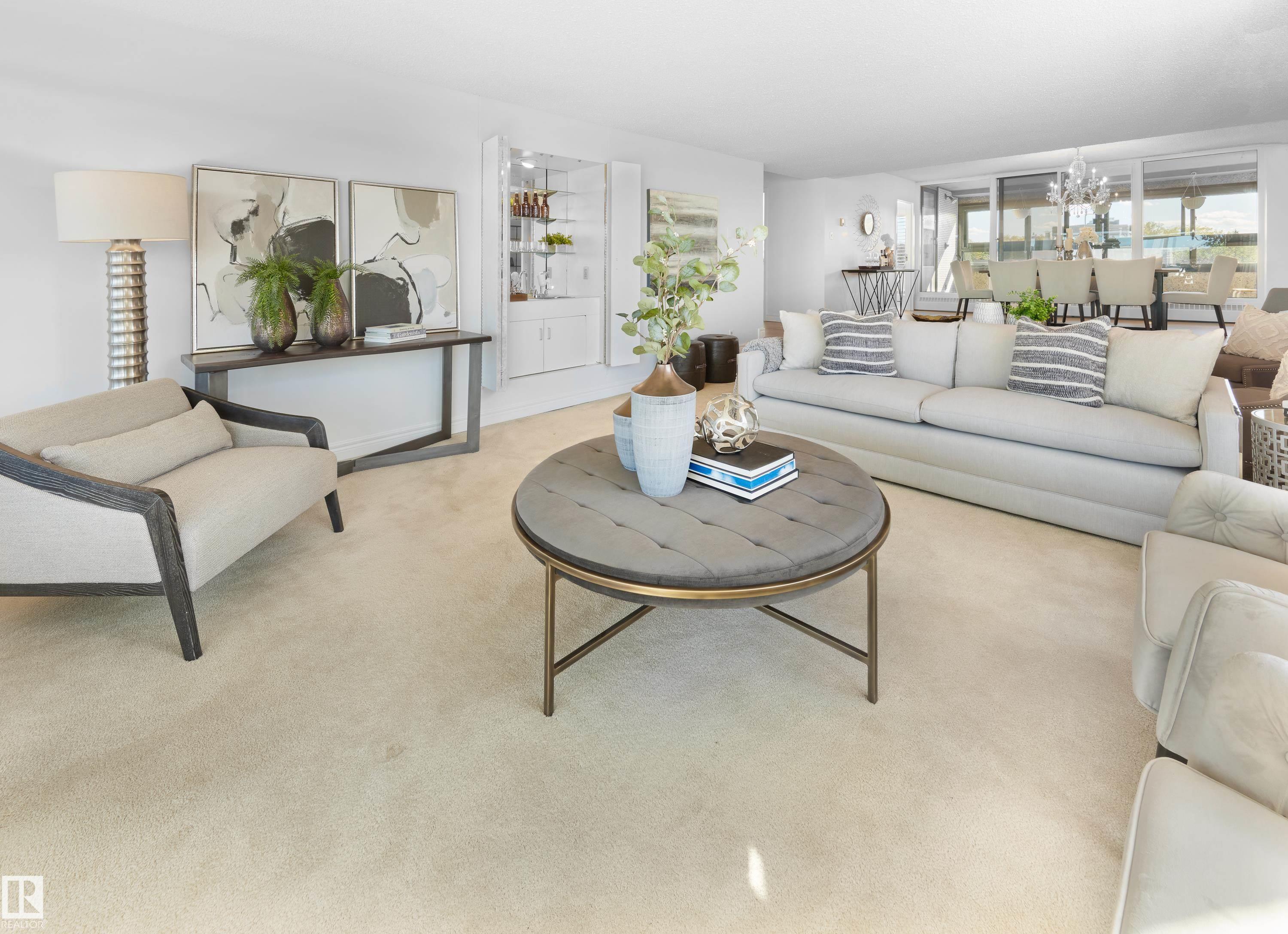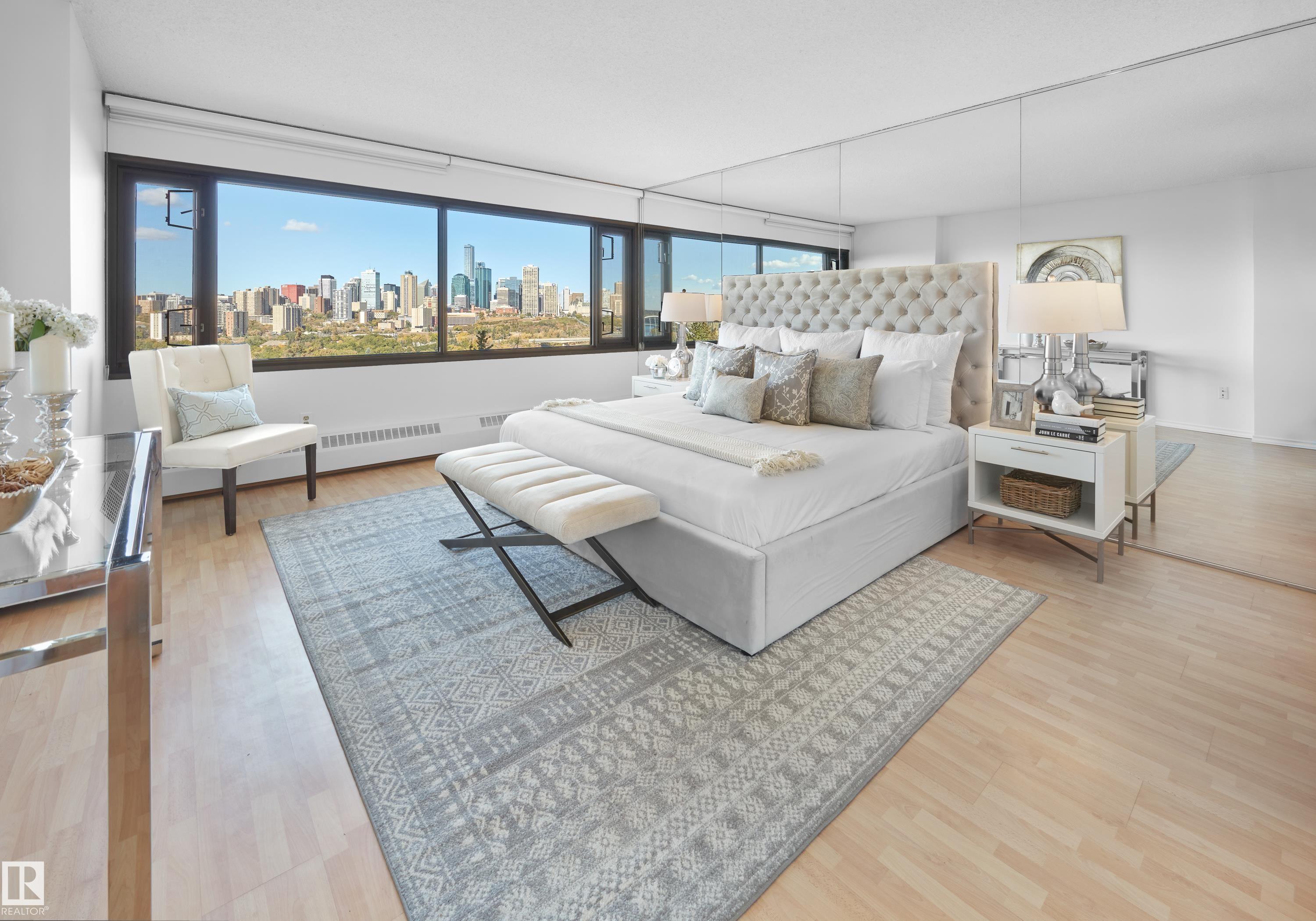 Welcome to executive LIVING at 9929 Saskatchewan Drive — a truly one-of-a-kind 2200 SQFT condo offering unparalleled panoramic views of Downtown Edmonton and the River Valley, framed by the beauty of mature trees and lush greenery. This stunning 2 bed, 2 bath home features a sunroom, den, balcony, wet bar, and 2 titled underground parking stalls with storage unit, perfectly designed for luxurious comfort. Enjoy a modern white kitchen with quartz countertops and new stainless steel appliances, elegant marble tile and hardwood flooring, custom cedar built-ins, and a spacious Primary suite with walk-through closet and 5-piece en-suite. The expansive living and dining areas flow together into the sunroom, where the skyline and treetop views create an inspiring backdrop year-round. Amenities include a pool, jacuzzi, sauna, gym, games room, party room, and en-suite laundry, with all utilities included. Steps from Millcreek Ravine, River Valley trails, U of A, top restaurants and the Strathcona Farmer's Market!