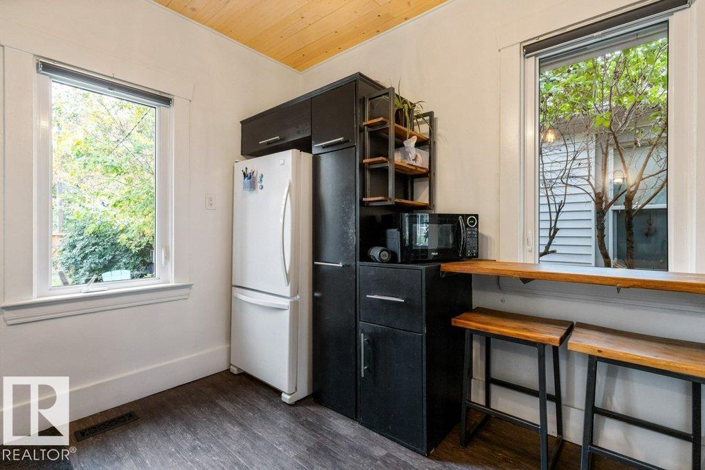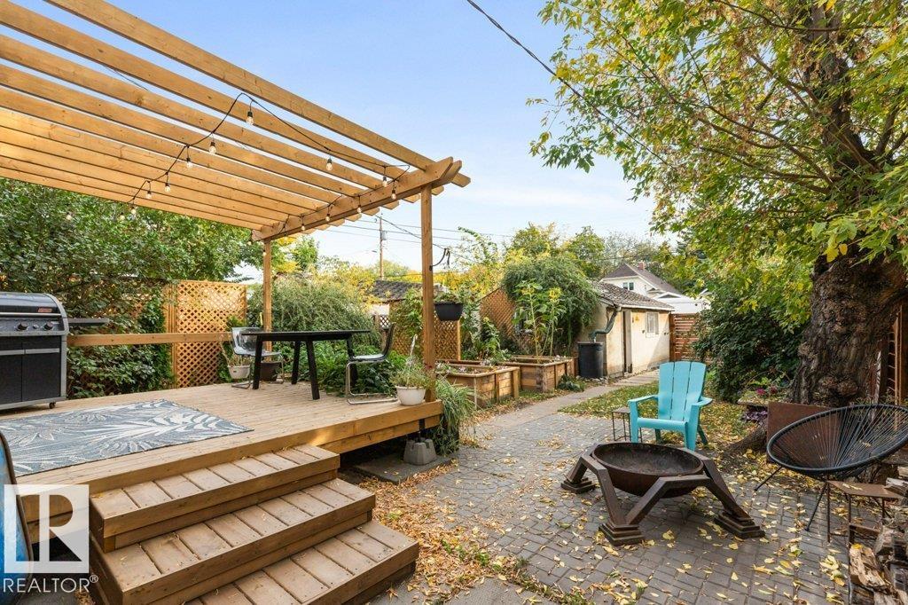 This 1927 Historic Highlands bungalow masterfully blends industrial-modern updates with its original charm and character. Nestled on a quiet, tree-lined street, this 2-bedroom residence offers a highly sought-after, serene lifestyle just steps from the beautiful River Valley and Highlands District shops. The main floor features a cozy living room with the original decorative fireplace, plus a bright, heated, insulated front porch—ideal for quiet reading or yoga. The modernized kitchen showcases an on-trend industrial aesthetic with open shelving and a custom breakfast bar. Two bedrooms and a full four-piece bath with a charming clawfoot tub/shower, form a comfortable main-level retreat. The full, open basement awaits your design vision for future development, with plumbing rough-in for a second bath, offering excellent equity potential. Outside, the fully fenced, landscaped yard is an oasis, featuring raised garden beds, a shed, a new deck with a pergola for entertaining, and a single detached garage/work