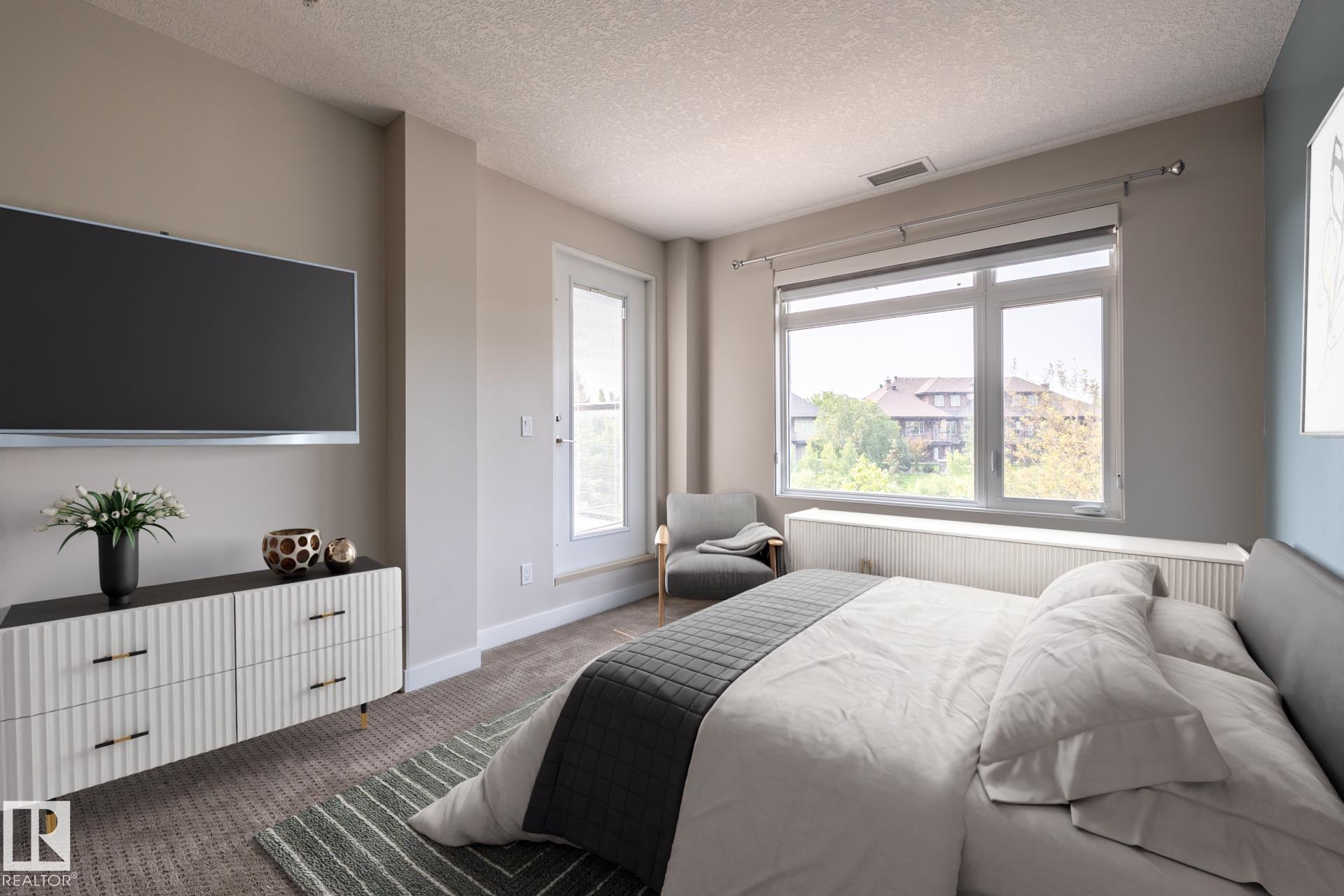 2-Storey Executive Townhouse-style Condo. 3 Bedrooms (1 on main level, 2 upper level) and 3 Bathrooms (2 full bathrooms upper level and 1 half bathroom in lower level). Master Bedroom (upper level) has walk-through closet and ensuite bathroom. Private Double Garage (heated) underground. Park your vehicle and walk into your home. This Condo also has 1 extra Parking stall underground (heated) - (about 20 feet from your private Double Garage). This Condo unit faces "South", so there is plenty of natural light. This unit also faces the pond and quiet walkway. Large main level patio and also an upper level deck, with access from the 2 bedrooms. Unit has HEAT and Air Conditioning. Some photos attached are virtually staged.