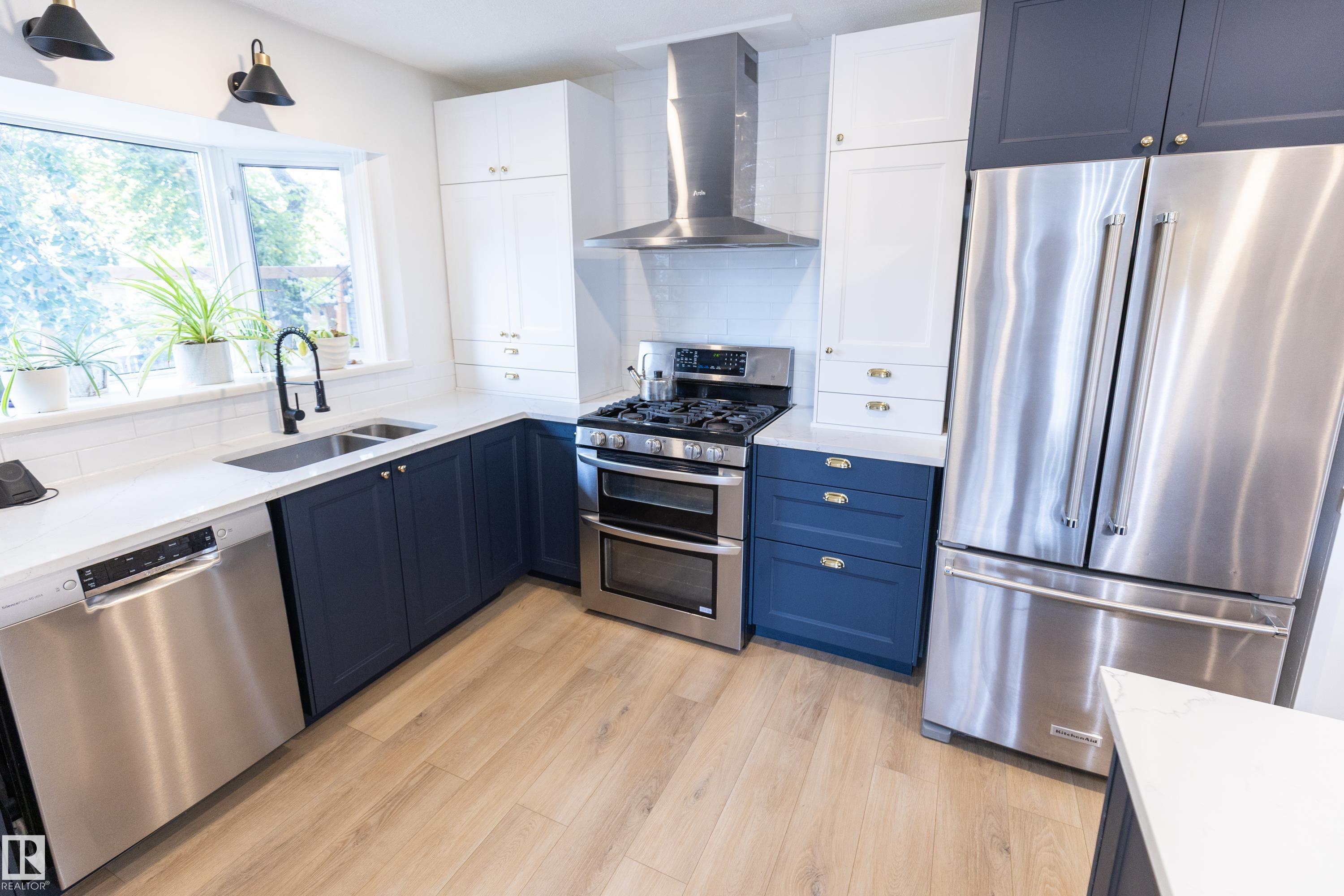 Welcome to this beautifully updated bungalow. The low-maintenance front yard is designed with rock flower beds and walkways that lead to a spacious front entry featuring a built-in seat & feature wood wall. Inside, the bright & open living room offers a large window that floods the space with natural light & showcases new vinyl plank flooring. The stunning, fully renovated kitchen boasts a tile backsplash, quartz counters, stainless steel appliances with gas stove & a huge island seating five that opens to a dining area with custom storage cabinetry. Wainscoting & a gorgeous wood beam add warmth & character throughout the main floor. The primary bedroom has its own two-piece ensuite, & with two additional bedrooms & a four-piece bath this completes the main level. The fully finished basement provides a family rm, flex space, den, laundry rm & a fourth bedroom with an ensuite. The single detached garage, along with a fenced backyard, deck & tree house make this home ready for endless summer fun.