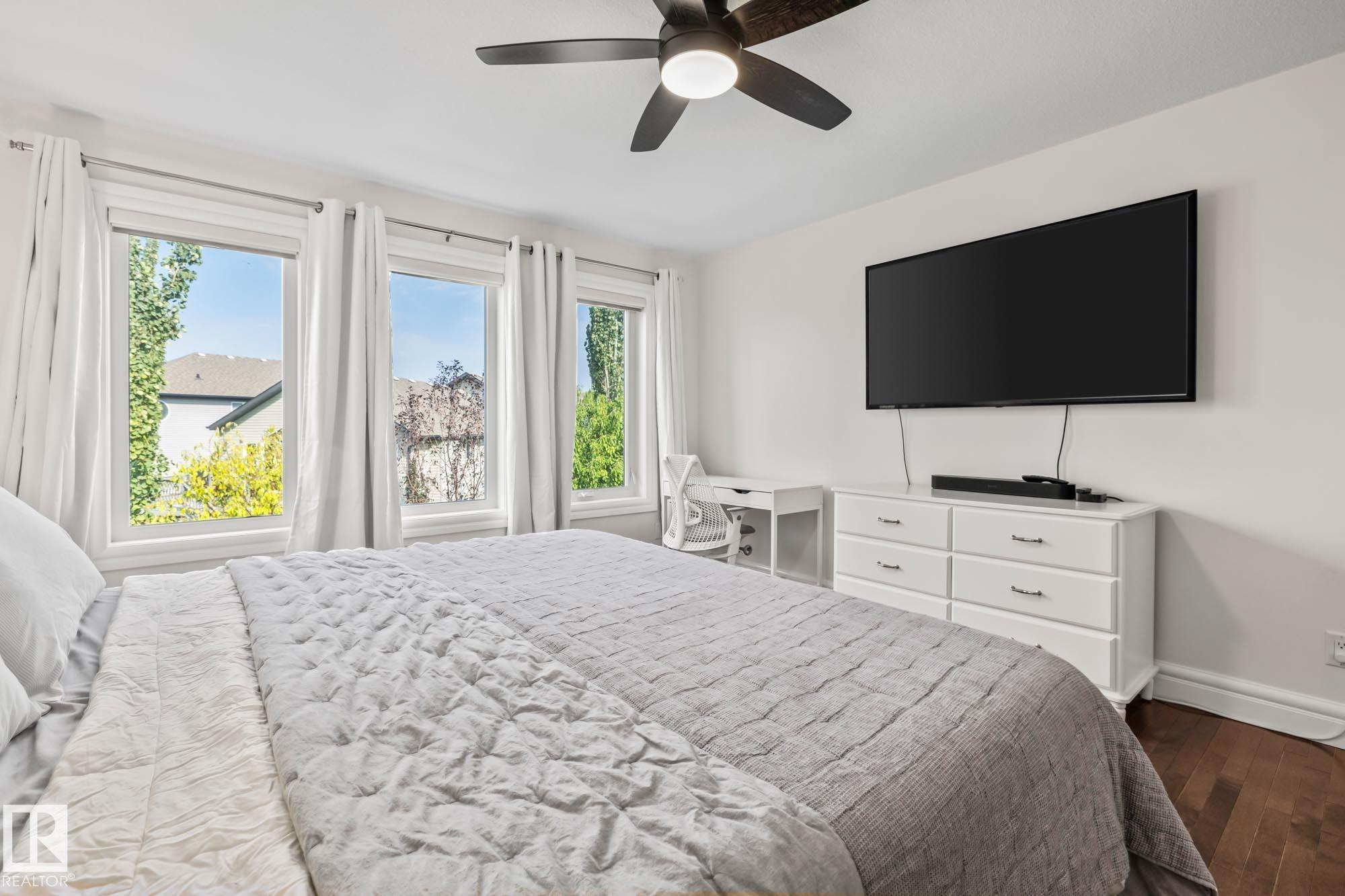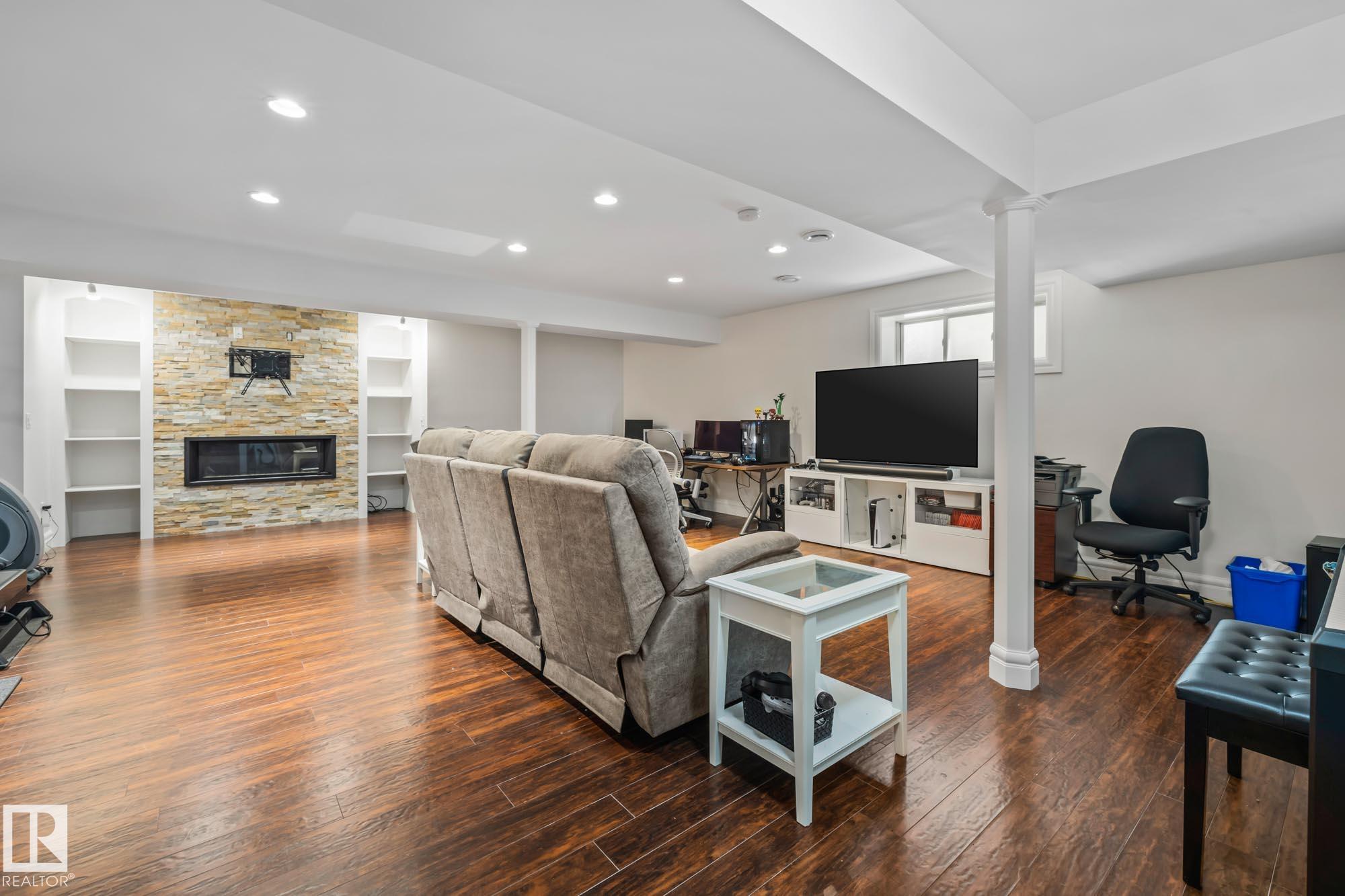 With over $100K in upgrades, this Summerwood 2 storey is truly move in ready. Offering 4 bedrooms, 3.5 baths, and an oversized insulated double garage, it blends modern style with everyday function. The main floor features a chef’s kitchen with granite island, professional gas range, refinished cabinets, new backsplash, updated sinks and hardware, opening to a bright living room with stone fireplace. Upstairs, a spacious bonus room, two bedrooms, full bath, and convenient laundry surround the luxurious primary suite with walk in closet, wet bar, and spa inspired ensuite with soaker tub and glass shower. The finished basement adds scraped hardwood floors, a second fireplace, large rec room, flexible fitness or office space, and an additional bedroom with a full bath nearby. Key updates include fresh paint, lighting, hot water tank, water softener, furnace motherboard, washer, dryer, and a remodeled powder room. Outside, enjoy artificial grass, a stone patio, and built in seating, all close to trails, parks