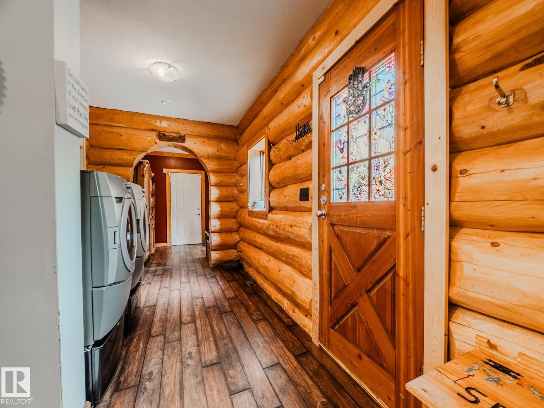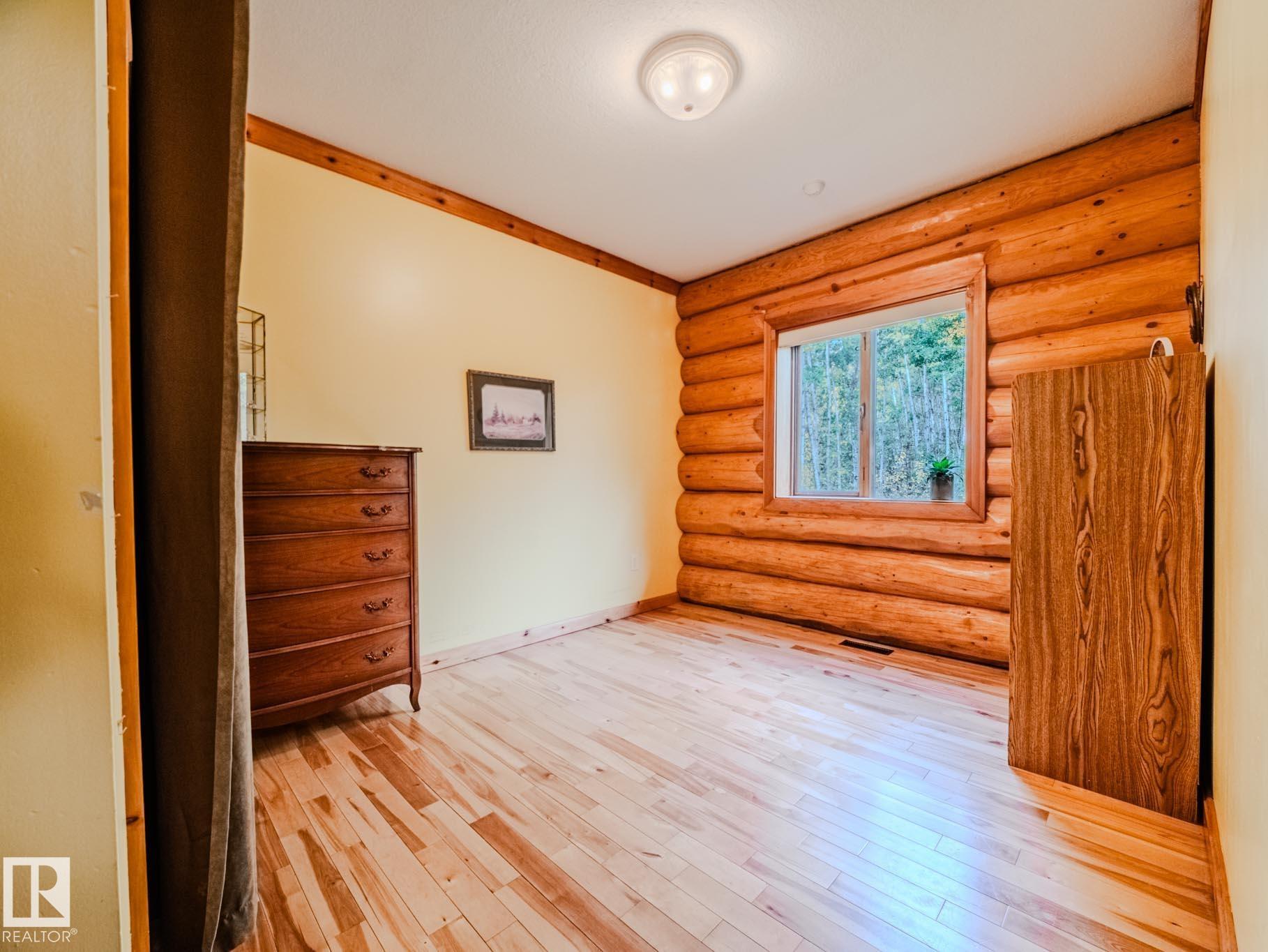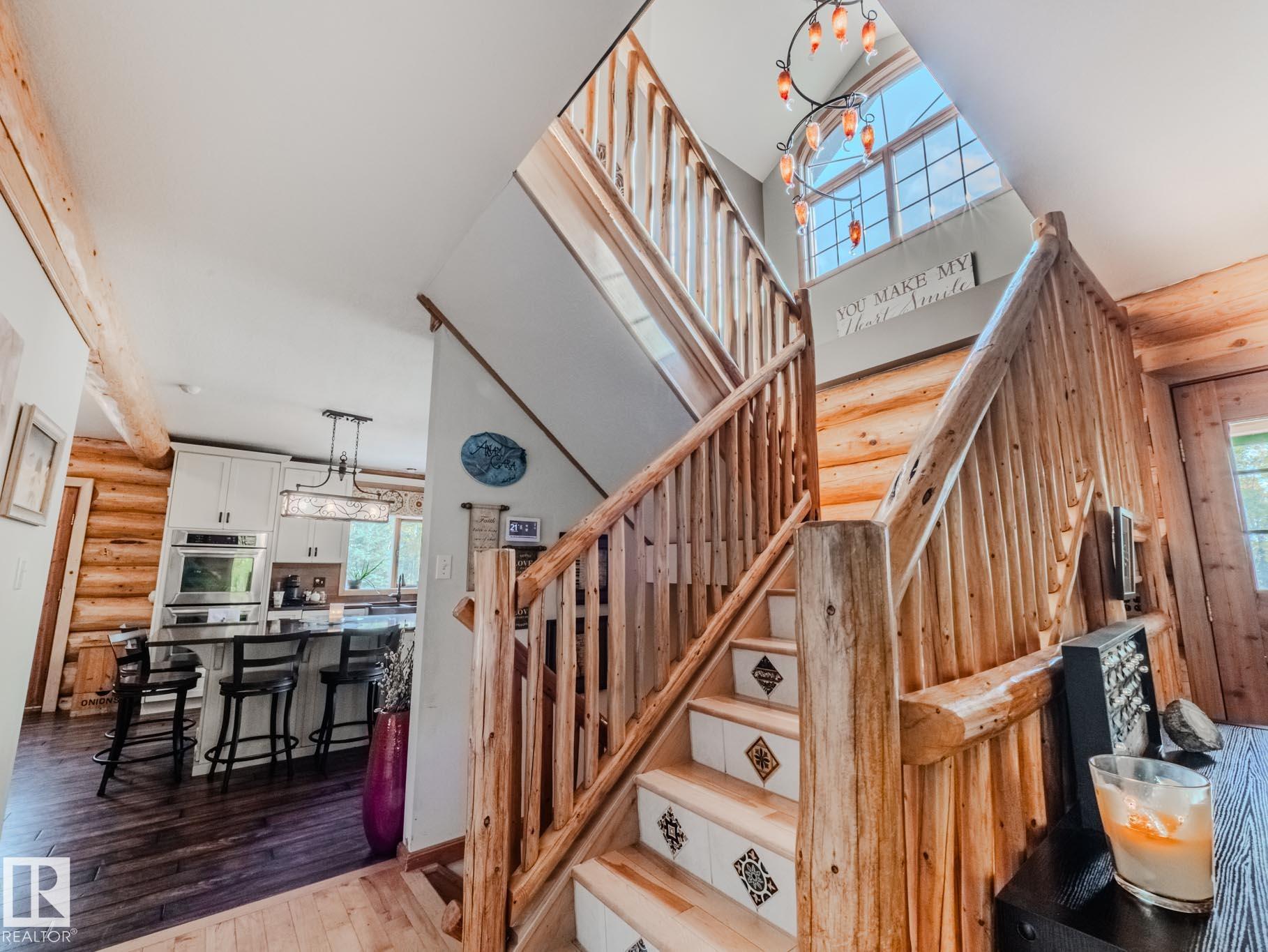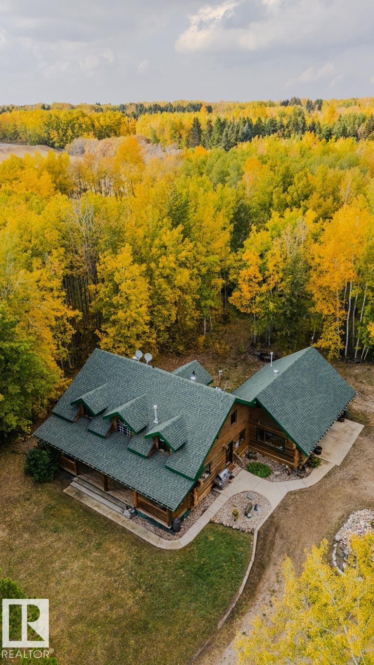 Peace and space on nearly 10 acres in Parkland County, just minutes from Stony Plain and an easy walk to Blueberry School. This handcrafted 2,238 sq ft log home offers 4 bedrooms including a main bed, 4 full baths +half, a home office, main floor laundry & A/C. Rich wood details a striking blown glass chandelier create a warm and inviting retreat. The custom kitchen features iron and glass cabinetry, copper farmhouse sink, granite counters, high end appliances; gas cooktop, built in ovens and a massive island perfect for gathering. Fully renovated basement in 2018. Outdoors, enjoy wide open skies, a serene pond, firepit & three fenced acres ready for animals with shelter and waterers. A steel three bay shop 61ftx48ft with epoxy floors, in floor heat, hot and cold taps, 220V power, full bath and a loft apartment expand your possibilities. A heated attached double garage, detached garage, cabin with its own 2pce & septic, ice rink & RV hookups complete this rare country sanctuary with quick access to town.