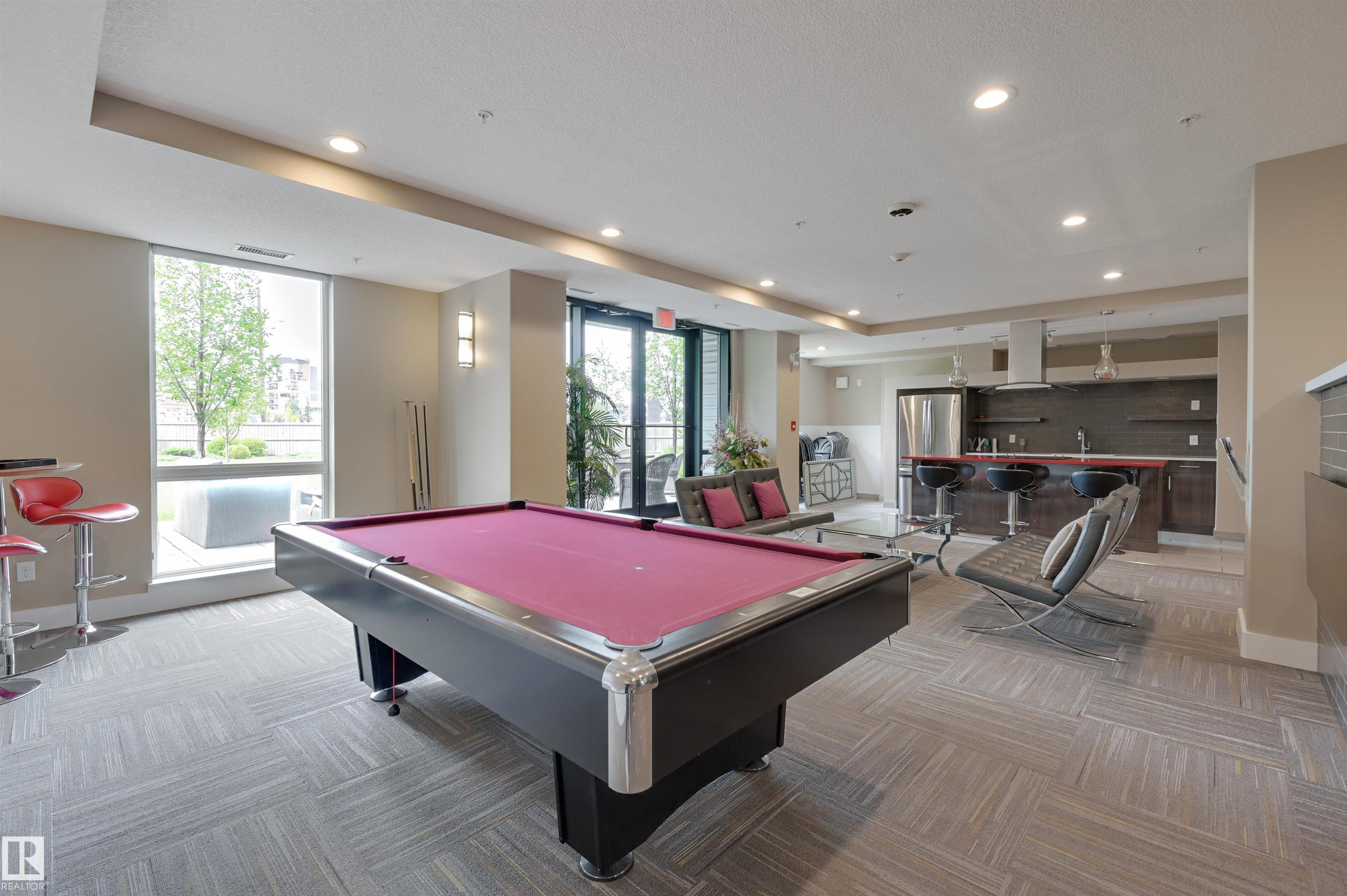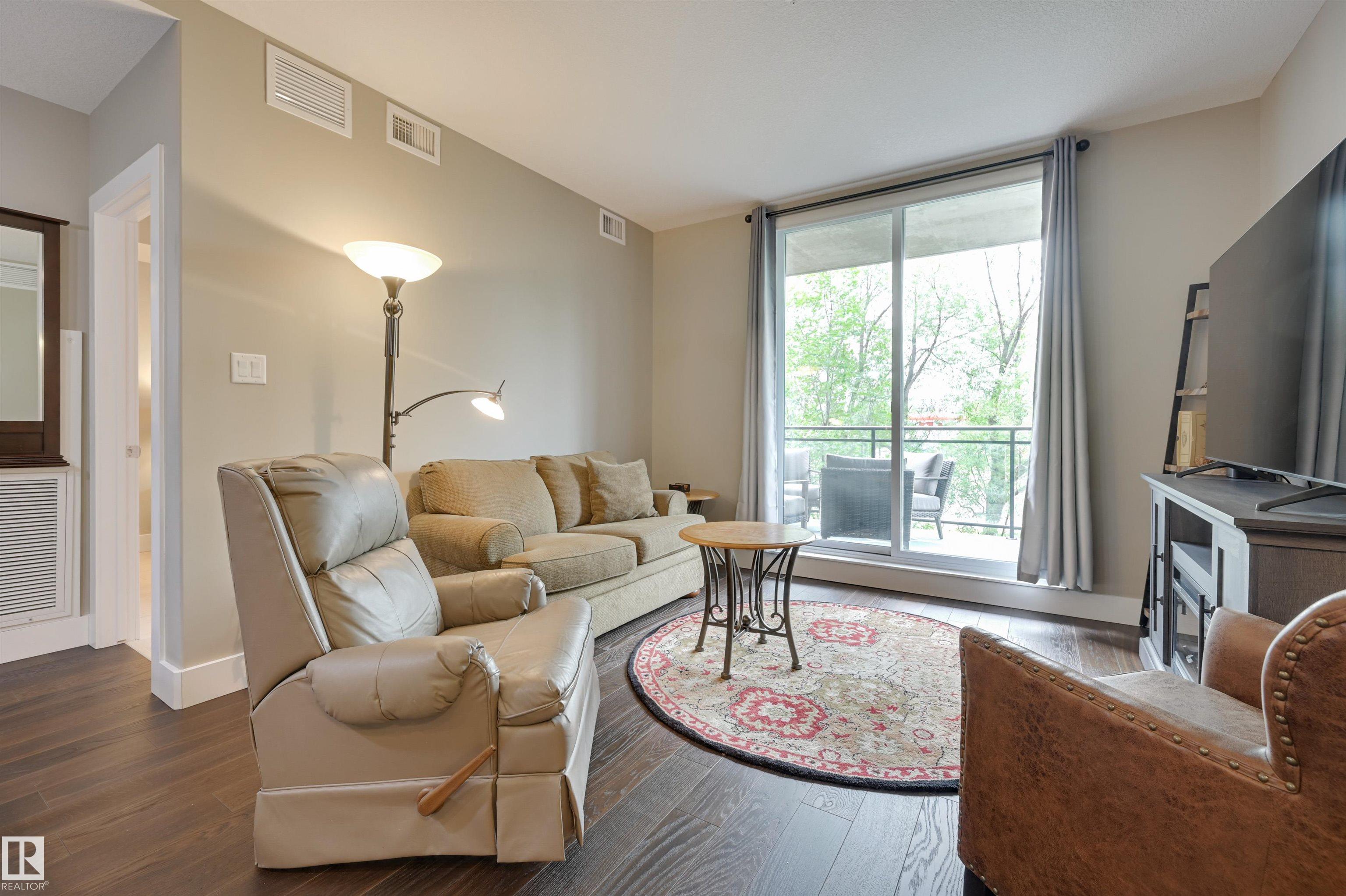 LIKE NEW! Stylish 2 Bed, 2 Bath Condo in the E’SCAPES Building. Welcome to upscale living in one of South Edmonton’s most sought-after concrete buildings. This meticulously maintained 2nd-floor unit features a modern open-concept layout with engineered hardwood flooring, granite countertops, full-height cabinetry, high ceilings, & in-suite laundry. The kitchen includes a peninsula with bar seating, S/S appliances, & tons of cabinetry. The spacious primary bedroom offers a walk-through closet & a private 4-piece ensuite, while the second bedroom is ideally situated next to a full bathroom—great for guests or a home office. Enjoy natural light through the large patio doors leading to a balcony surrounded by trees for added privacy. TWO titled heated underground parking stalls—one conveniently located close to the elevator! Enjoy premium amenities: a fully equipped fitness centre, social lounge with pool table & TWO rooftop patios. Unbeatable location— shopping, dining, parks, trails, & quick to Henday.