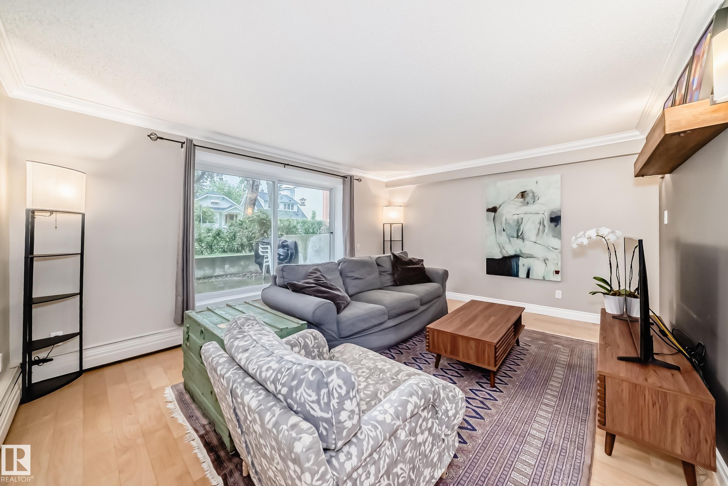 Discover the perfect blend of comfort, privacy and convenience in this spacious corner-unit condo. Ideally located on the ground floor, this quiet and private home offers a rare walk-out patio set in a peaceful, secluded setting - perfect for morning coffee or evening relaxation. Inside, you'll find impressively large rooms throughout, including two generously sized bedrooms, a full bathroom, and a private en-suite complete with a luxurious jetted tub. You'll also appreciate the convenience of the in-unit storage/pantry and a space saving combo Euro washer/dryer. Low condo fees make it even more appealing. Just minutes from the U of A, vibrant shops, restaurants, the farmer's market and the scenic river valley, this home is a true gem for those who value space serenity and a connected lifestyle.