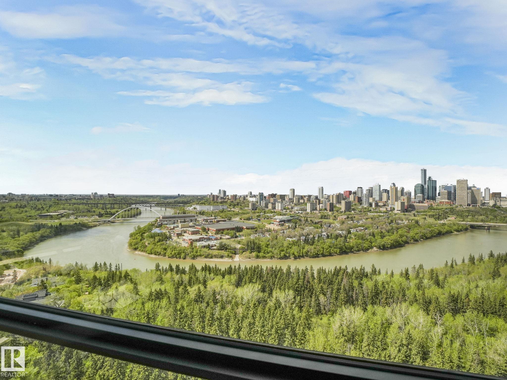 Incredible Price!3800 FT2 with the most amazing 3 direction views of river valley, downtown and south Edmonton! Location, views and quality of this bldg are Edmonton's Best! Great value! 3 Bdrms, 4 baths! Enjoy south view in bright sunny White kitchen with laminate flooring, Lge kitchenette area, island & desk area! Lge enclosed south balcony. Lge formal dining rm overlooking oversized living rm with cozy conversation pit with electric brick fp! Watch tv in the family rm with built in bar! Room for everyone with 3 large bdrms plus den! 3 ensuite baths! Tons of storage & in suite laundry. Master bdrm is huge with a walk in closet, 6 pce ensuite bath and sitting rm with extra closets! Every room has a view! Building totally upgraded, including all new windows in past years & is meticulously maintained! Enjoy pool & jacuzzi, workout rm & recreation rm. Condo includes 2 underground parking stalls. Walk to Whyte Ave, 5 mins to U of A, downtown and steps to river valley bike & walking trails! Live in luxury!!