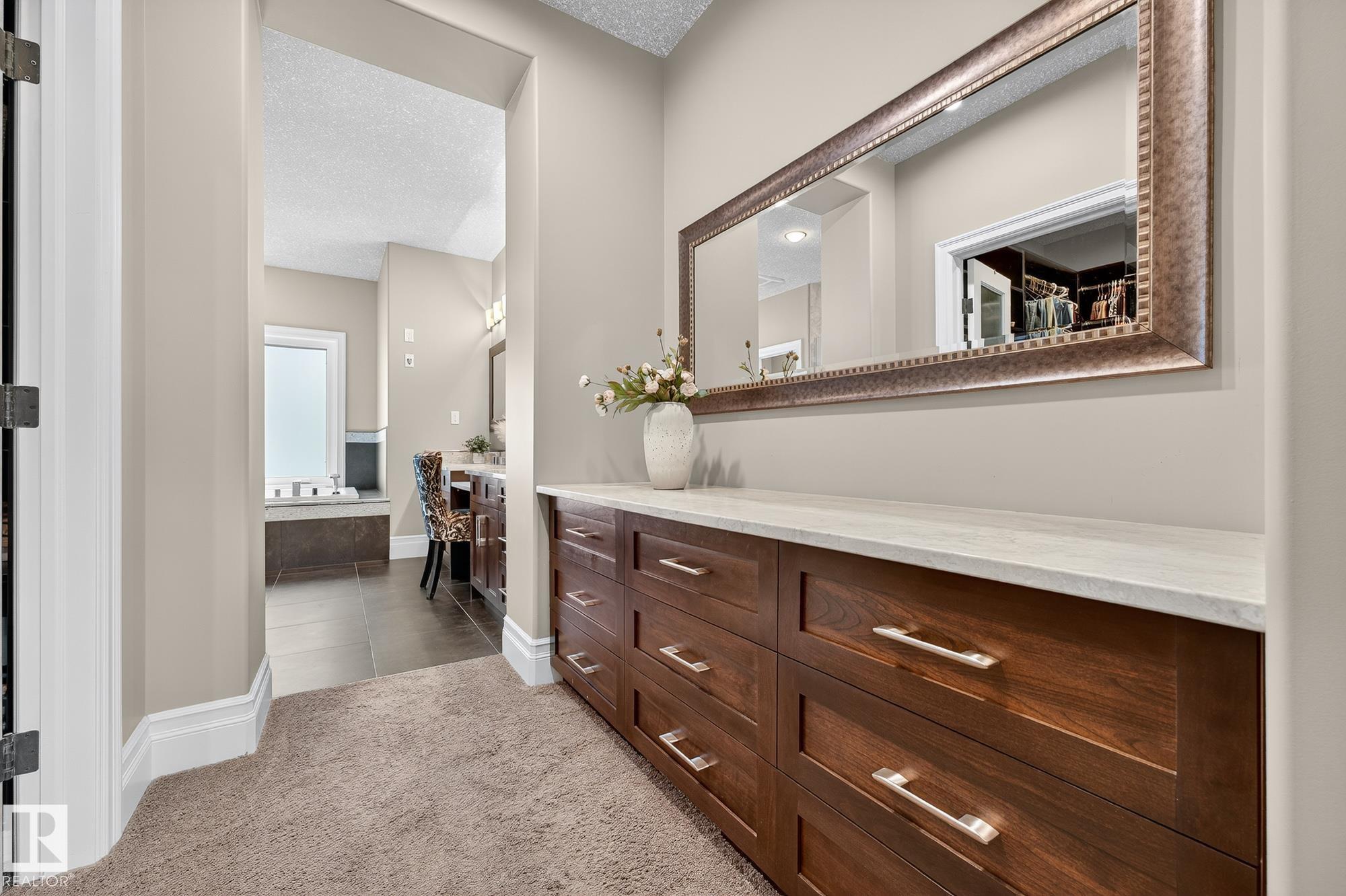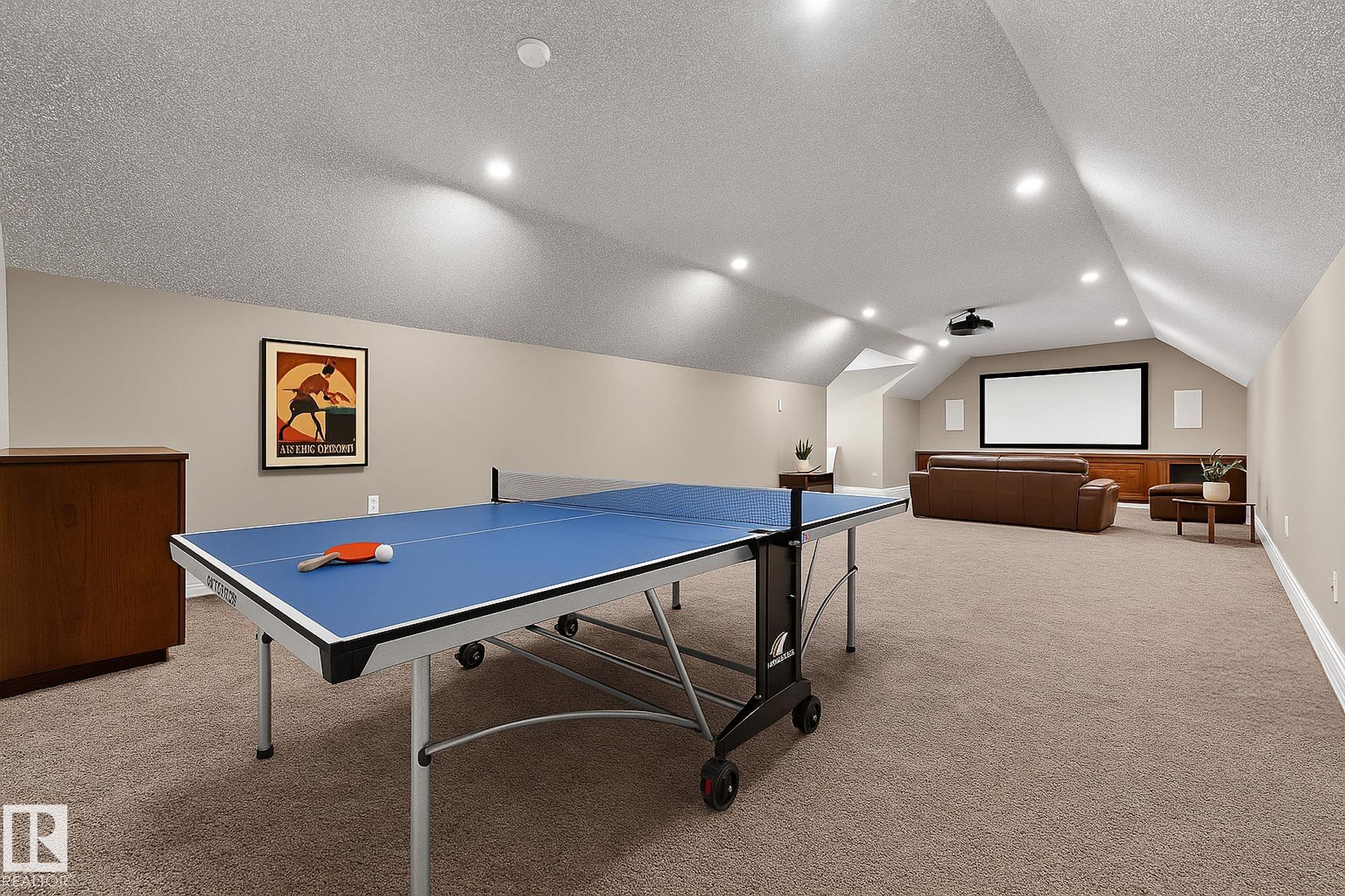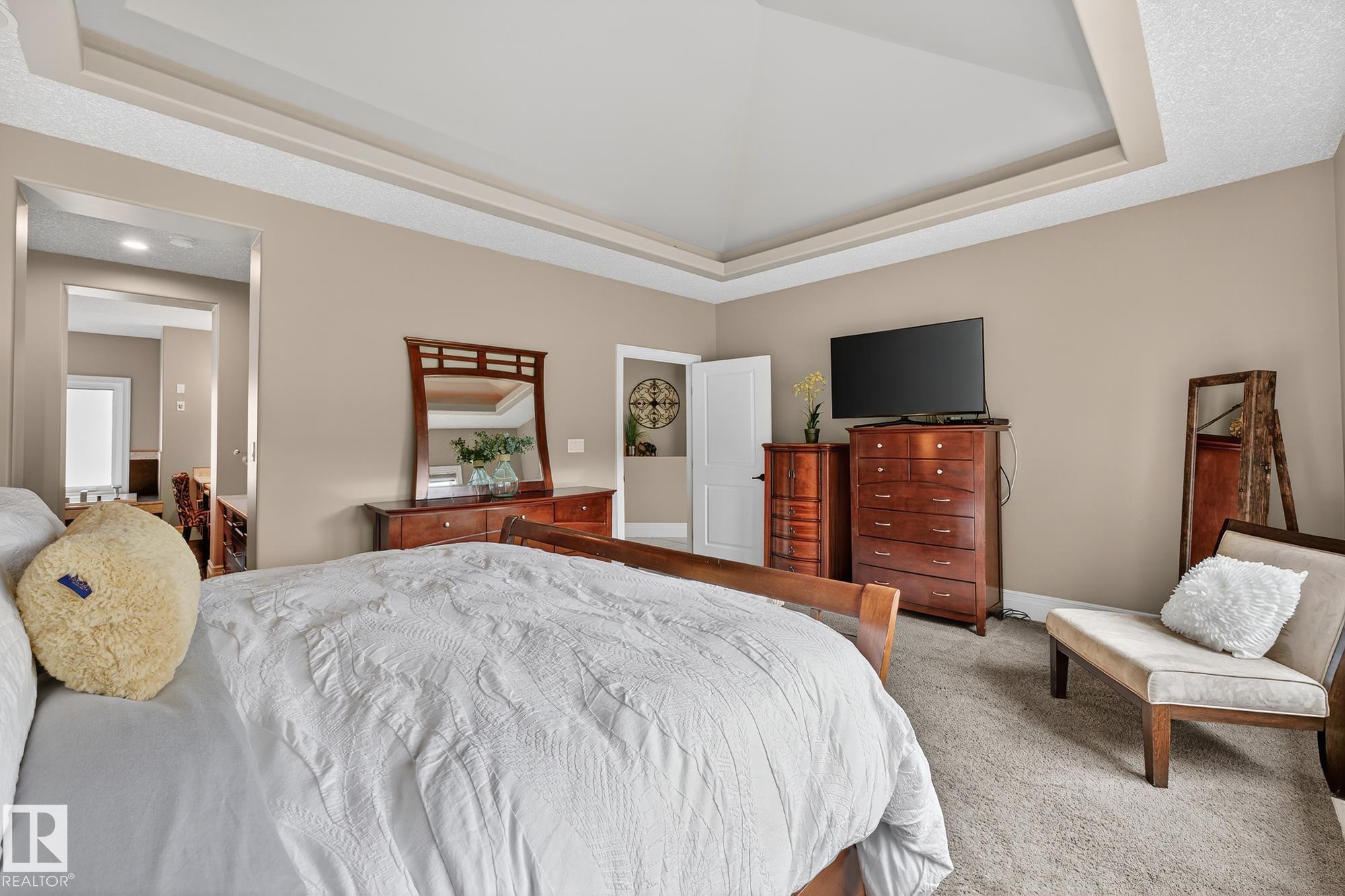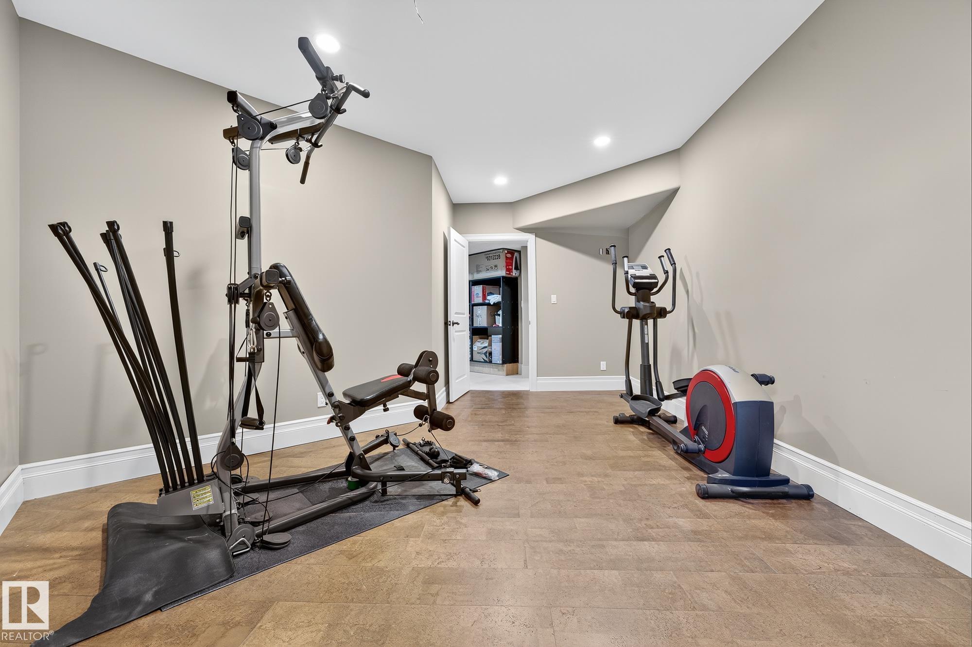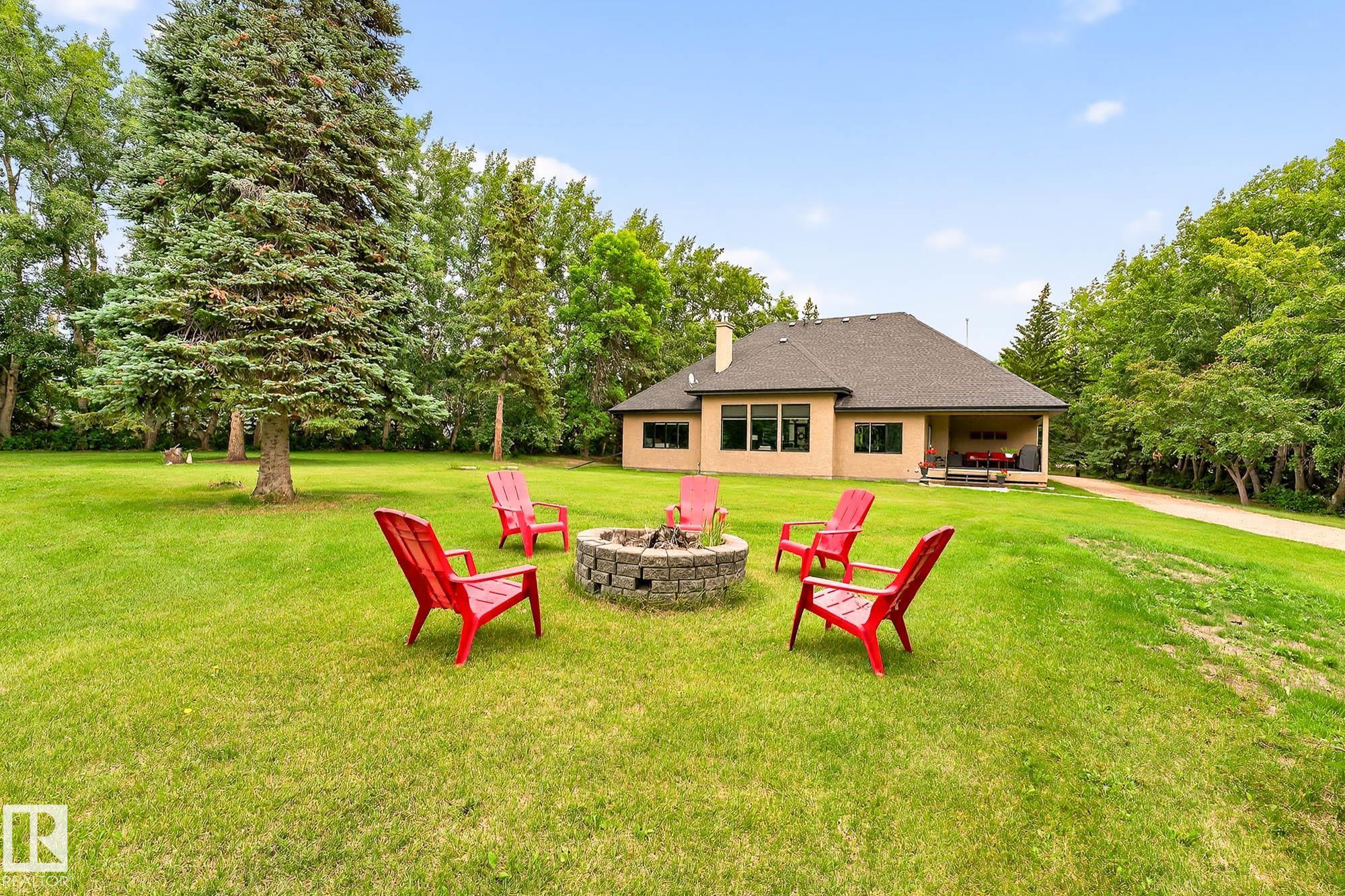 Welcome to Namao Ridge! This custom-built bungalow, situated on 1.67 acres, offers upscale living with unparalleled privacy. A dramatic curved staircase set against a stone feature wall, tray ceilings, and wall-to-wall windows elevate the open-concept main level. Enjoy a chef-inspired kitchen with rich cabinetry, granite countertops, and premium appliances, open to the living and dining areas, featuring a striking stone fireplace. The main floor includes the spacious primary suite, a second bedroom, and a formal dining room with architectural detailing. Downstairs features 3 bedrooms, a full bath, a half bath, a home gym, and a spacious rec room with room for a pool table. The show-stopping bar includes custom cabinetry, tile backsplash, and seating. A dedicated theatre room above the 4-car garage is perfect for movie nights. The 1,824sqft heated shop is finished with power, making it ideal for trades, storage, or your dream workspace. A covered patio and mature trees round out this exceptional property.