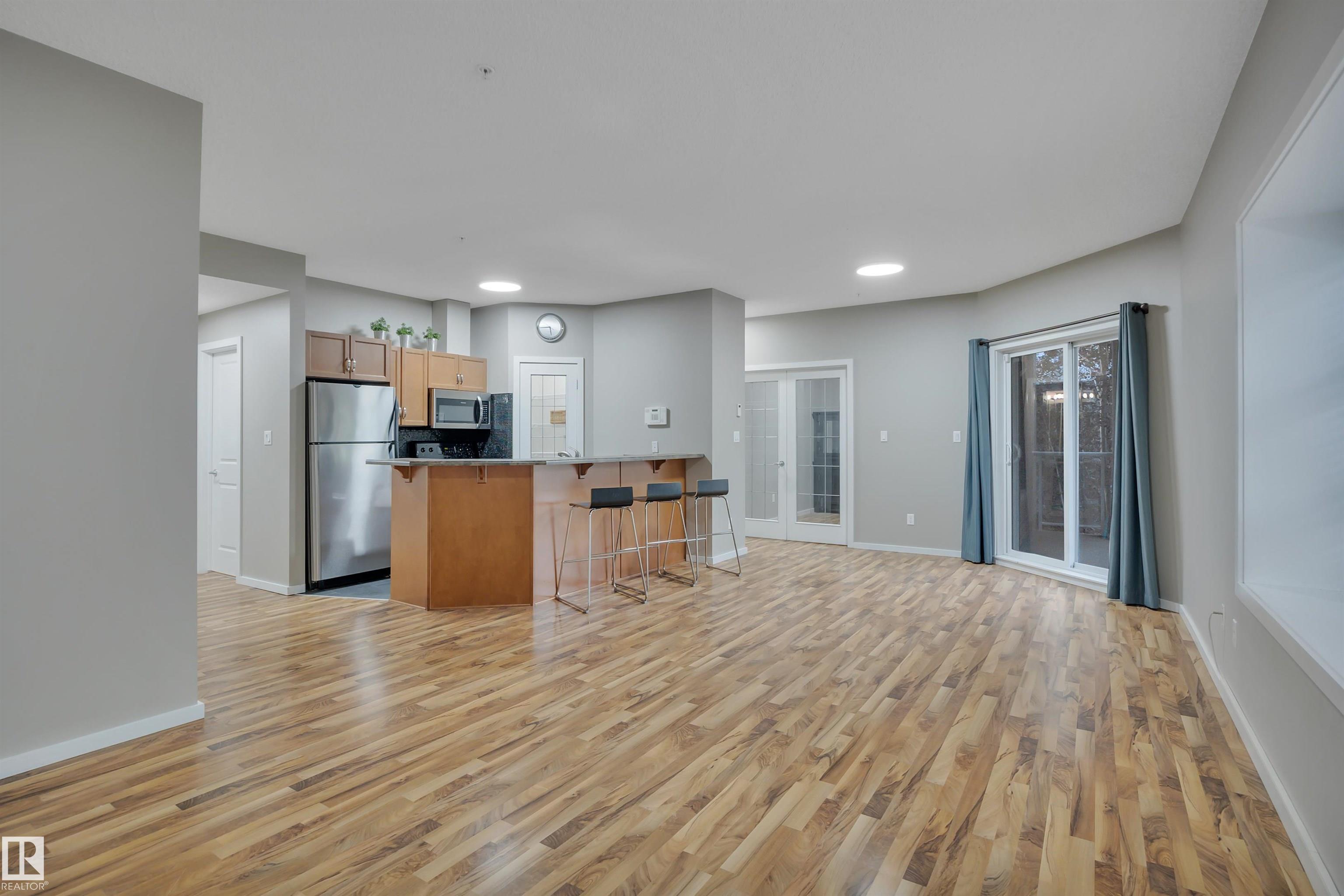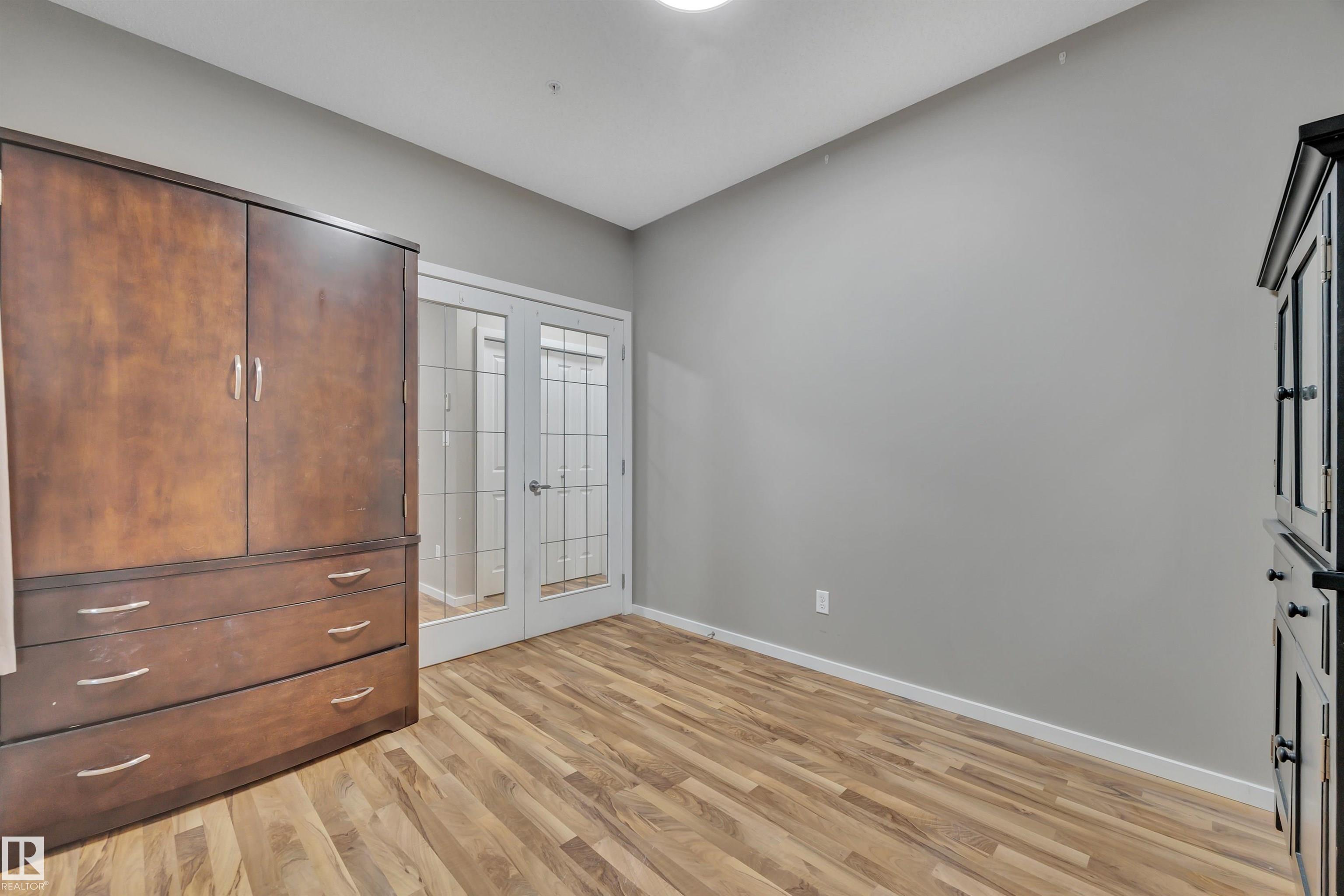 Gorgeous renovated 2-bedroom*, 2-bath condo with titled heated underground parking on a quiet, tree-lined street. Freshly painted with new LED lighting, custom mirrored closet doors, upgraded faucets, and modern hardware throughout. Over 1,000 sqft with 9-ft ceilings, this bright unit is filled with natural light from large windows. The kitchen features stainless steel appliances, slate tile, a walk-in pantry, and a raised eating bar. The living room is centrally located, with the primary suite and 4-pc ensuite on one side and a den with French doors (includes armoire, used as a bedroom) on the other for added privacy. Slate tile in kitchen, laundry, and baths; laminate in living, dining, and bedrooms; plus in-floor heating throughout. Enjoy elegant downtown living close to all amenities—just 230m to the LRT and minutes to the University.