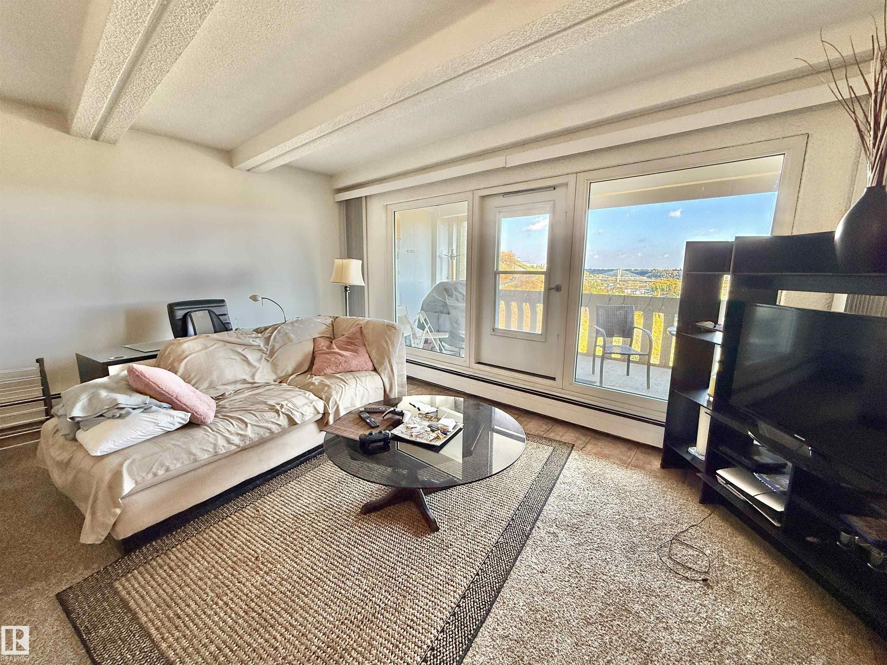 STYLISH ONE-BEDROOM CORNER UNIT WITH RIVER VALLEY & DOWNTOWN VIEWS! This desirable corner unit offers an open floor plan with warm tones and ceramic tile throughout. The spacious living area opens to a huge east-facing balcony with sweeping views of the river valley and downtown skyline—perfect for morning coffee or evening relaxation. The well-managed building provides excellent amenities including underground parking, an indoor pool, exercise room, and guest suite. A fantastic opportunity for first-time buyers, down-sizers, or investors, this unit shows beautifully and is move-in ready!