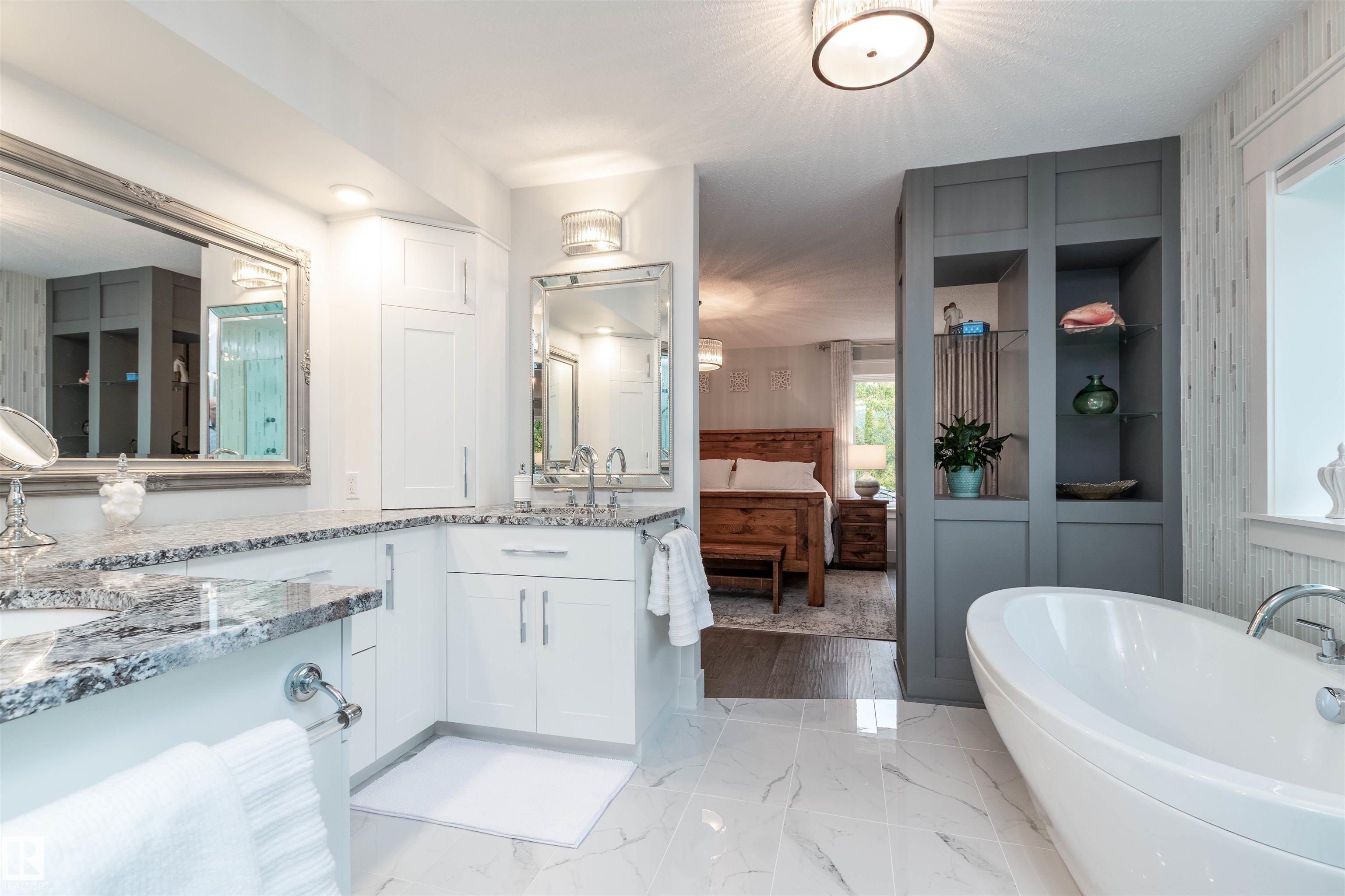 This stunning WALKOUT BUNGALOW is a rare gem in Sherwood Park! Outstanding location, backed by trees, and is in pristine condition. The modern and open design features EXTENSIVE RENOVATIONS and high-end finishes throughout. 3000 square feet of total living space! You’ll find a spacious living room with a built-in wall unit & gleaming hardwood floors. The kitchen is a feast for the eyes! Featuring 2 islands, granite countertops & ceiling-height cabinetry. Dining area with gas fireplace. The Primary Bedroom has wainscoting & a LUXURIOUS 5 piece ensuite with soaking tub. Convenient main floor laundry room & a beautiful 2-piece powder room. The walkout basement offers a large family room, wet bar, 3 bedrooms, gym area, gorgeous bathroom & a utility room. Central A/C a double-attached garage, and a beautiful stone exterior. Private backyard with impressive landscaping, a beautiful front & back deck, and an awesome HEATED SHOP complete this stunning property! This amazing home is a MUST SEE in Sherwood Park!