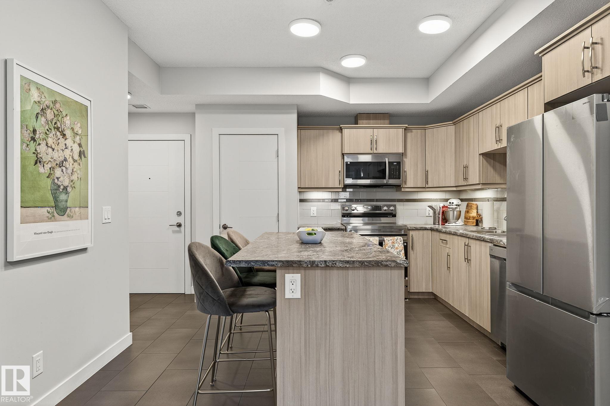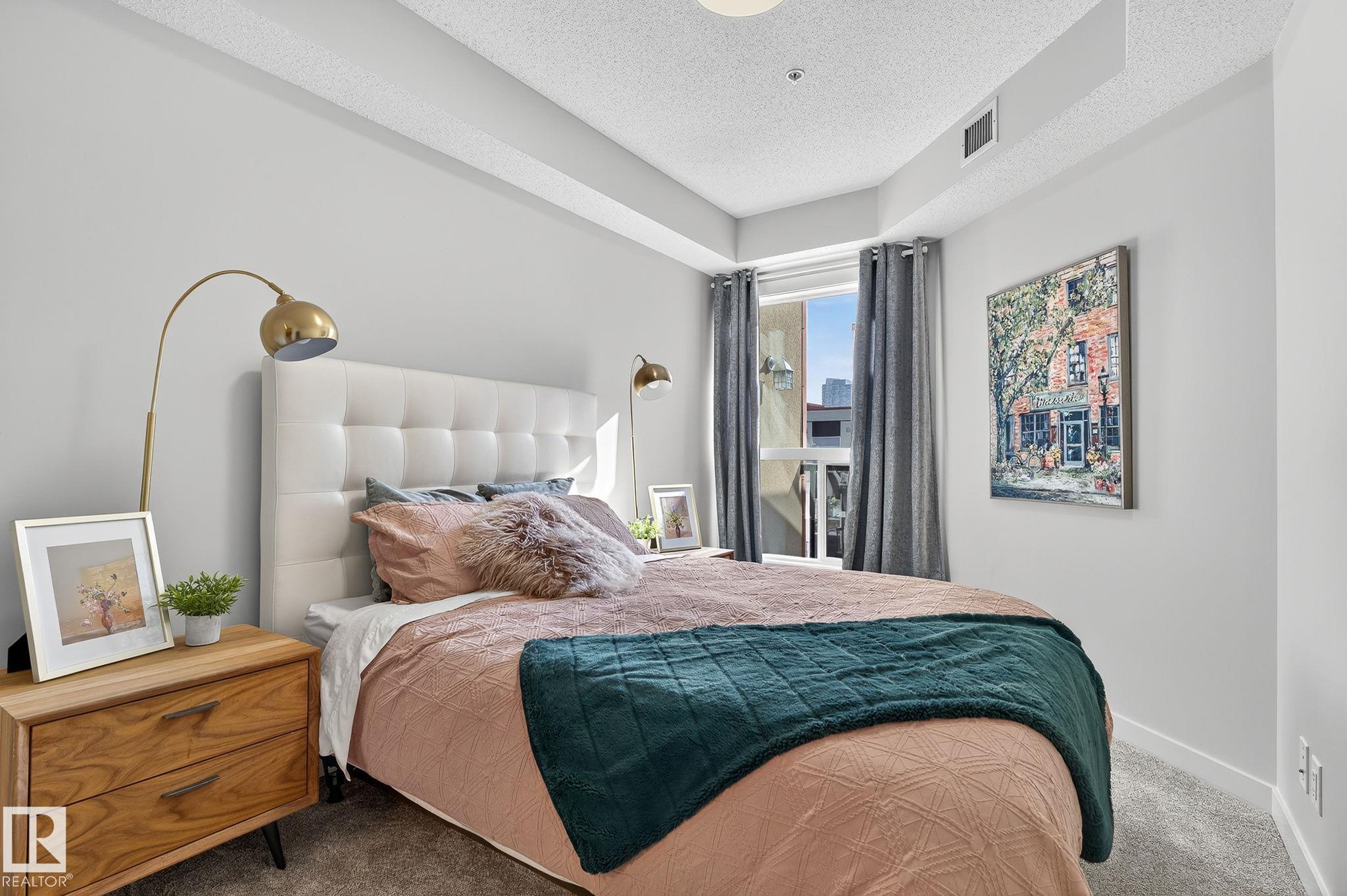 Top floor executive condo that is nestled between the vibrant High Street & the trendy Brewery District! Two bedrooms with two full baths. A hop, skip and jump or bike to your favourite coffee shops, restaurants, groceries, gym etc. 1 block from new LRT. You'd feel right at home with the great layout & relaxing ambience. New renos including contemporary paint, elegant large dark vinyl plank flooring & new carpet in master bedroom. The chef's kitchen has all new appliances except the dishwasher, beautiful tile backsplash, ample cabinets & a huge working island. Spacious living room is next to the bright & cheery dining area which has door onto the private balcony. Cozy master retreat has Pax closet organizer & a nice 4 piece ensuite. Well positioned second bedroom/den with 2 wardrobes is next to the main bath & laundry/storage. There's a stunning roof terrace with a gorgeous city view for you & your guest to enjoy year round. HVAC & A/C & gas hookup for BBQ. Secured heat underground parking stall. A 10!