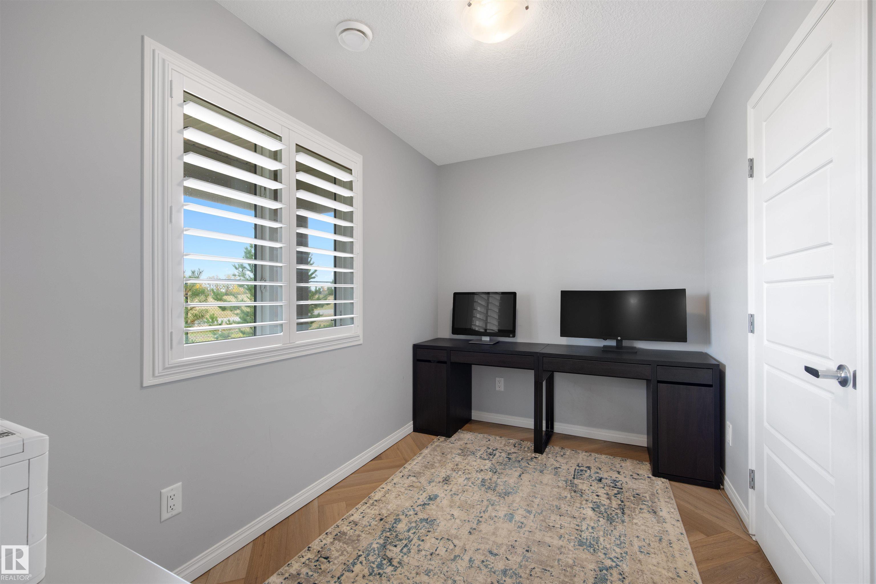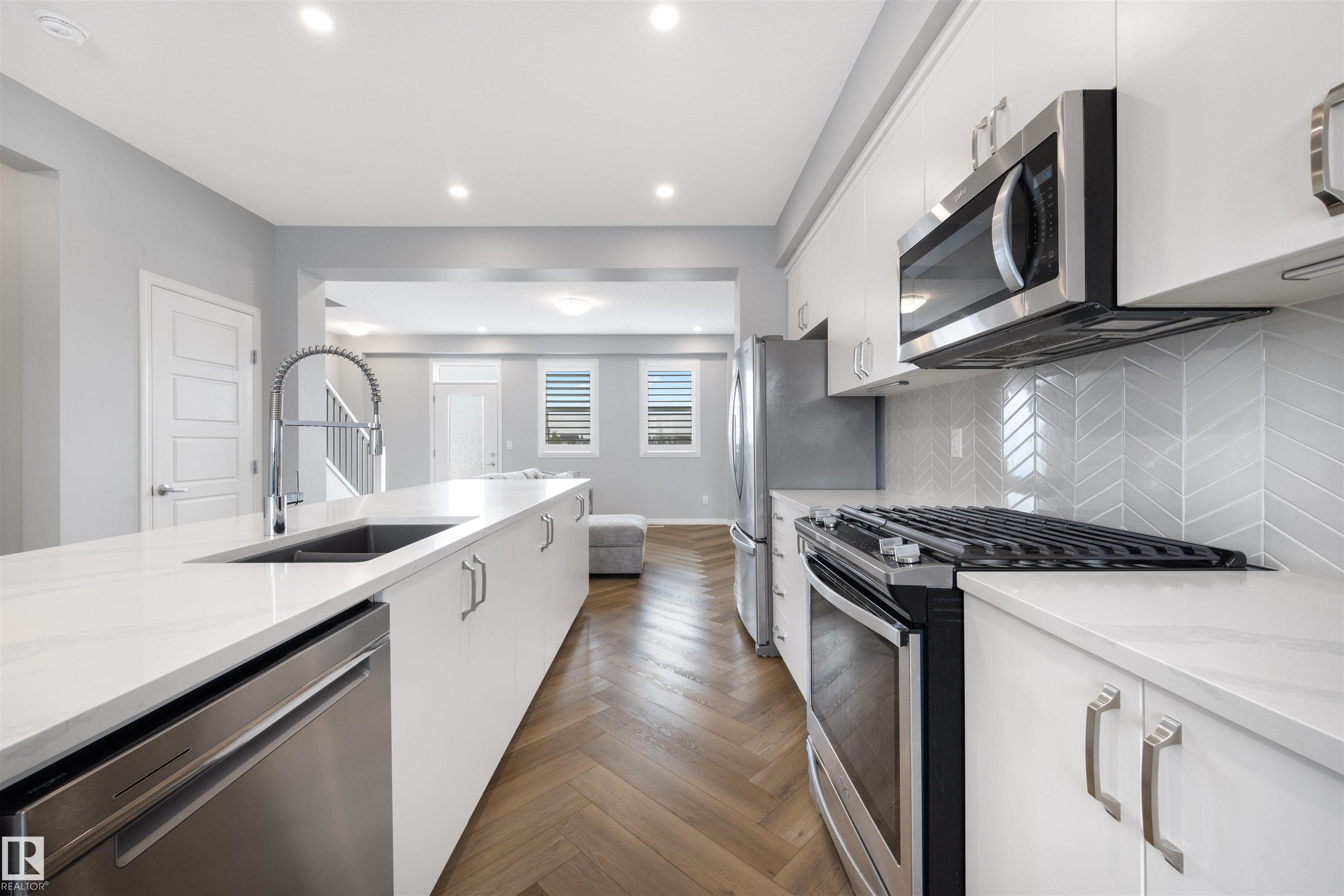 Better than new and thoughtfully designed for modern family living, this immaculate Walker townhome with central air-conditioning blends style and comfort with ease. A main-floor office with direct entry from the double attached garage makes working from home effortless. The heart of the home is a crisp white kitchen with stone countertops throughout, a generous island with seating, stainless-steel appliance package, and sleek pot lighting. Herringbone wood floors run seamlessly through the living spaces, while ceramic tile in the baths and the absence of carpet lend a clean, timeless appeal. The living area, warmed by an electric fireplace, opens to a deck with a gas BBQ line and serene views of the soccer field and park beyond. Upstairs, three bedrooms and two-and-a-half baths include a primary suite with walk-in closet and three-piece ensuite. Meticulously maintained and move-in ready, this home makes everyday living feel elevated.