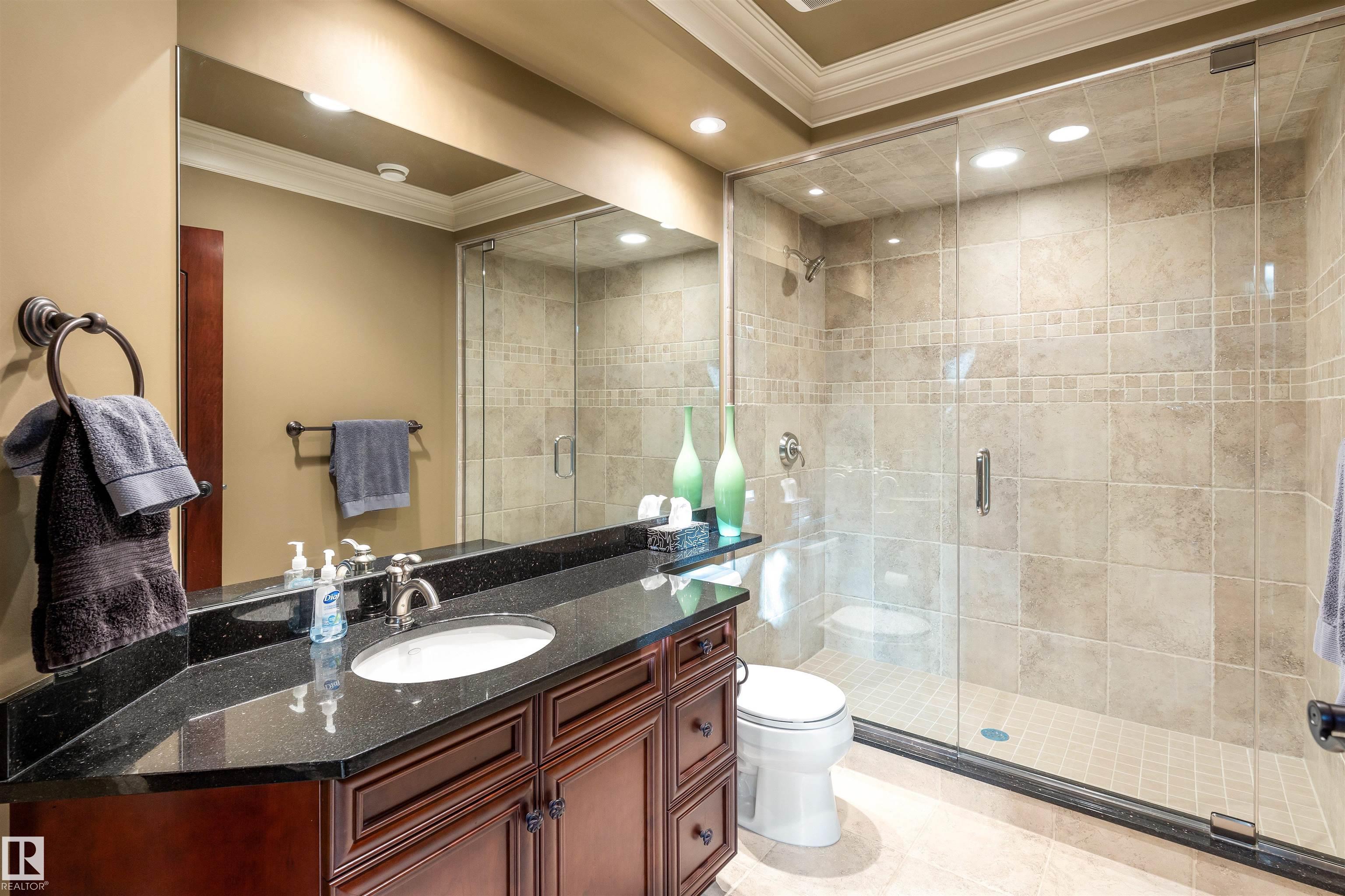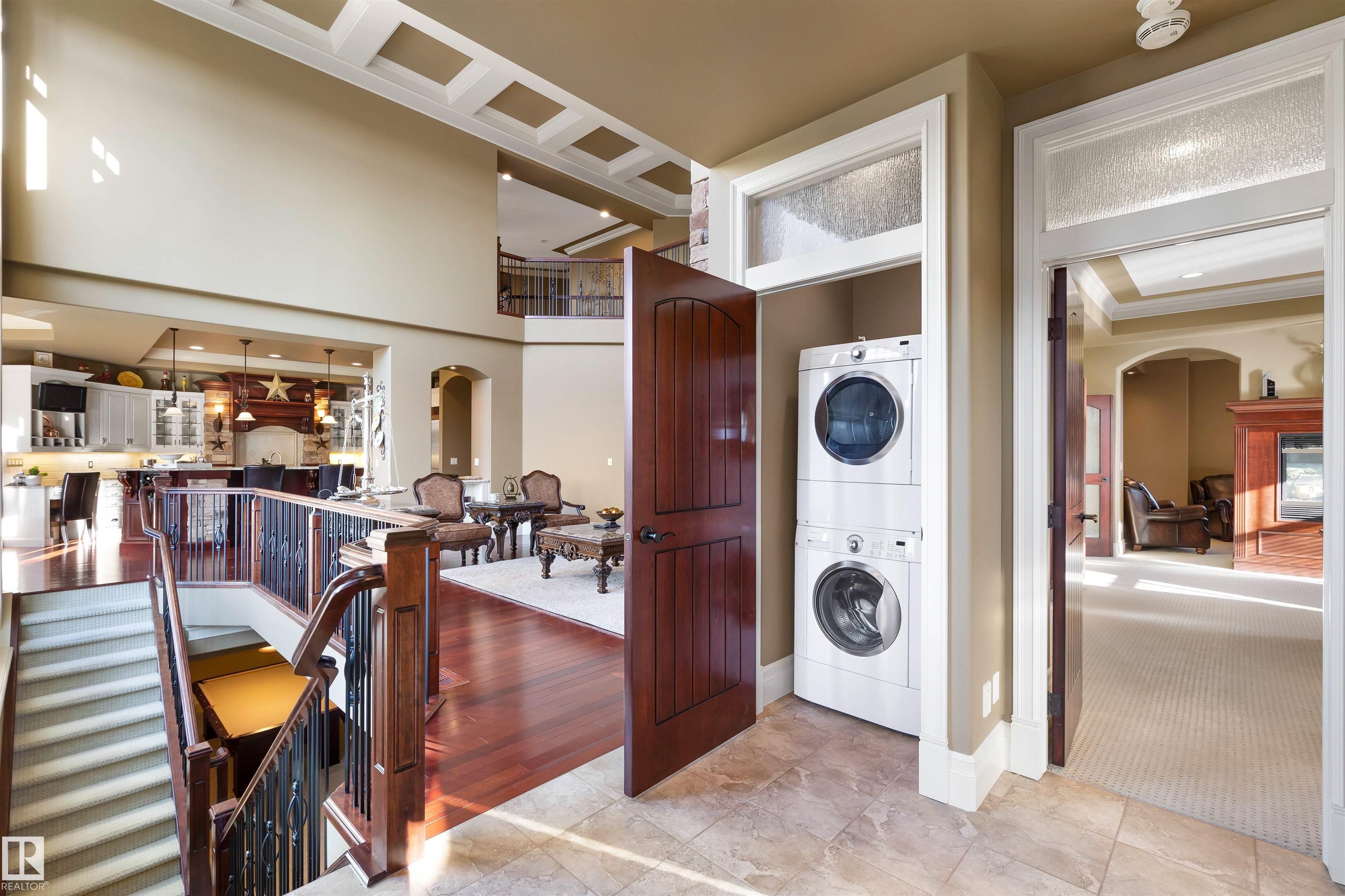 Luxury in prestigious Riverstone Pointe! This 6173 sqft 2 storey awaits a new owner. The living room is stunning w/ a 2 storey stone gas f/p, coffered ceiling, HARDWOOD flooring & windows overlooking the yard. The kitchen has cabinetry w/ crown molding, under cabinet lighting, granite counters, tile backsplash & an eating bar island. The dining room is spacious- perfect for hosting. The office has large windows & a 2 sided f/p leading into the LIBRARY. Completing the main floor is a sun room, 2pce bath & 3pce bath. The 2nd floor has a family room w/ built in shelving, 4 bedrooms (2 w/ their own ensuite), a 6pce jack & jill bathroom & a laundry room. The basement feat. a spacious rec room w/ gas f/p & built ins on either side, wet bar w/ eating bar island & WINE ROOM. The theatre room is just off the wet bar. A gym, 5th bedroom & 3pce bath complete the basement. Enjoy summer in the beautiful yard w/ a deck, hot tub, stone patio, SWIMMING POOL & firepit. A HEATED attached 10 CAR GARAGE completes this home!