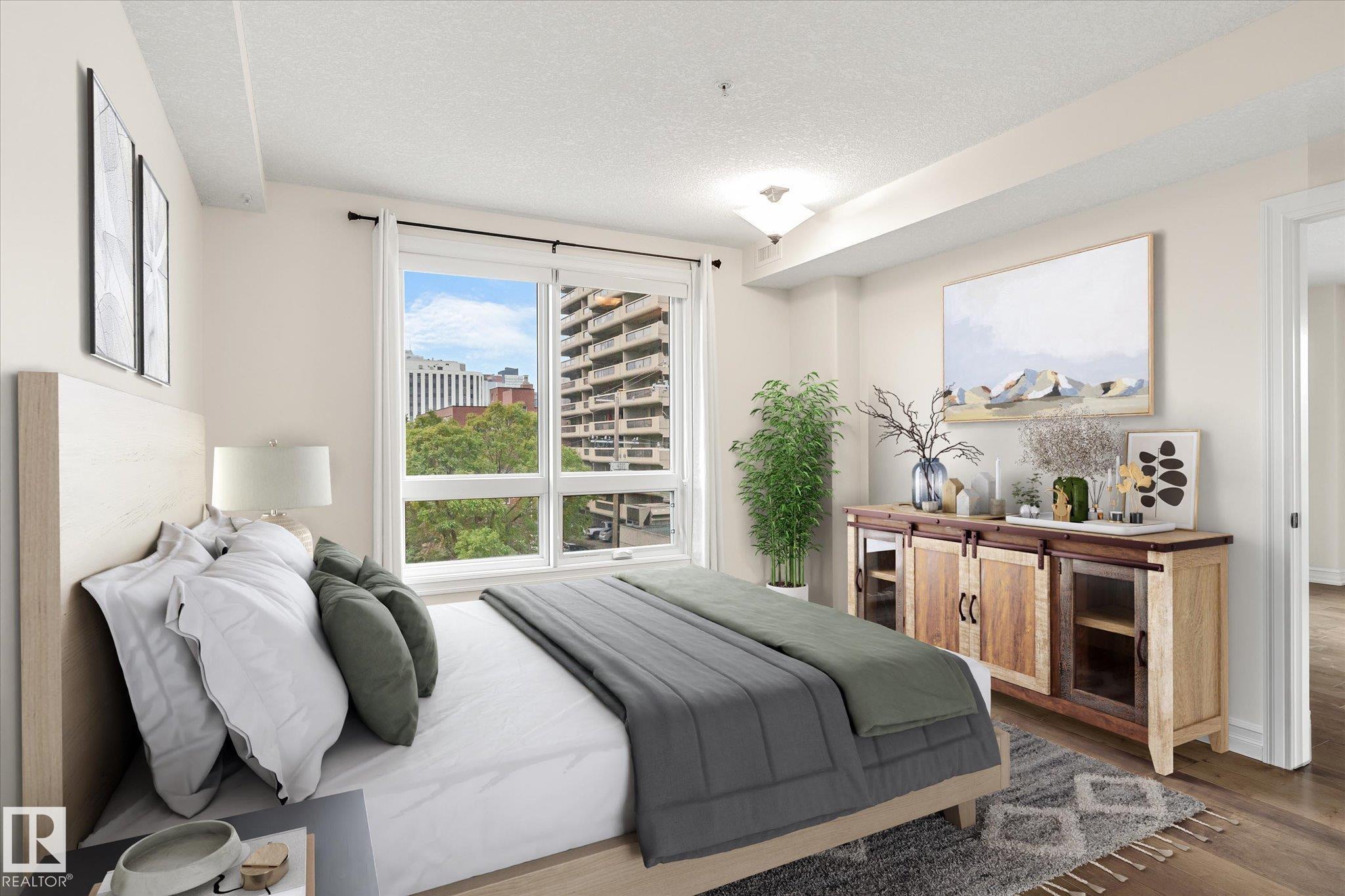 Experience refined urban living in this 3rd floor CORNER UNIT at the spectacular MERIDIAN PLAZA. Designed for entertaining, the open-concept layout showcases hardwood floors, 9' ceilings, a cozy gas fireplace, and an elegant living and dining area bathed in NATURAL LIGHT from south-facing windows & patio doors to the balcony. The well-appointed kitchen features granite countertops, stainless steel appliances, and a stylish breakfast bar. The primary suite offers a spa-inspired 5pc ensuite with dual vanities, soaker tub, glass shower, and a spacious walk-in closet. A second generous bedroom and full bath are privately situated on the opposite side of the suite. Additional highlights include in-suite laundry with storage, TITLED UNDERGOUND PARKING, and access to PREMIUM AMENITIES: a Mediterranean-style atrium, fitness centre, owners' lounge, event space with a full kitchen, & bike storage. Just one block to Jasper Ave and steps from restaurants, trails, shopping conveniences, & the Ice District.