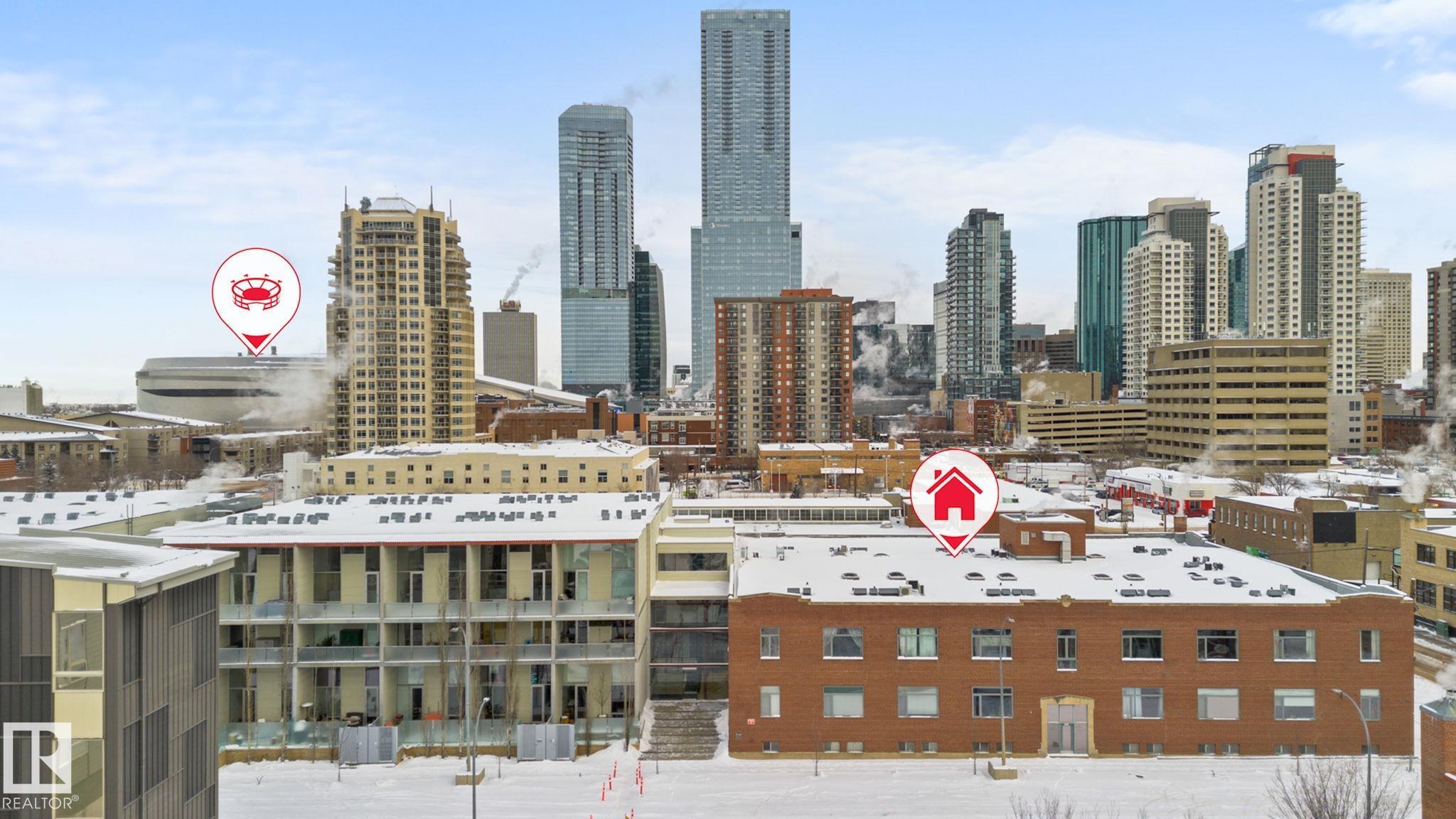 Historic Downtown Loft in the Iconic John Deere Warehouse! Experience the perfect mix of industrial charm and modern comfort with soaring 13' ceilings, original wood beams, a feature brick wall, and large west-facing window. A rare opening skylight with blackout blind fills the space with natural light and fresh air. The open-concept kitchen includes a large island for entertaining, while the raised bedroom platform offers smart under-bed storage. Enjoy laminate and ceramic tile flooring throughout. Prime Location – just 200m to MacEwan University & NorQuest College, and 600m to Rogers Place, grocery stores, and restaurants. Steps to the LRT and future 1.81-hectare Warehouse Park. Features include in-suite laundry, secure virtual keyless entry, underground bike storage, and on-site property maintenance. Move-in ready & Airbnb-friendly—a must see for investors, students, and professionals!